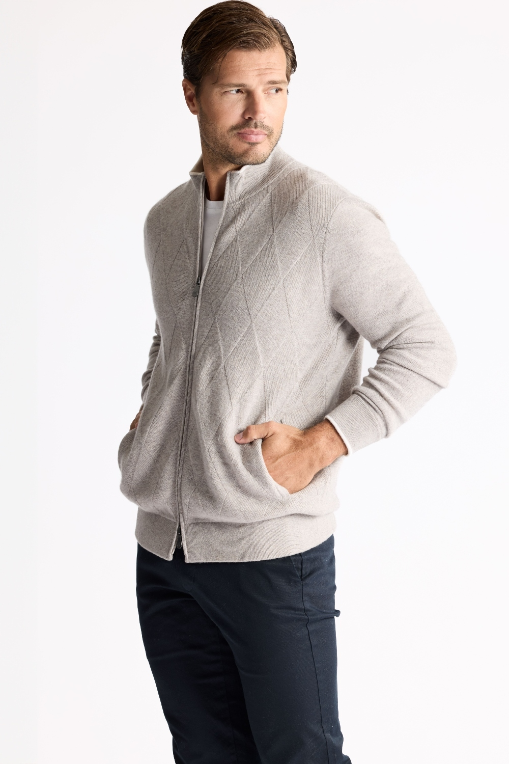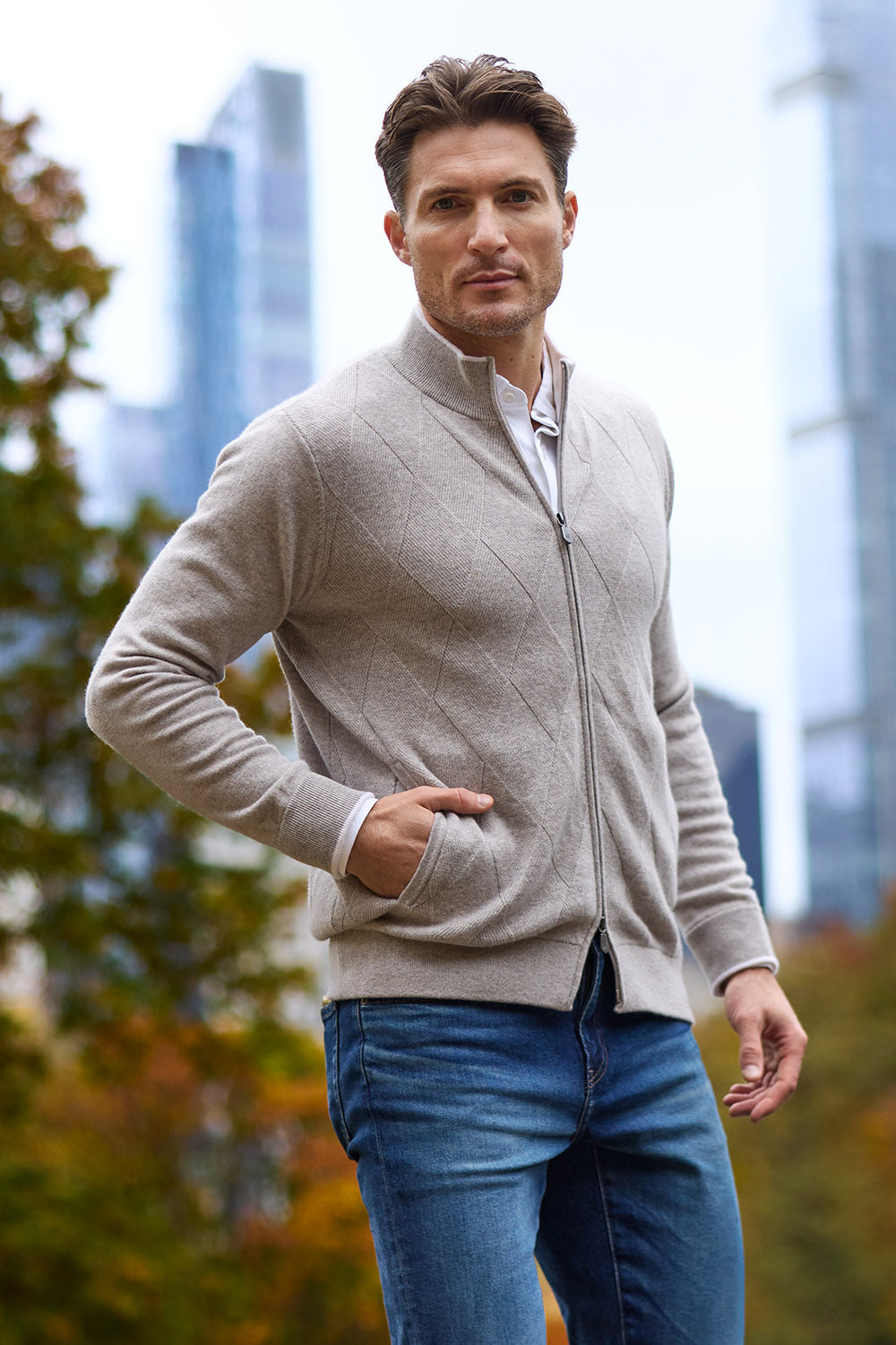 The Gunner is our front zip jacket made from the softest cashmere blend. Showcasing a rich jacquard diamond pattern and elegant side pockets, its effortless design allows for easy dressing up or down to match your mood. Offered in the fashionable cloud color, The Gunner pairs well with any outfit.