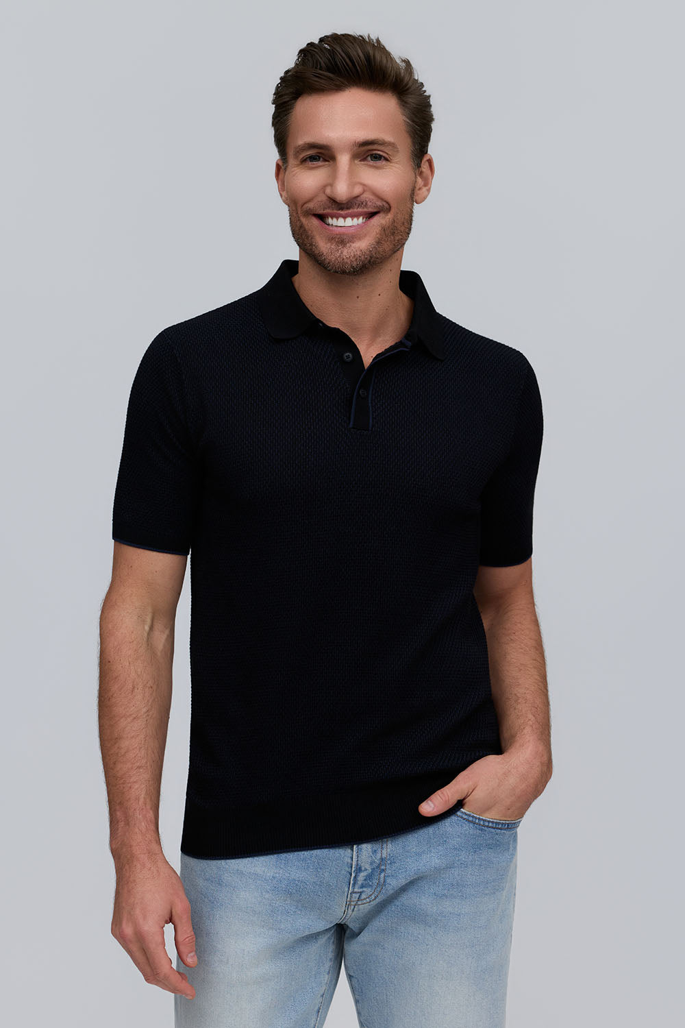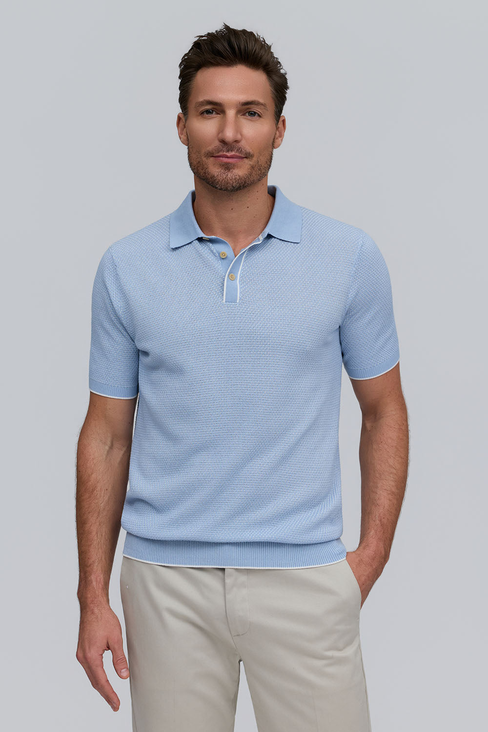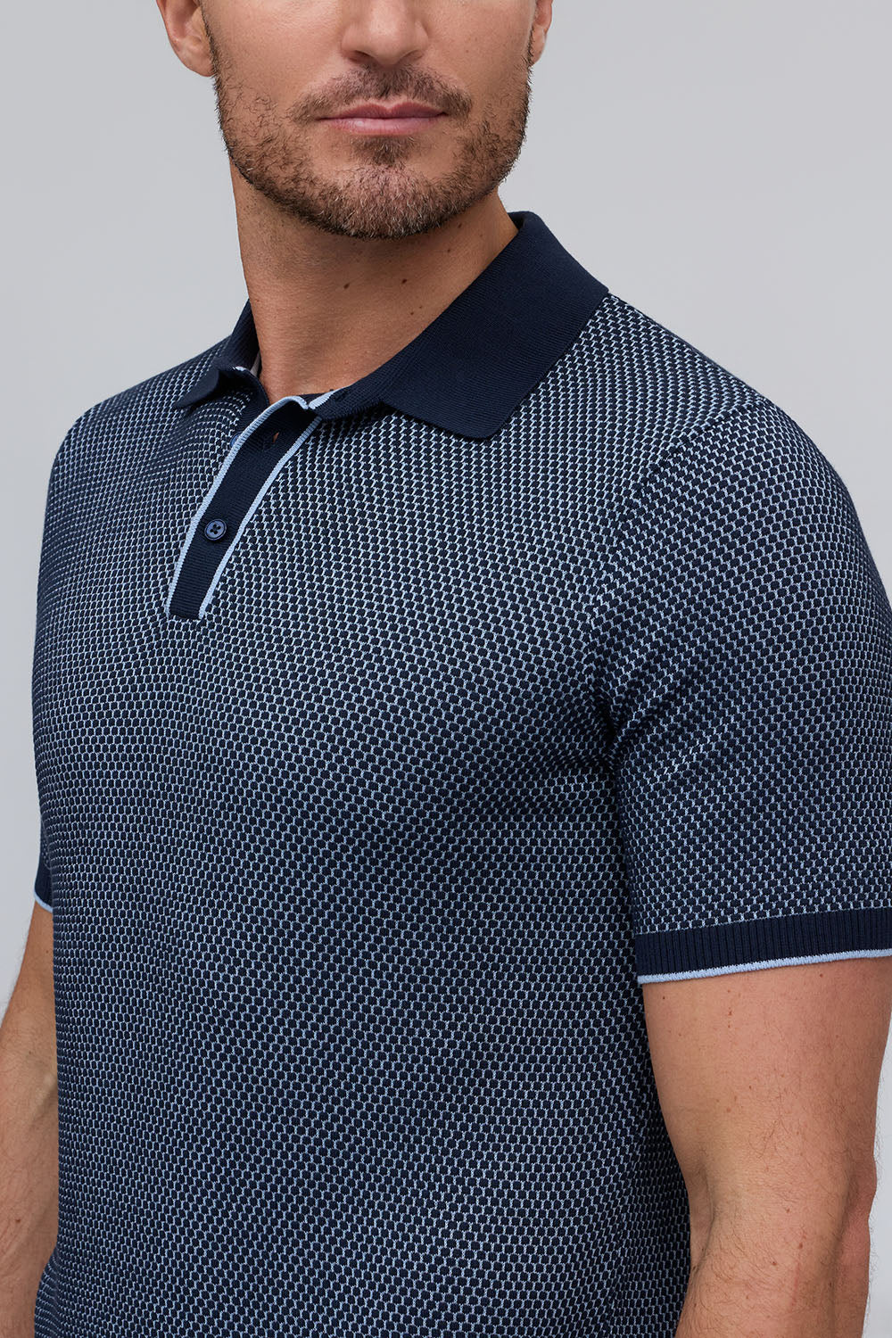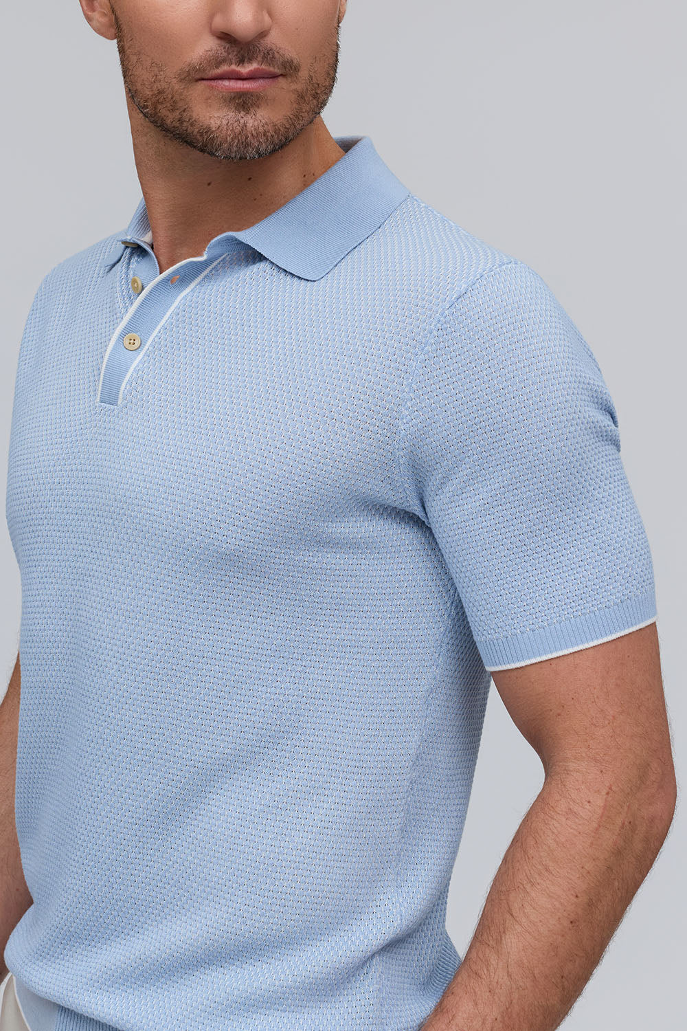 The Horizon is a lightweight short-sleeve sweater polo, defined by a refined two-tone honeycomb texture. Breathable and versatile, it’s finished with a clean three-button placket for effortless polish.