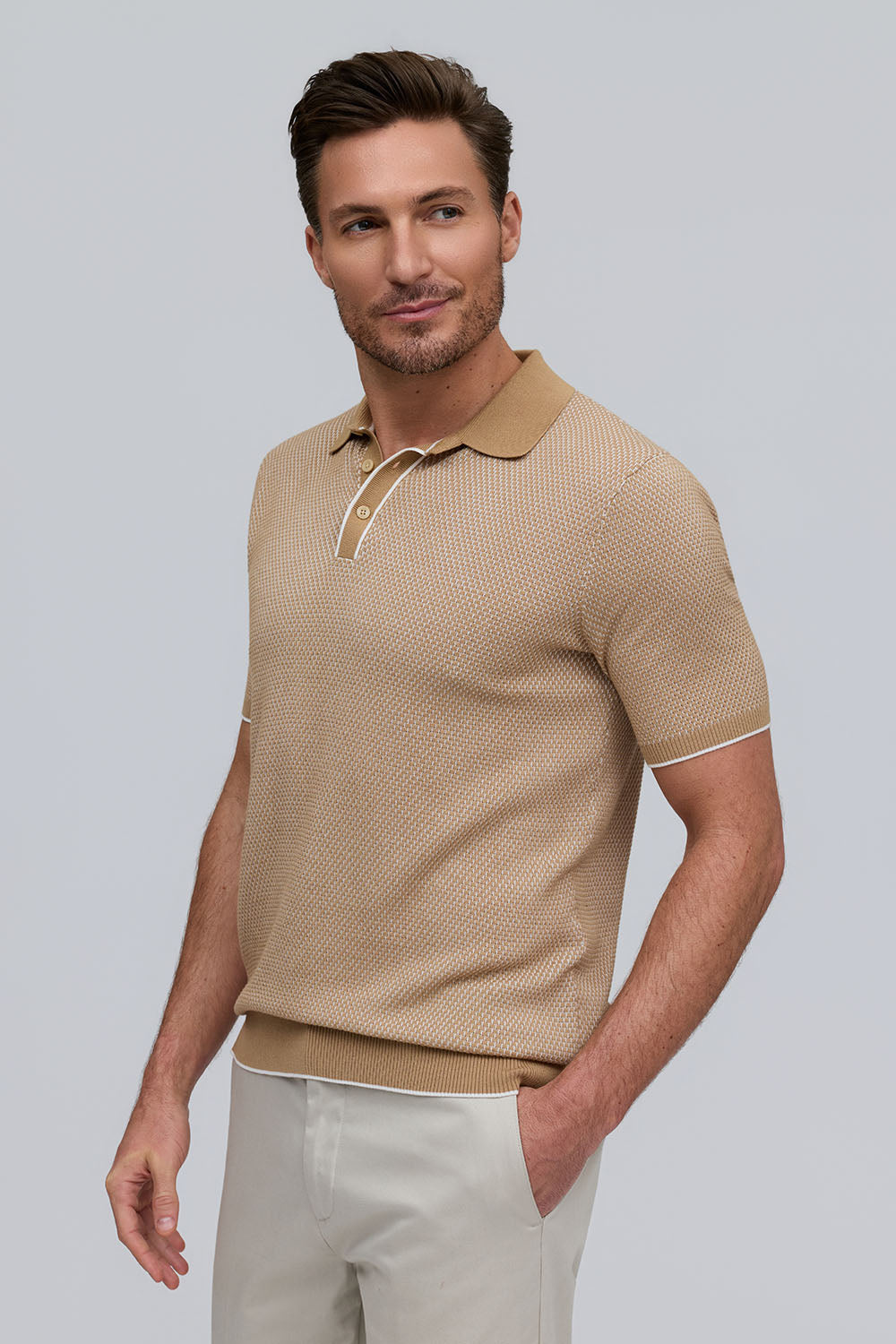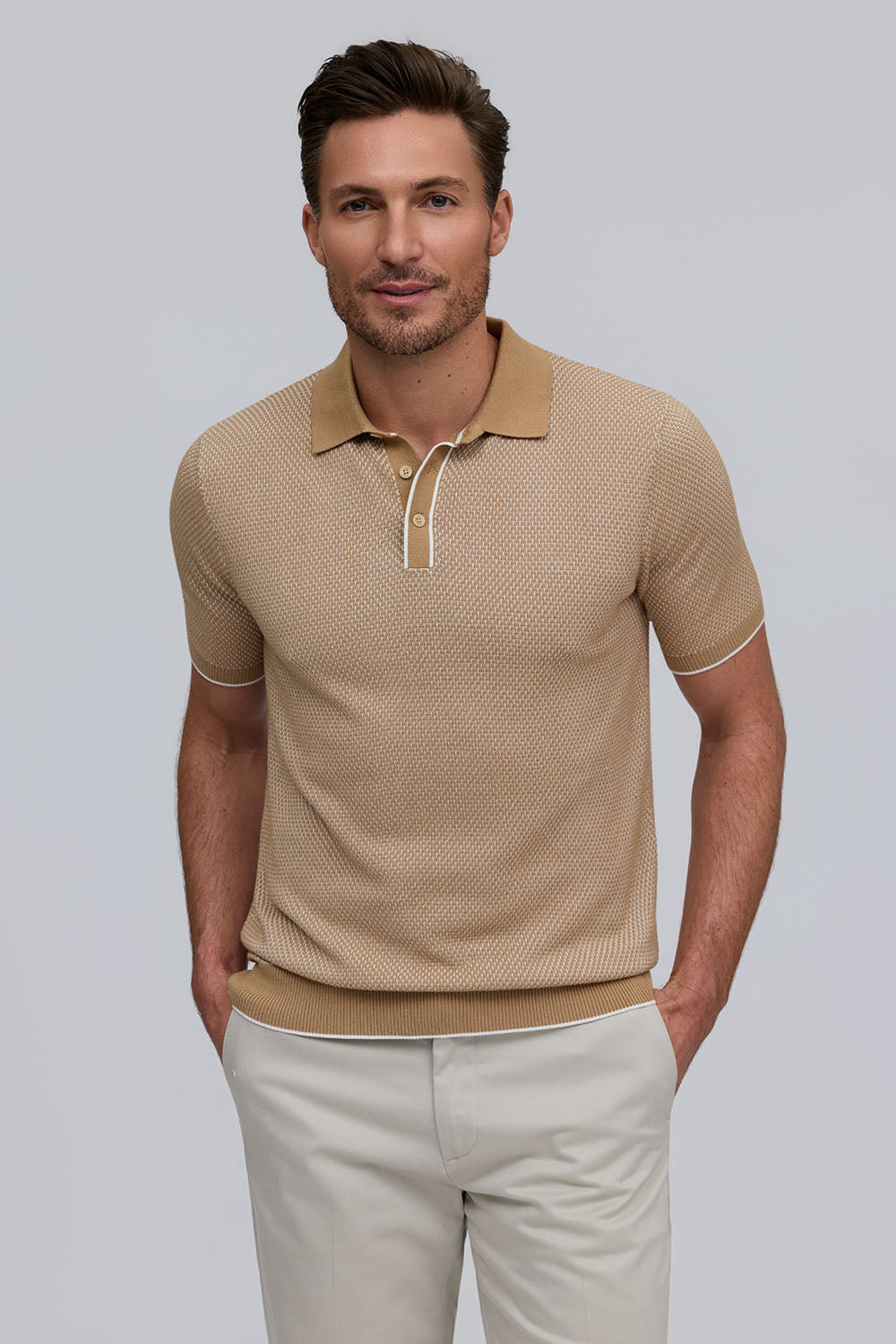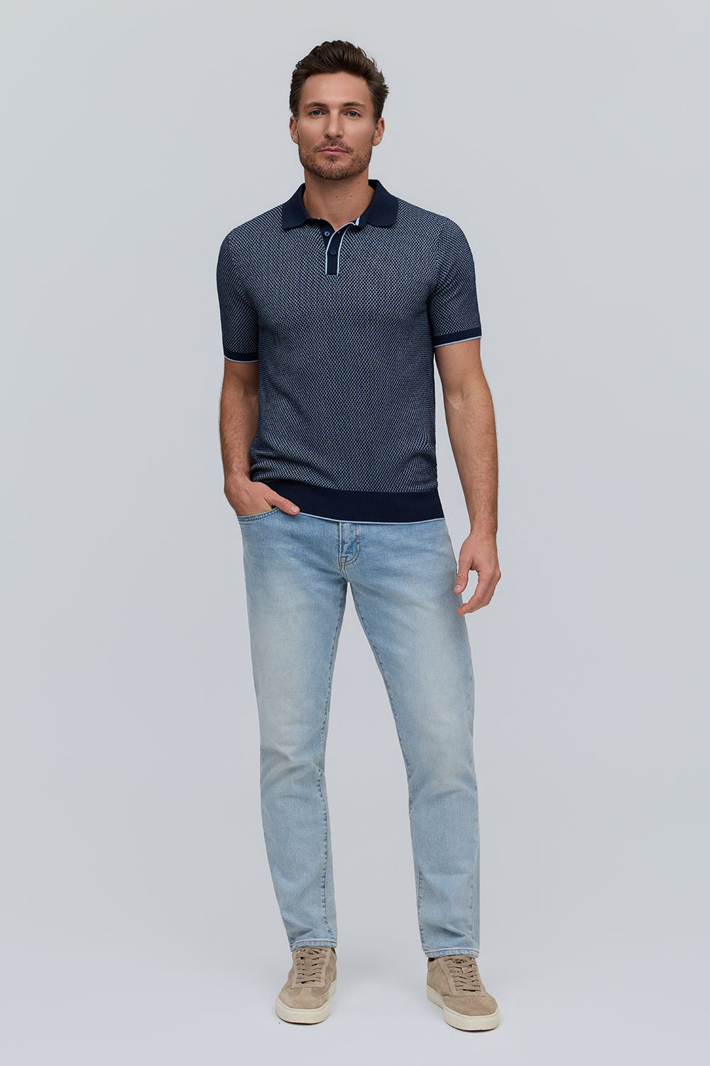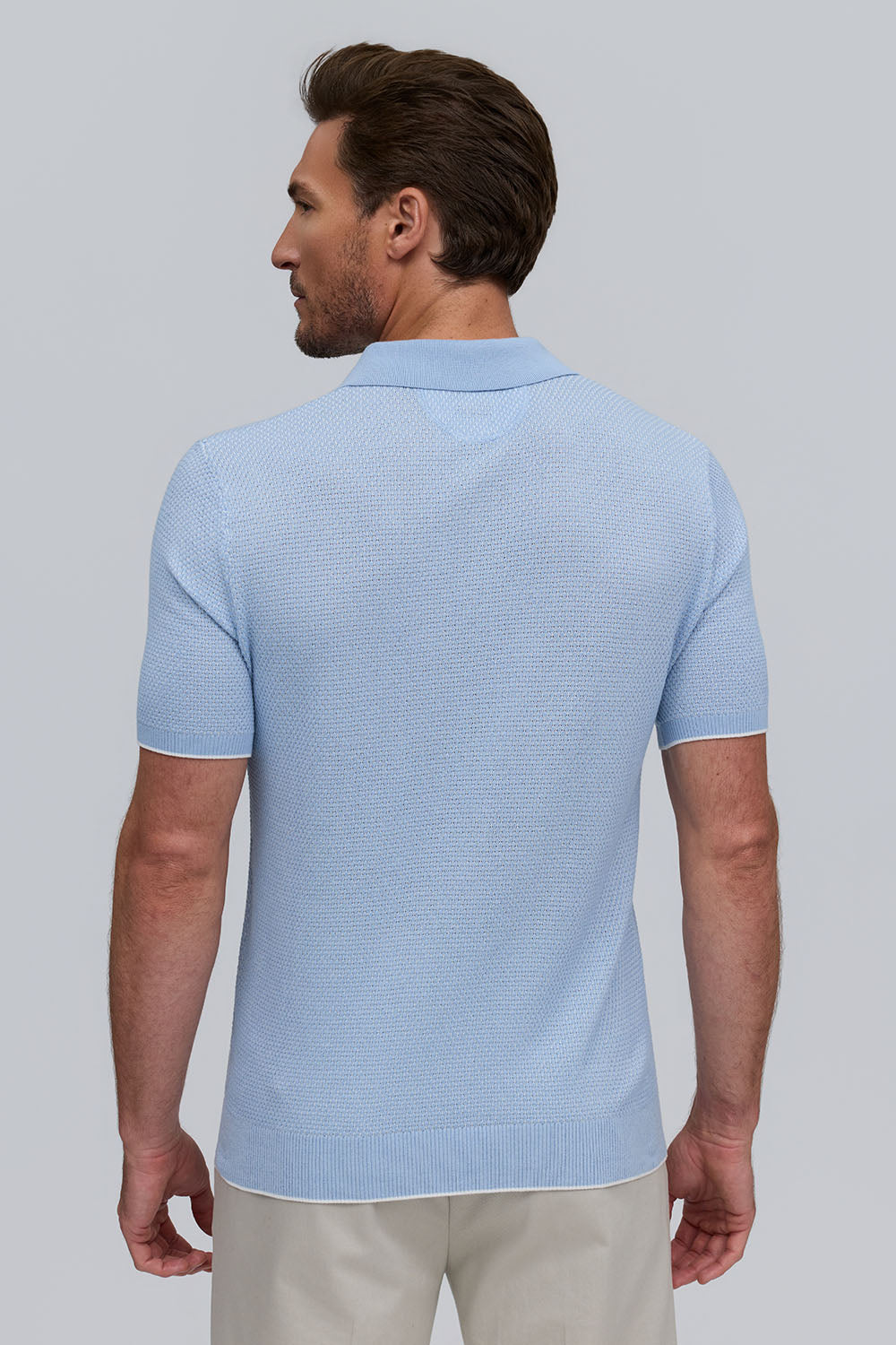 The Horizon is a lightweight short-sleeve sweater polo, defined by a refined two-tone honeycomb texture. Breathable and versatile, it’s finished with a clean three-button placket for effortless polish.