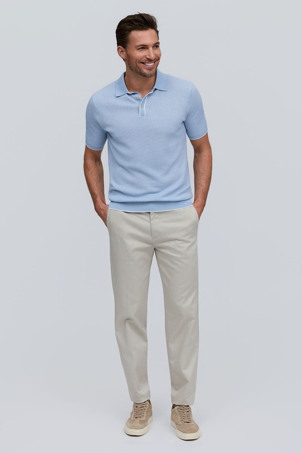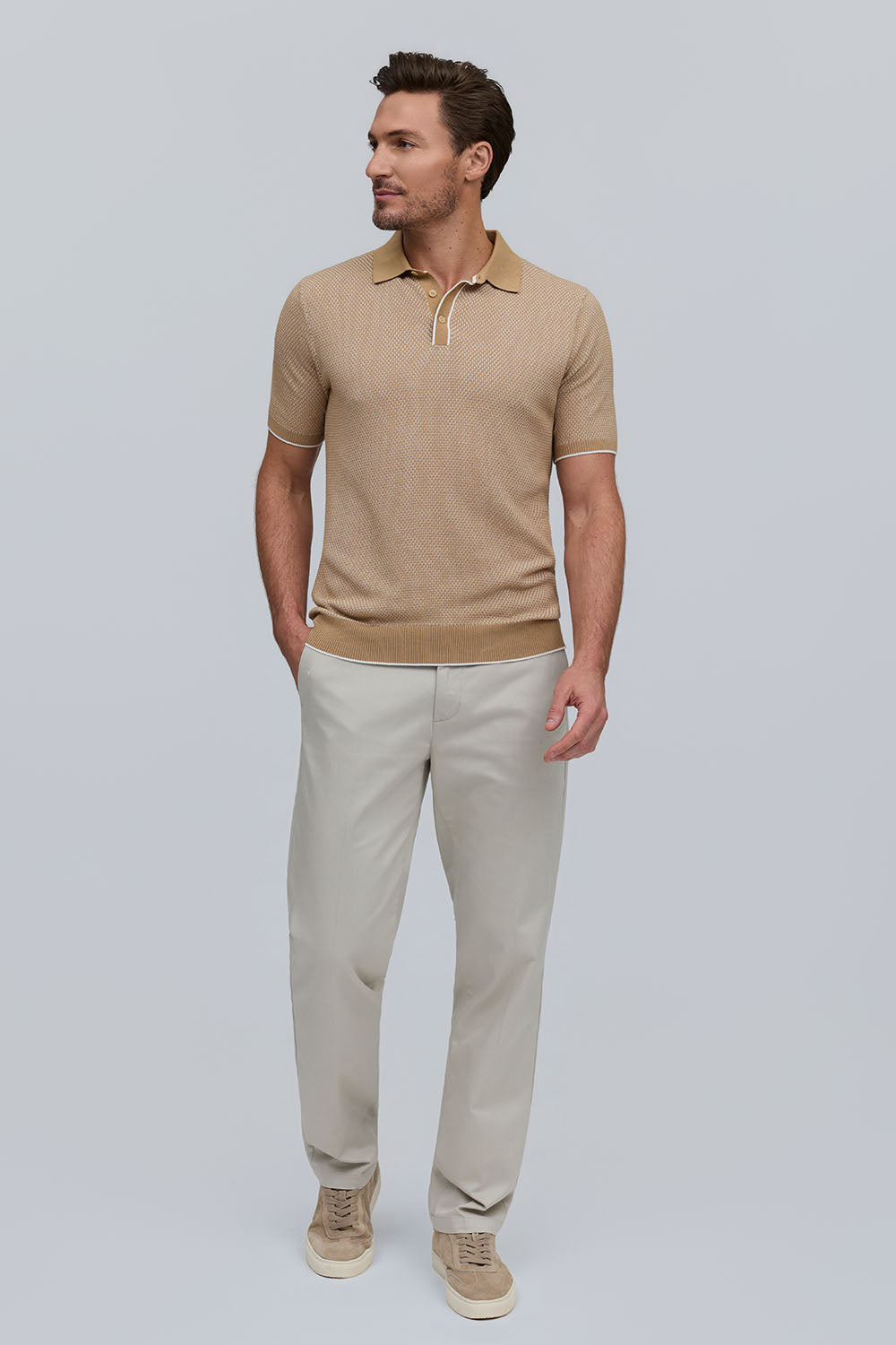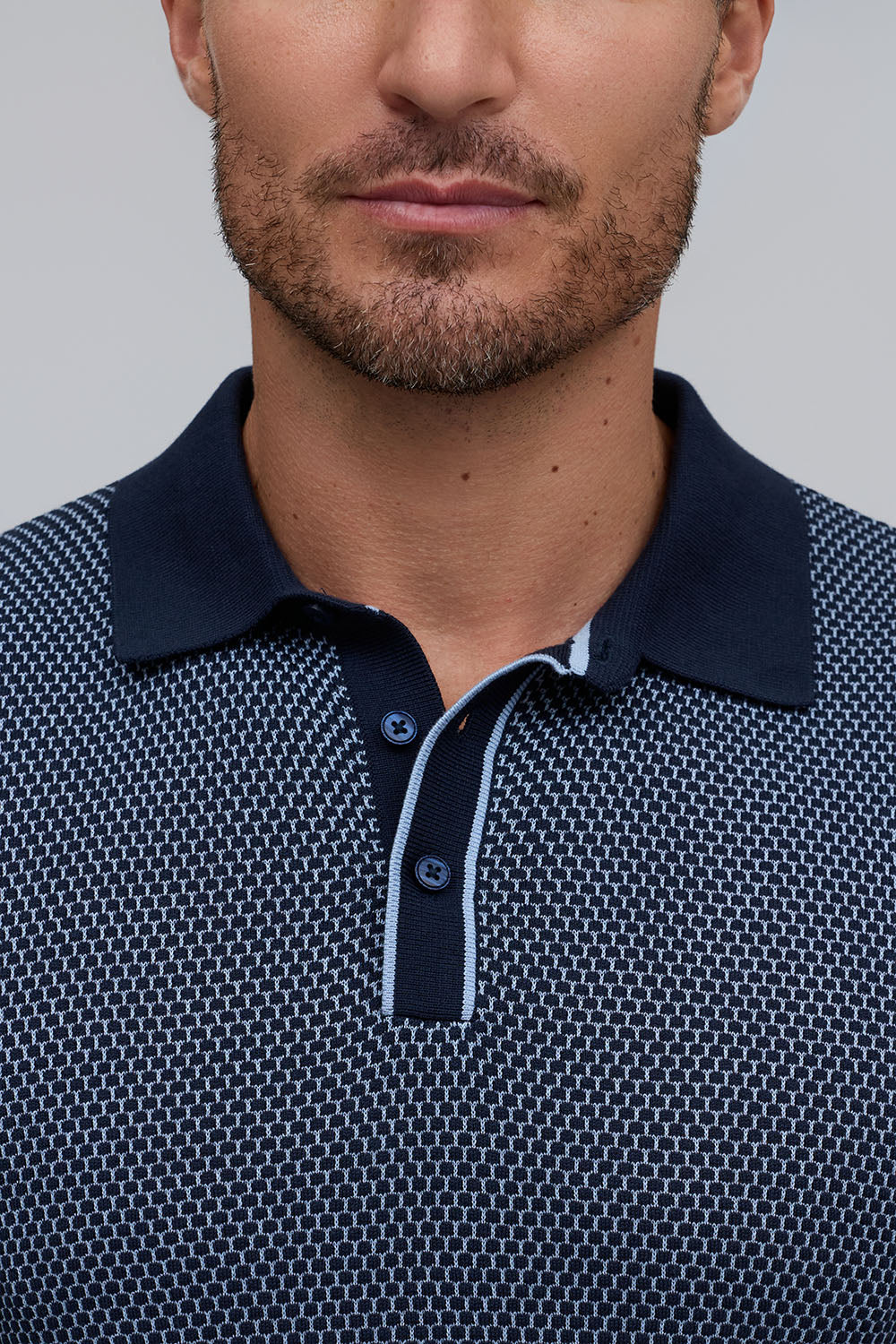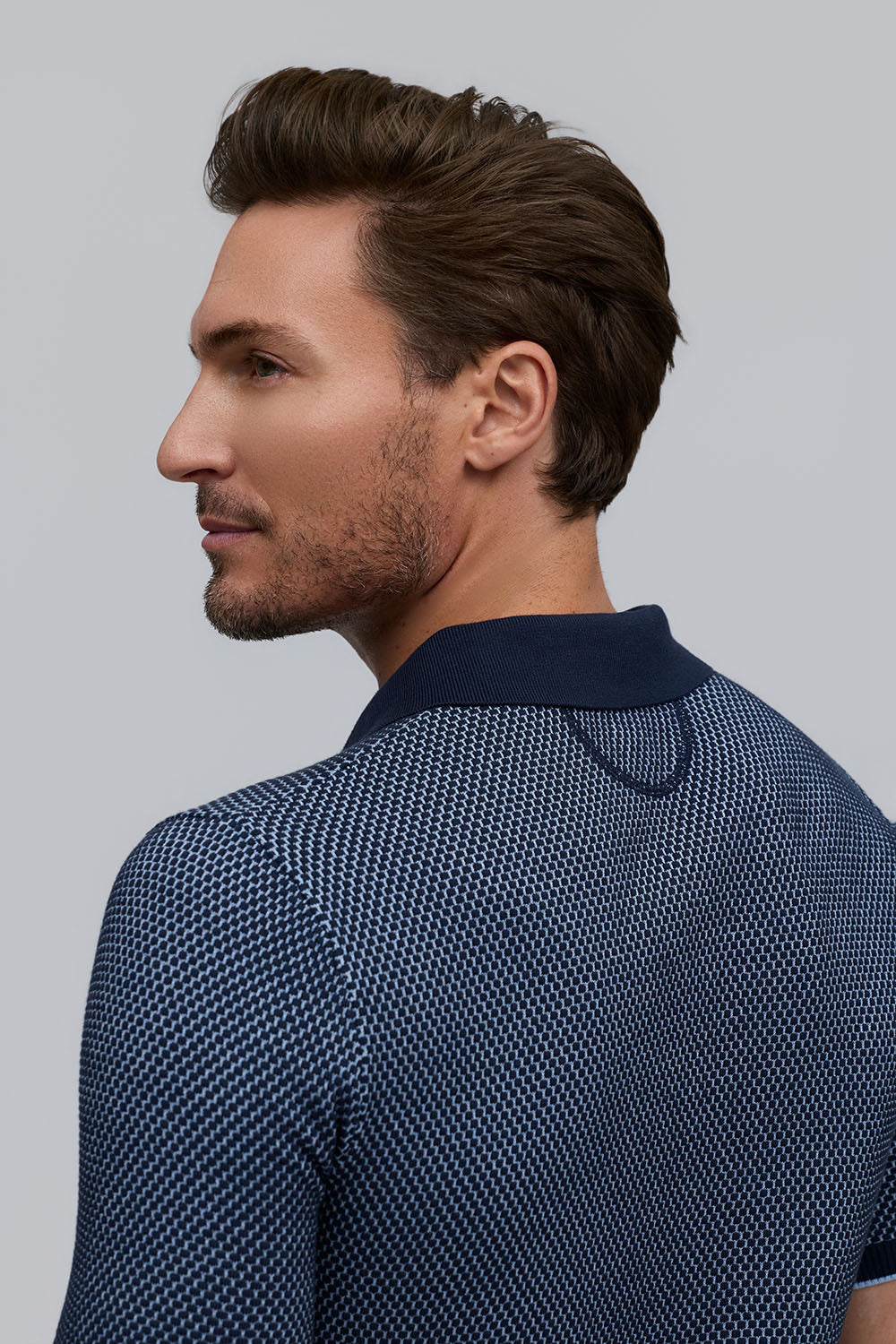 The Horizon is a lightweight short-sleeve sweater polo, defined by a refined two-tone honeycomb texture. Breathable and versatile, it’s finished with a clean three-button placket for effortless polish.