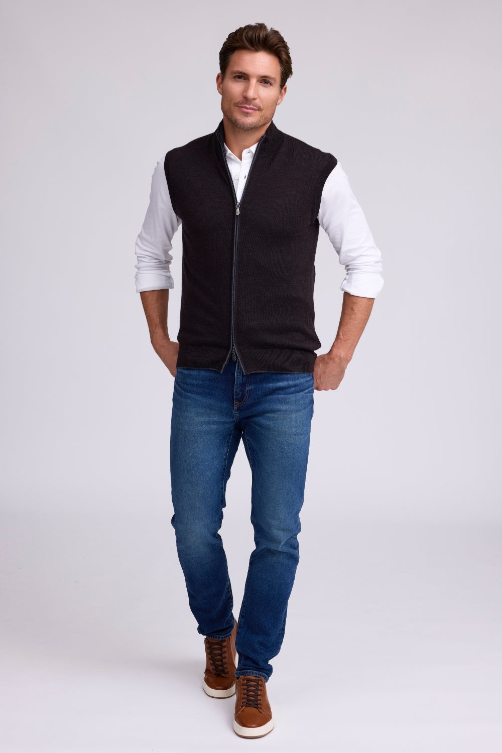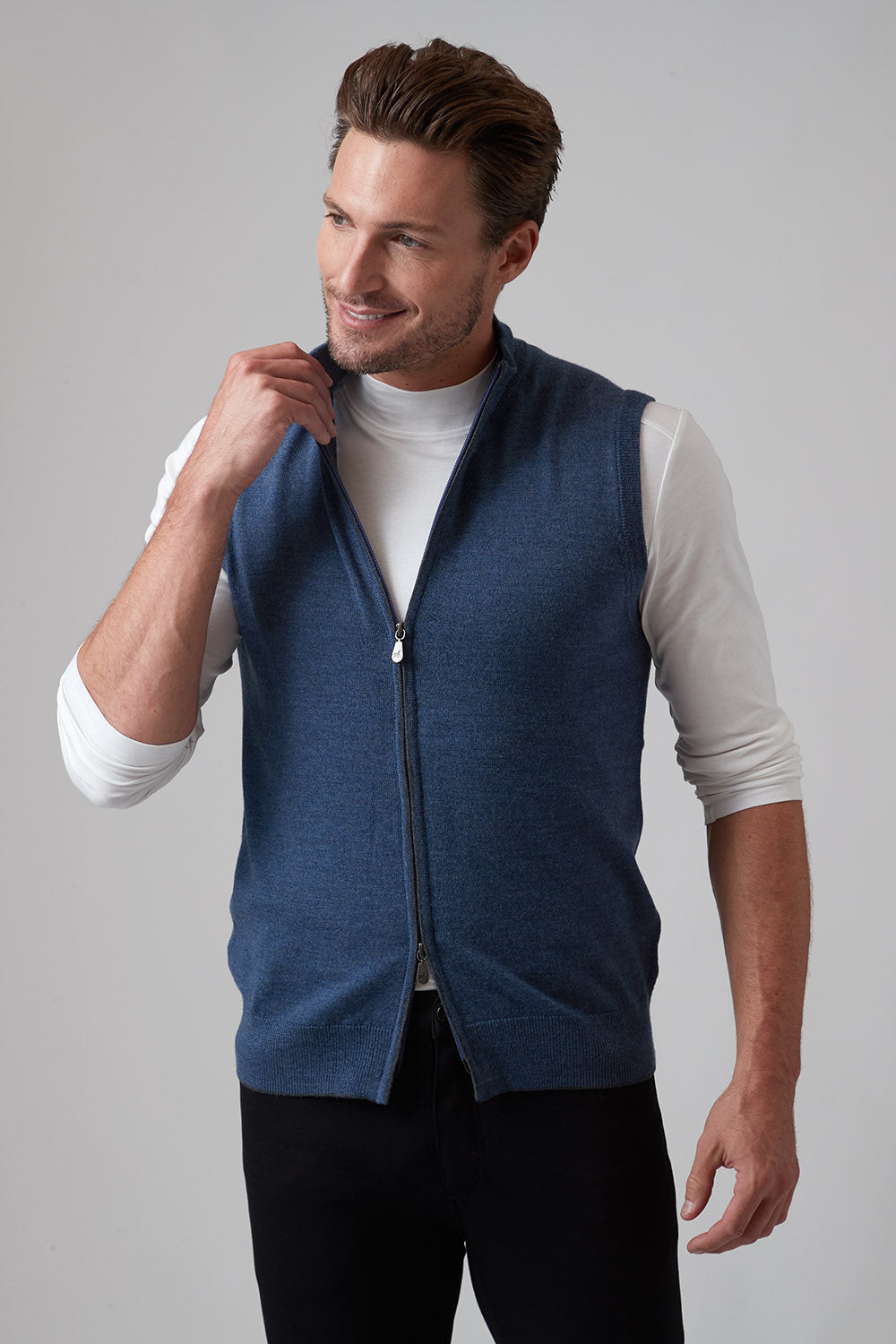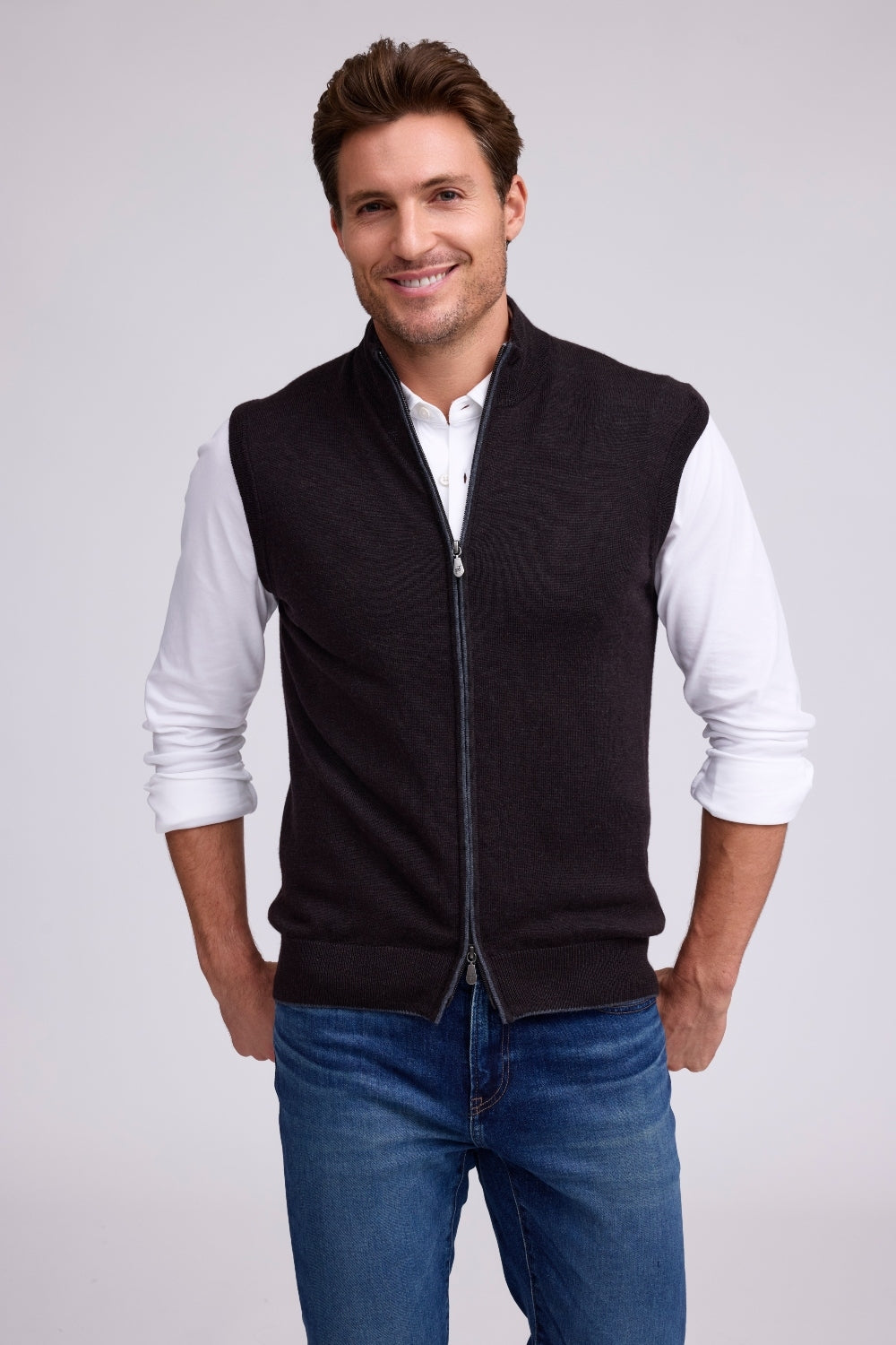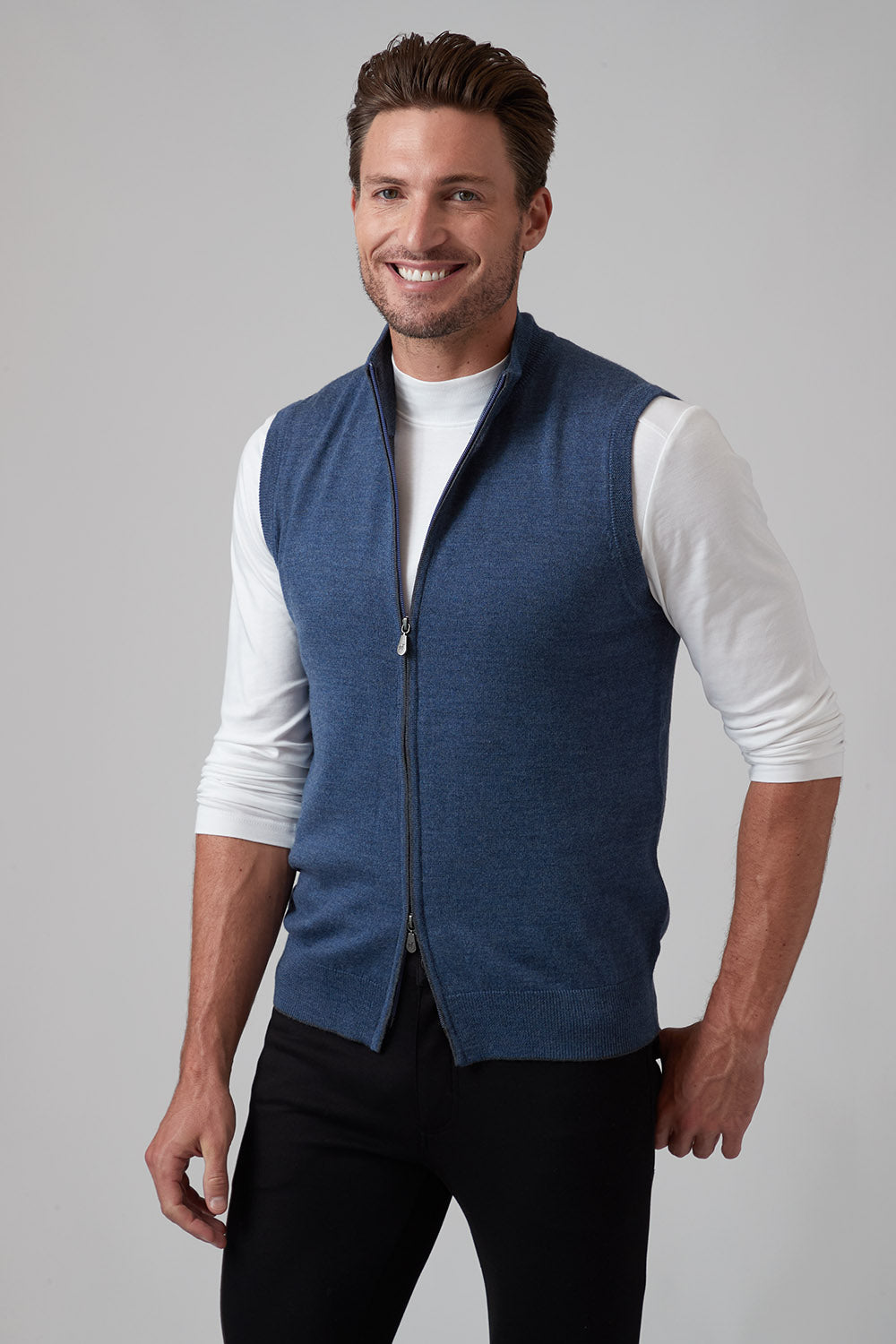 Whether you want to add a little warmth or style, you can't go wrong with The Santiago. Our 100% Extrafine Merino Wool full zip vest is a fashionable alternative to a jacket and pairs perfectly with The Westport and The Josh from our Aqua Cotton Collection. Tonal trim on the placket, cuff and hem, 2-way zipper, and mock neck provide elevated details.