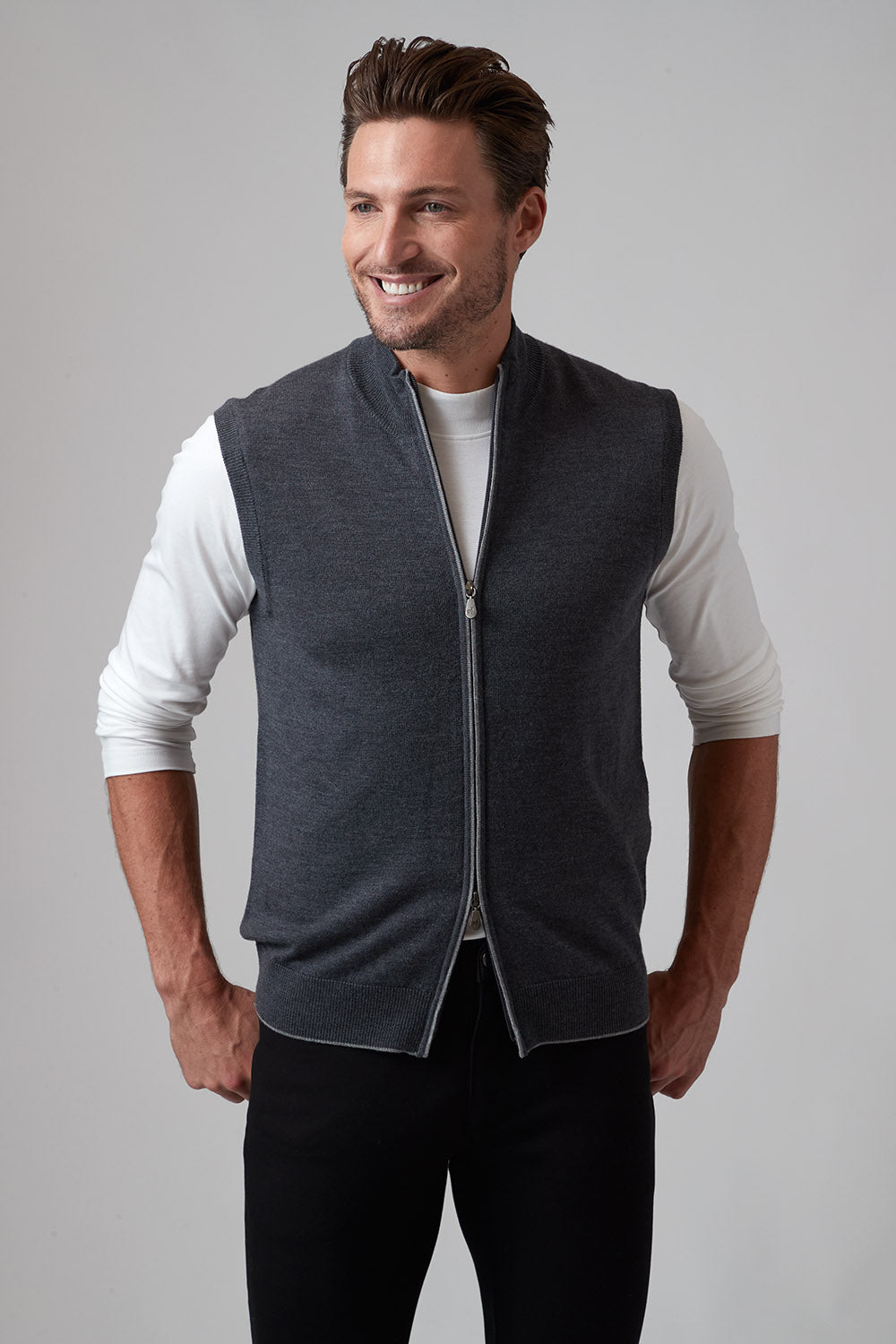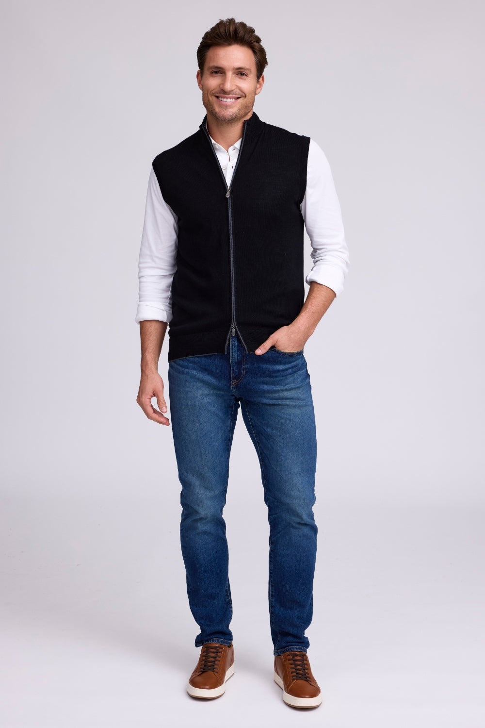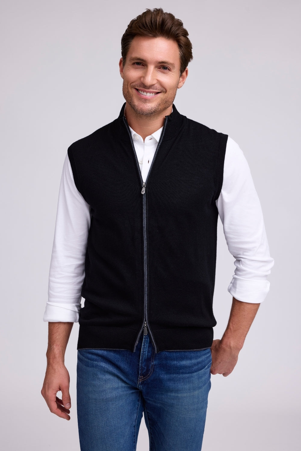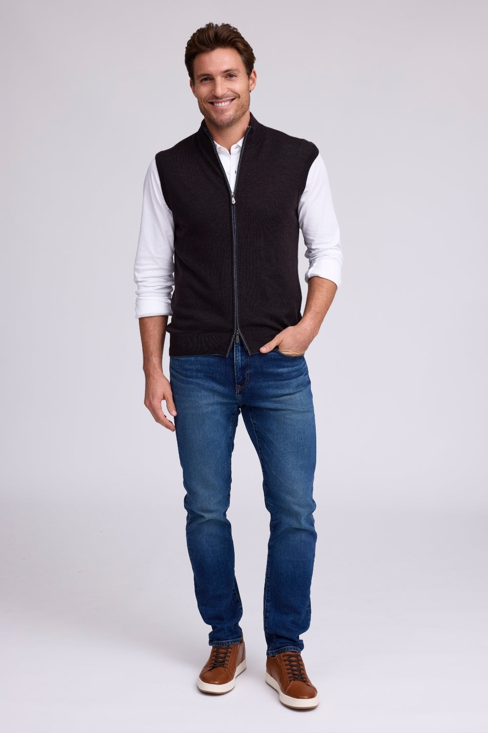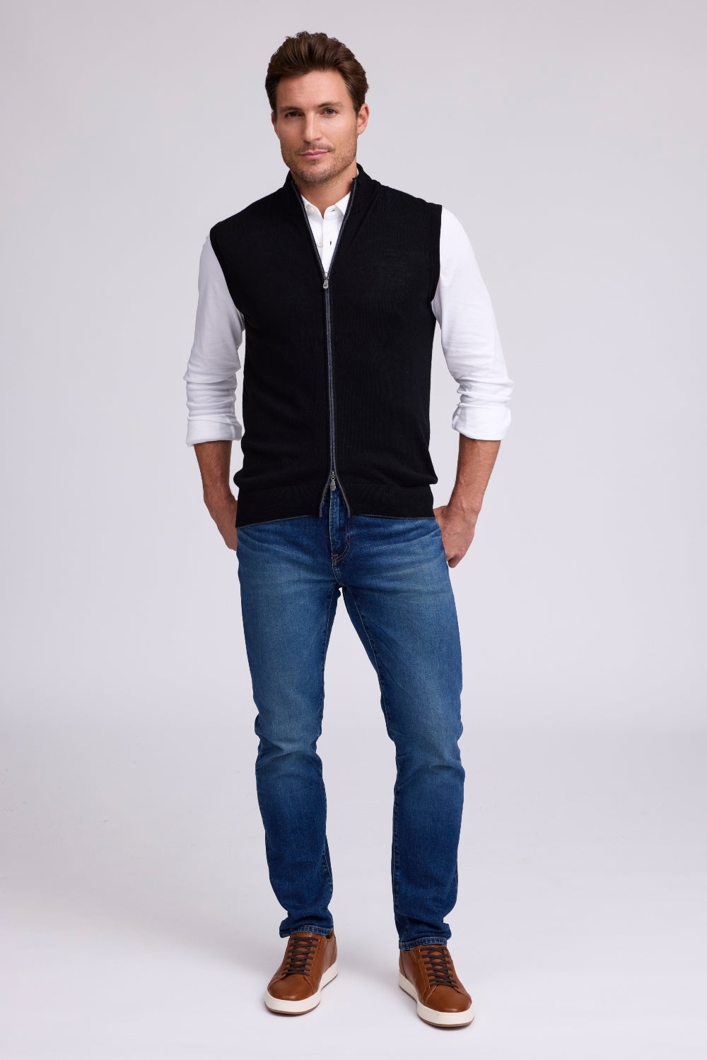 Whether you want to add a little warmth or style, you can't go wrong with The Santiago. Our 100% Extrafine Merino Wool full zip vest is a fashionable alternative to a jacket and pairs perfectly with The Westport and The Josh from our Aqua Cotton Collection. Tonal trim on the placket, cuff and hem, 2-way zipper, and mock neck provide elevated details.