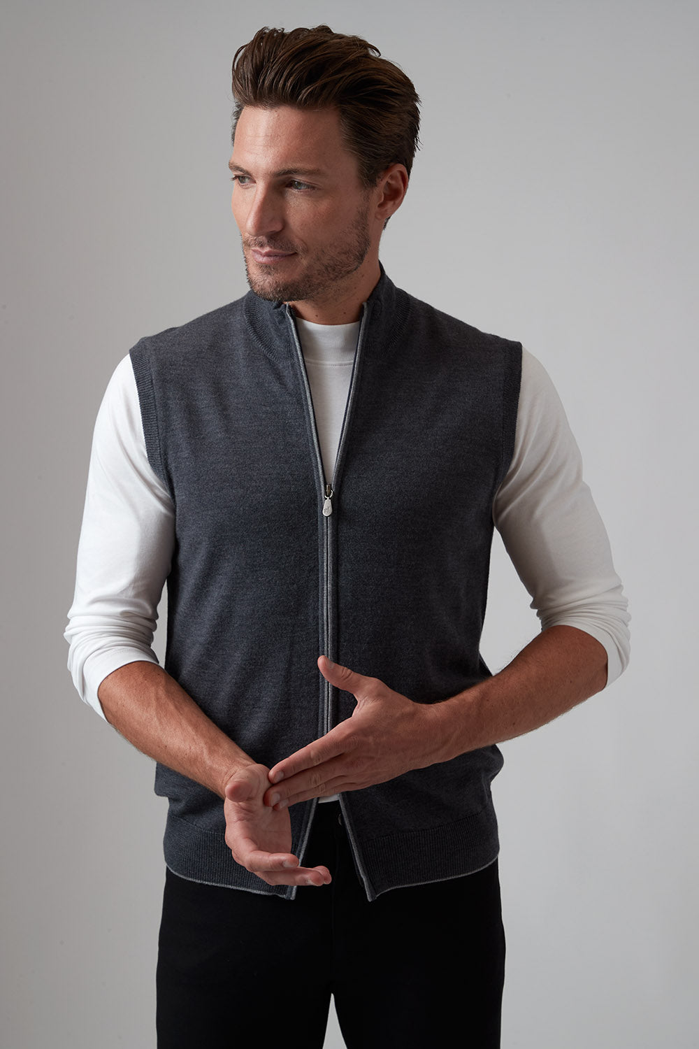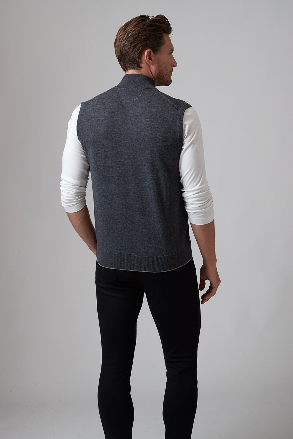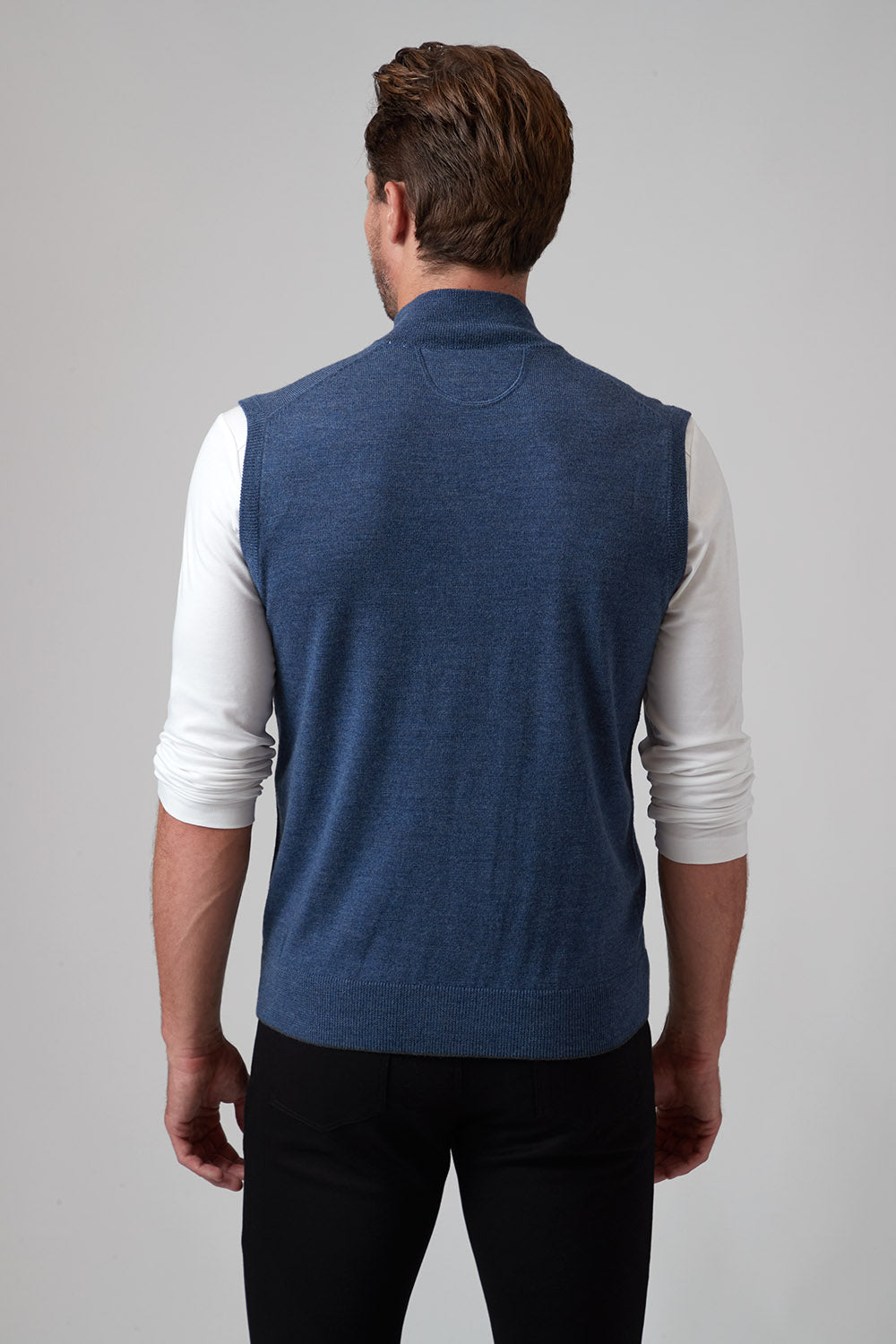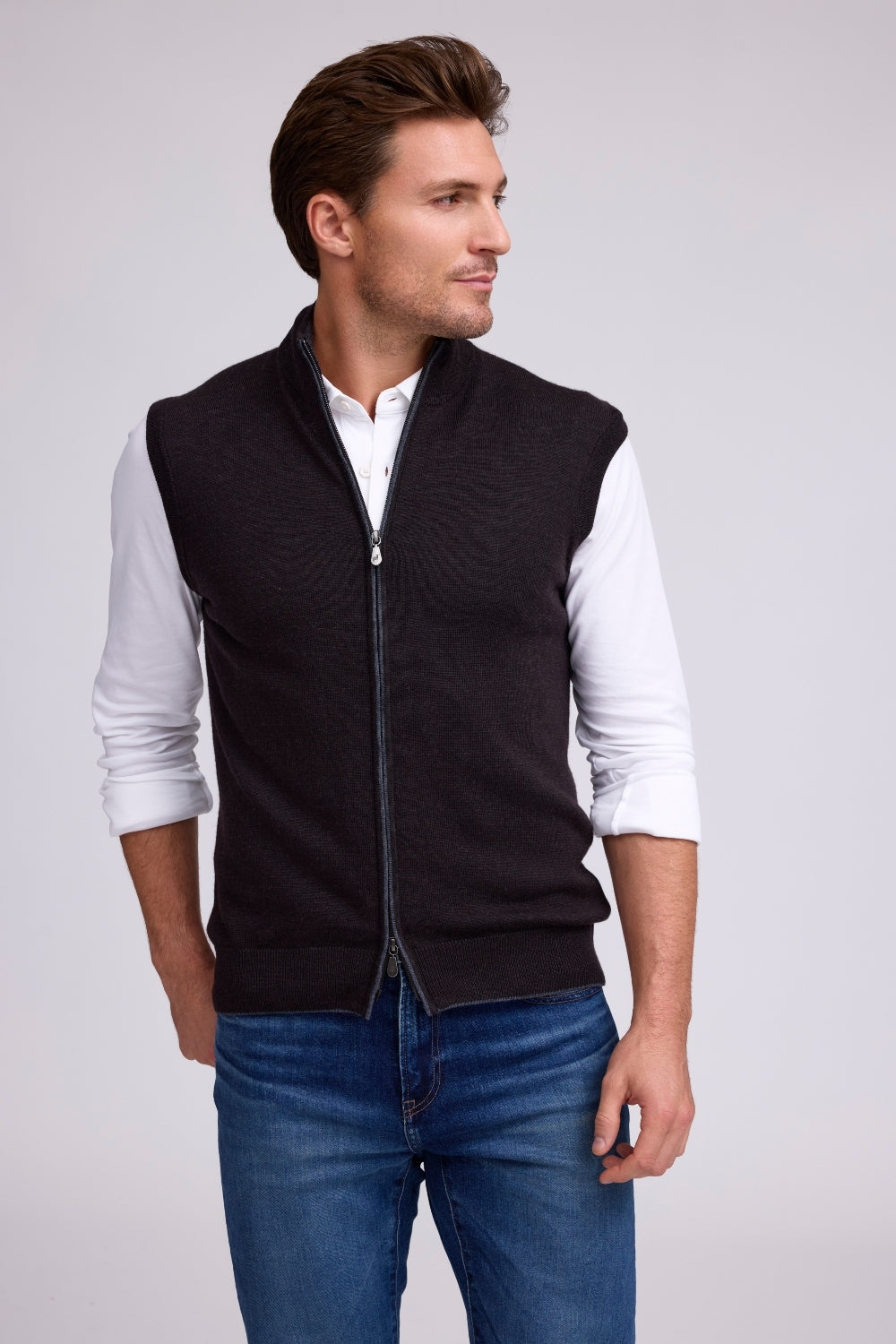 Whether you want to add a little warmth or style, you can't go wrong with The Santiago. Our 100% Extrafine Merino Wool full zip vest is a fashionable alternative to a jacket and pairs perfectly with The Westport and The Josh from our Aqua Cotton Collection. Tonal trim on the placket, cuff and hem, 2-way zipper, and mock neck provide elevated details.