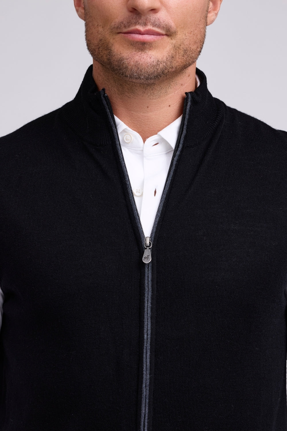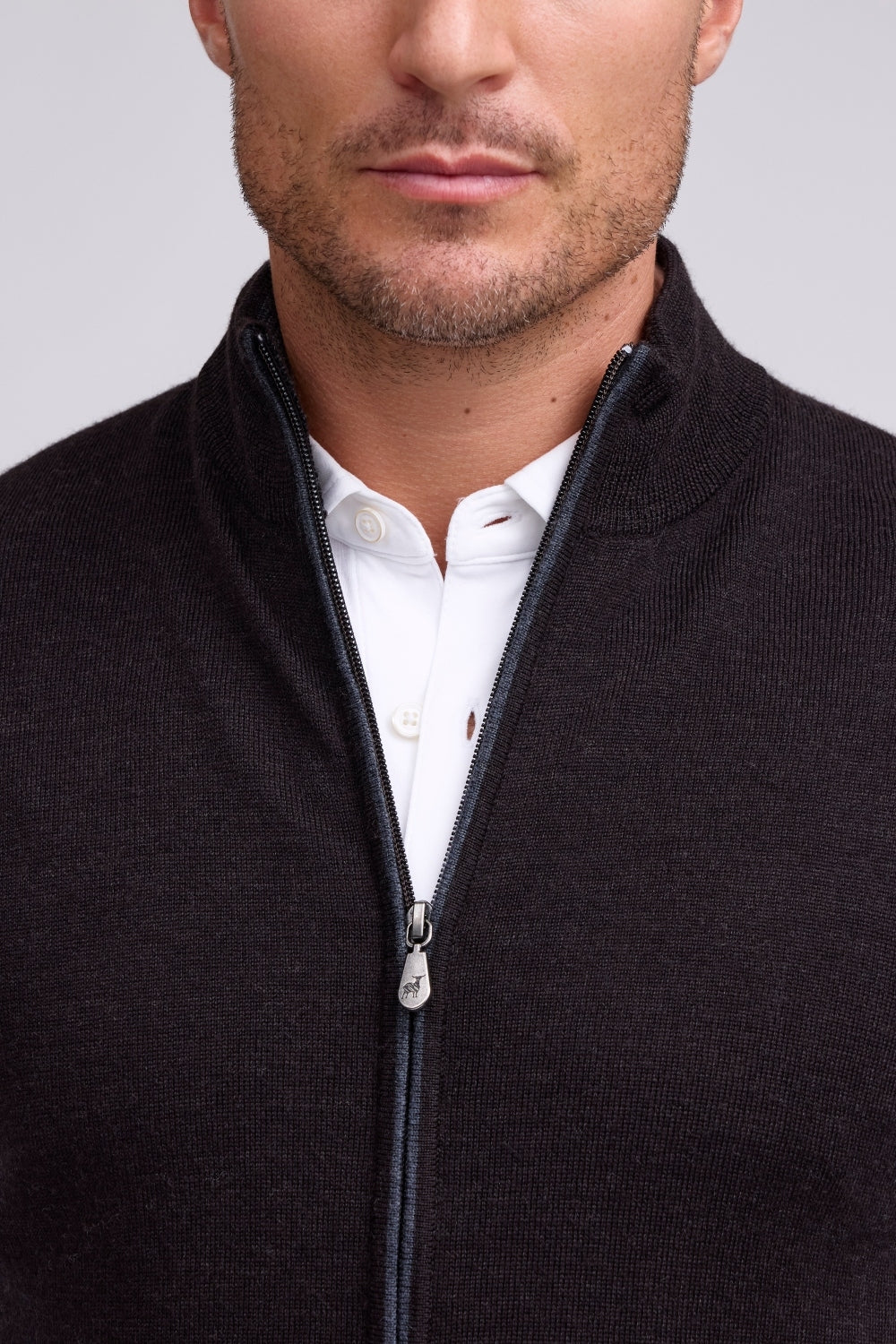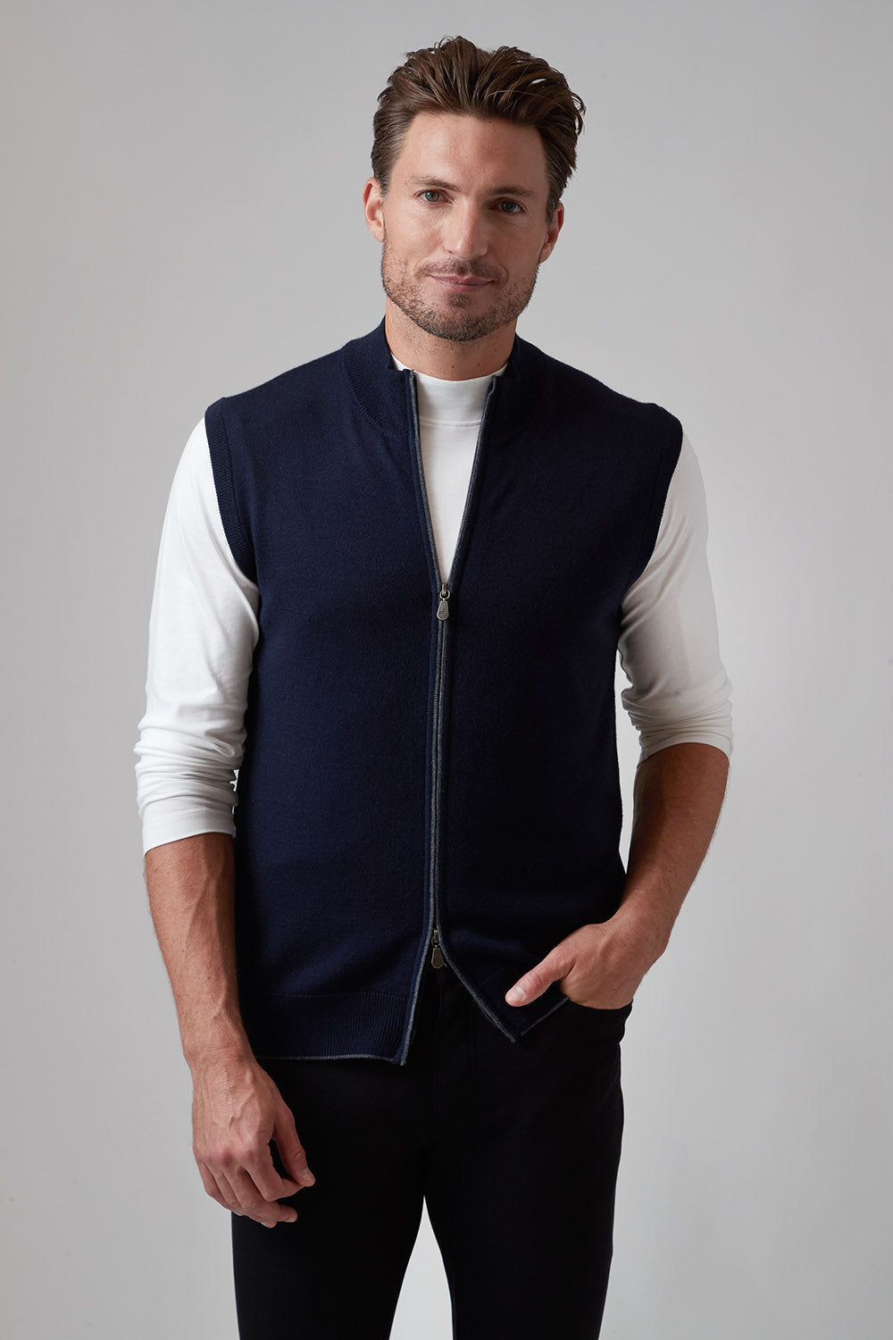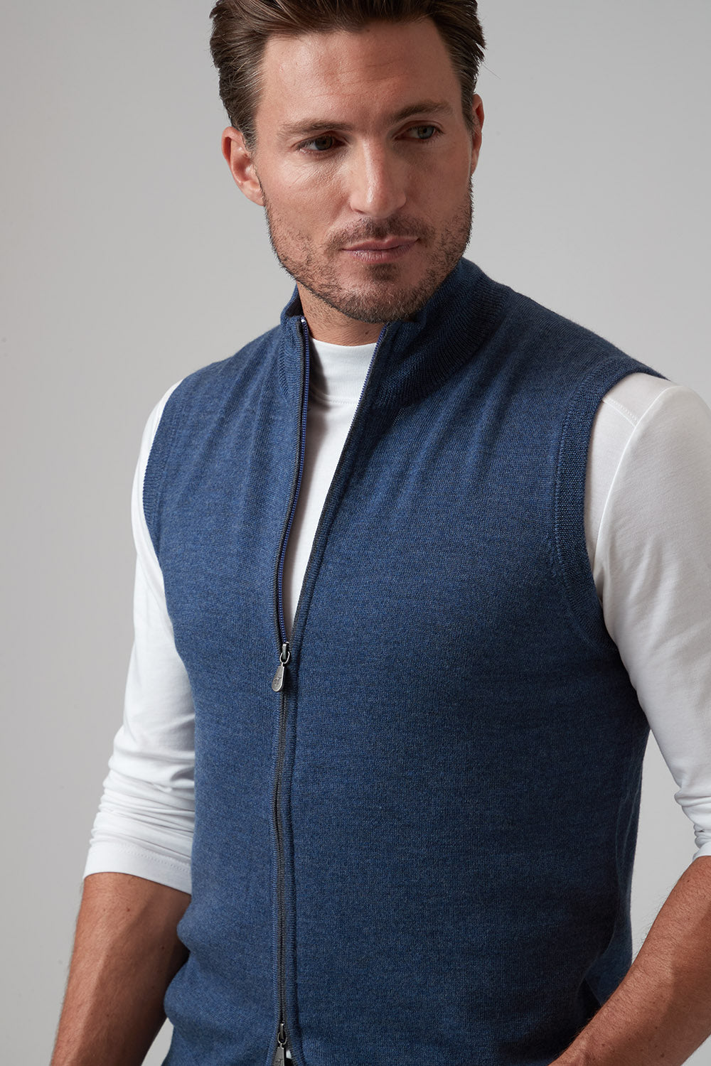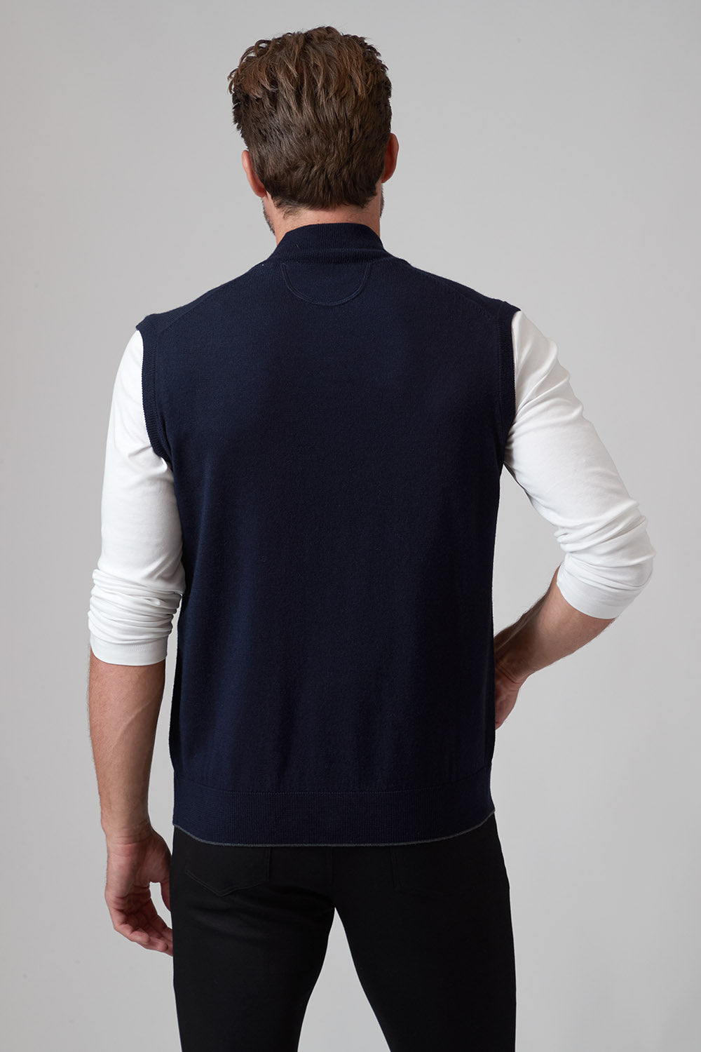 Whether you want to add a little warmth or style, you can't go wrong with The Santiago. Our 100% Extrafine Merino Wool full zip vest is a fashionable alternative to a jacket and pairs perfectly with The Westport and The Josh from our Aqua Cotton Collection. Tonal trim on the placket, cuff and hem, 2-way zipper, and mock neck provide elevated details.