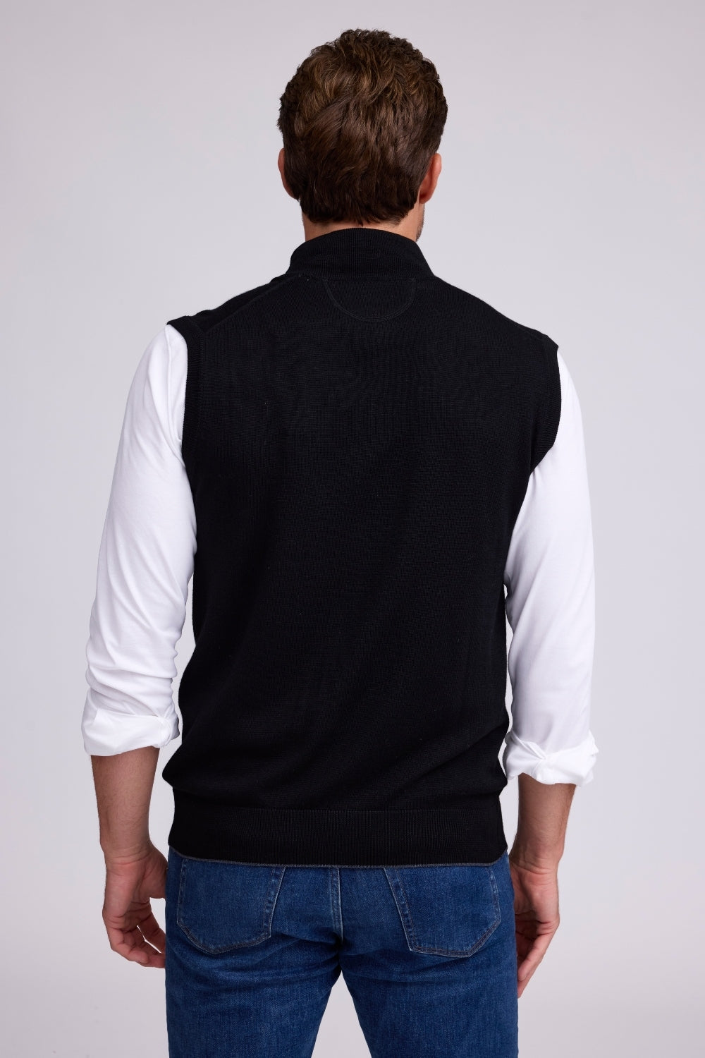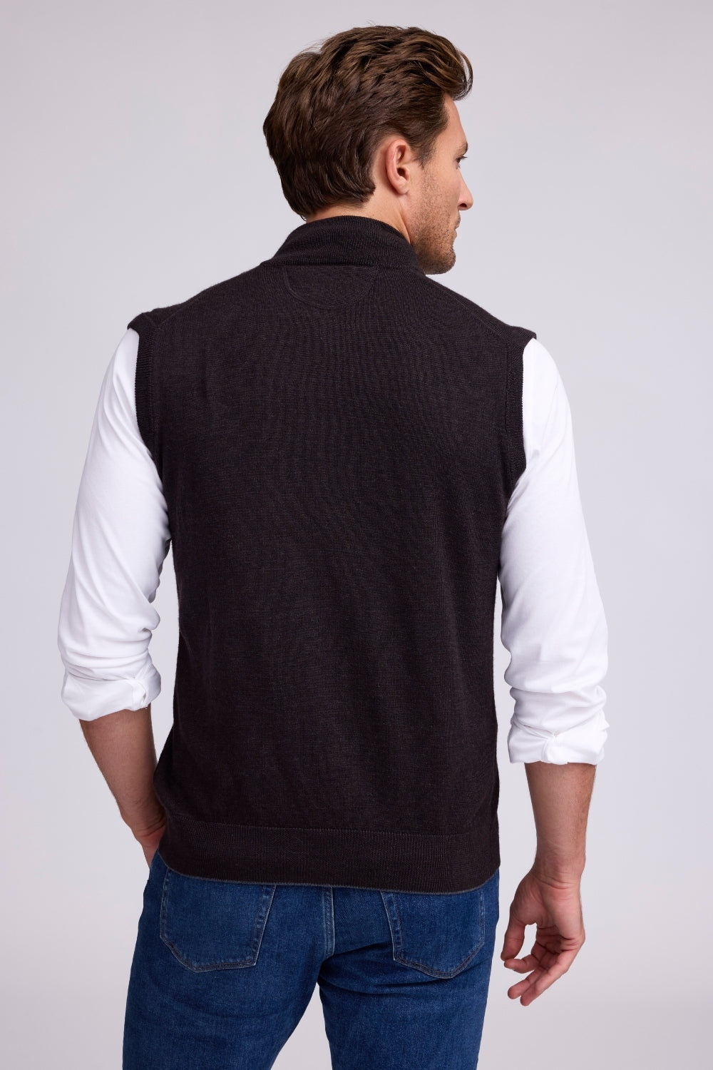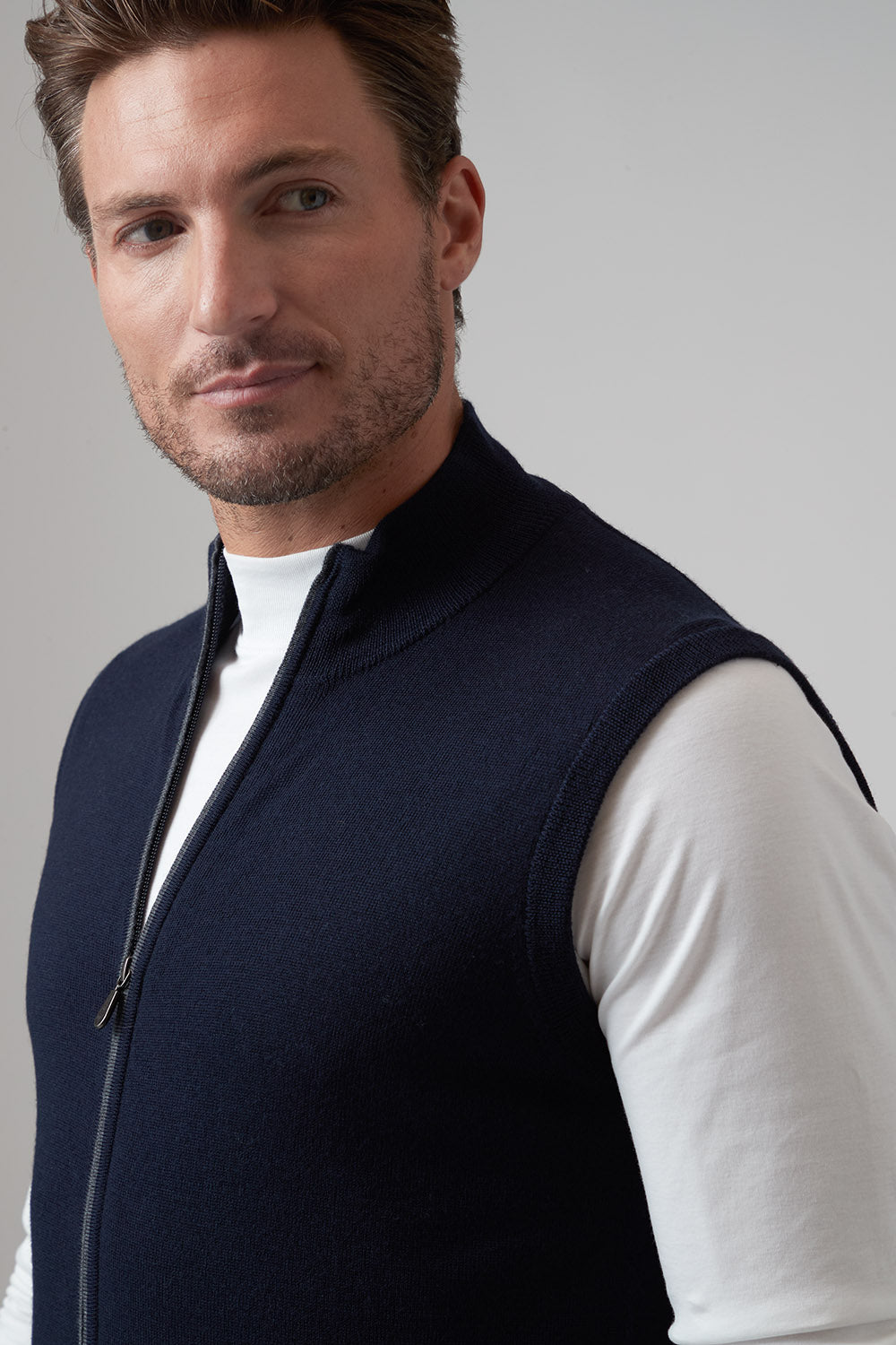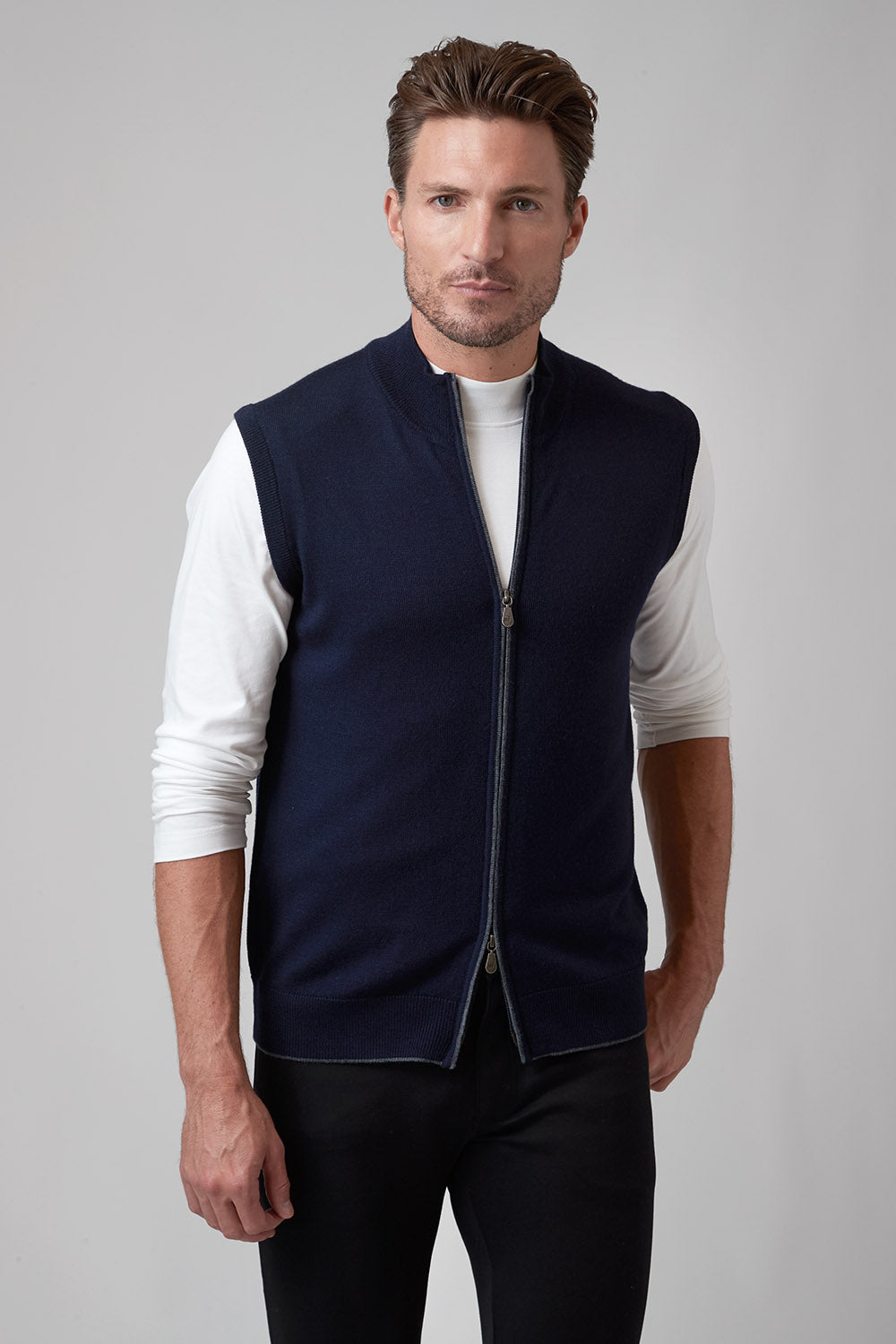 Whether you want to add a little warmth or style, you can't go wrong with The Santiago. Our 100% Extrafine Merino Wool full zip vest is a fashionable alternative to a jacket and pairs perfectly with The Westport and The Josh from our Aqua Cotton Collection. Tonal trim on the placket, cuff and hem, 2-way zipper, and mock neck provide elevated details.
