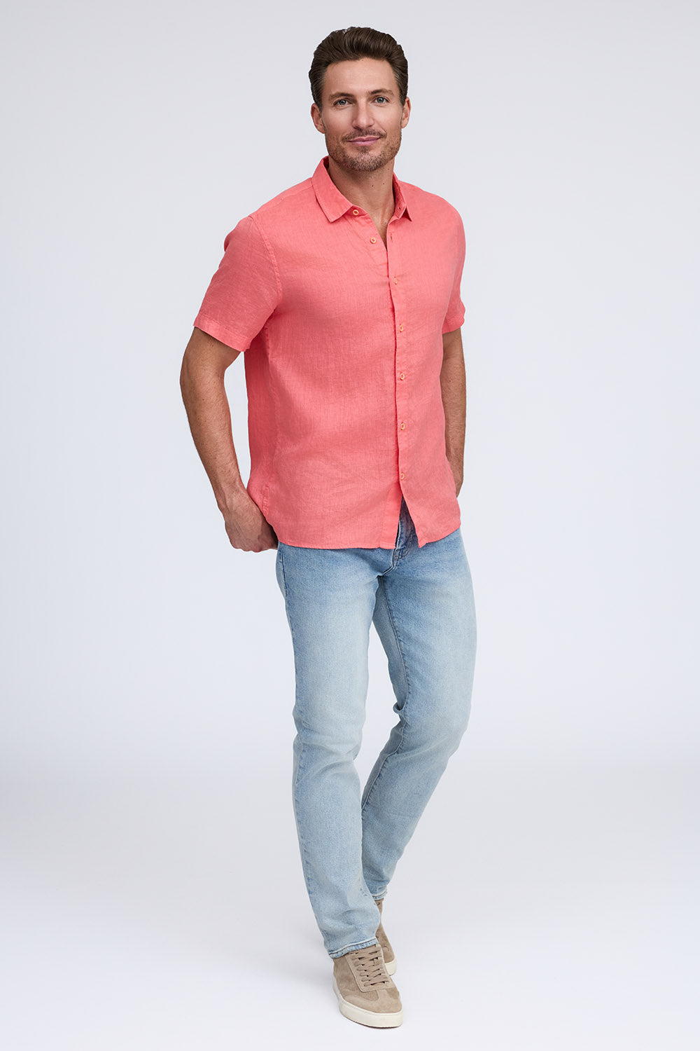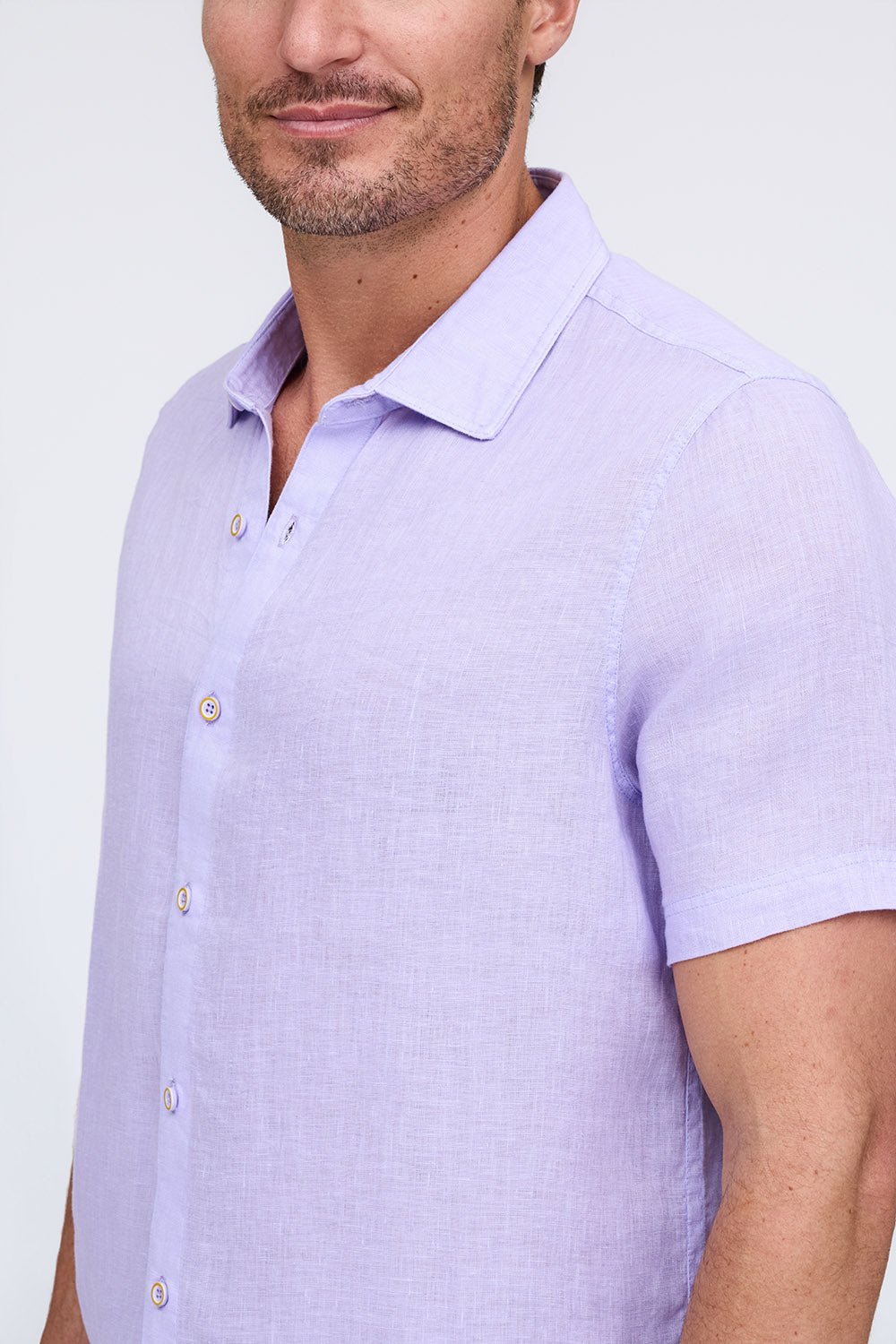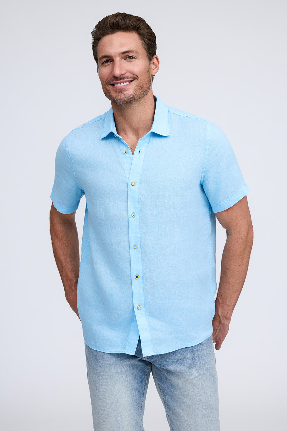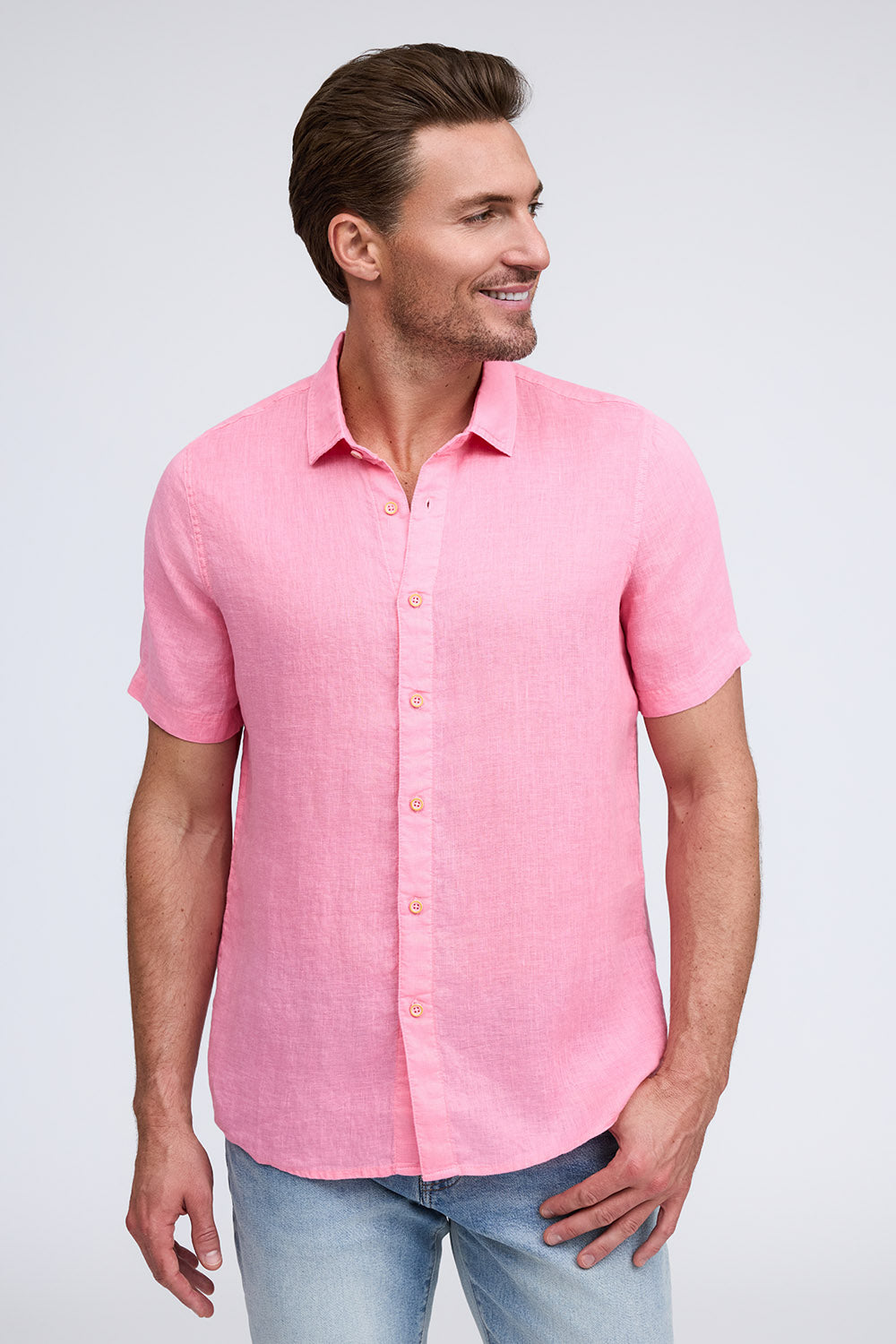 Get that laid-back, breezy feeling when you slip on The Bryce, our sun-baked 100% pure linen shirt. This easy-to-care, easy-to-wear shirt maintains its shape, color, and comfortable feel, making it the perfect shirt for wherever the summer takes you. Tropical inspired color palate.