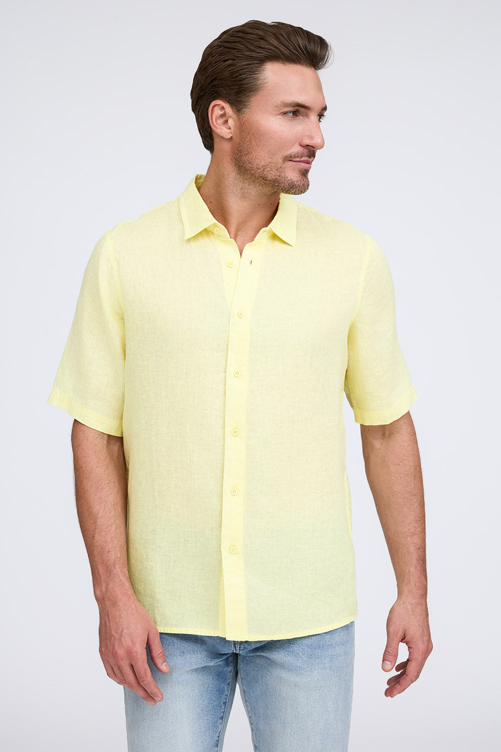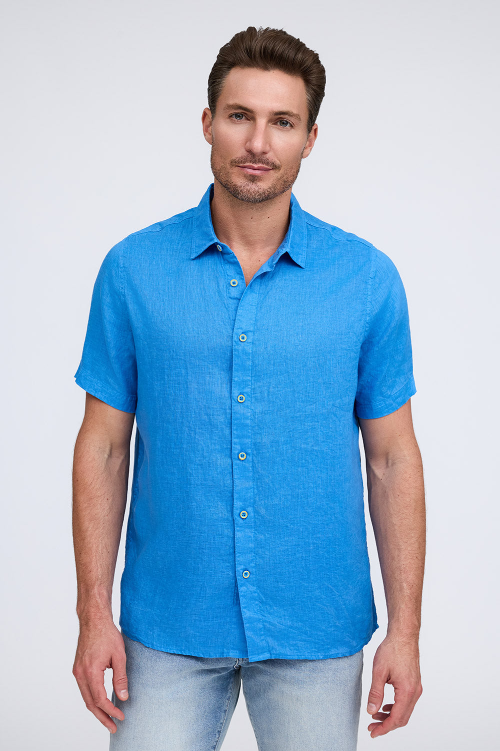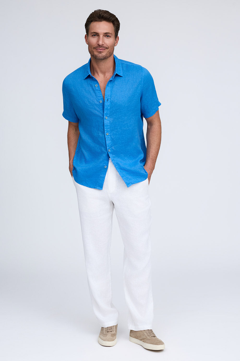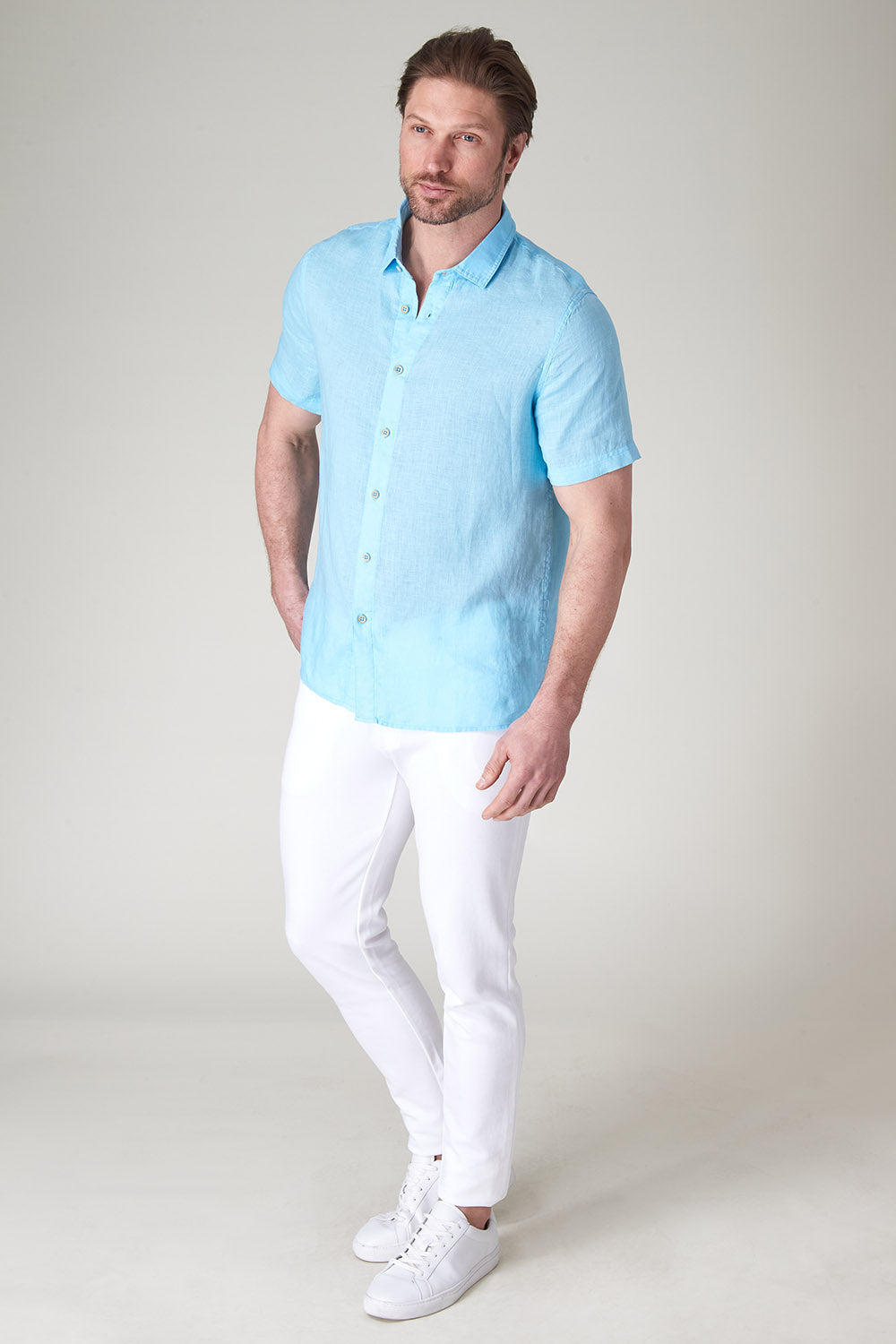 Get that laid-back, breezy feeling when you slip on The Bryce, our sun-baked 100% pure linen shirt. This easy-to-care, easy-to-wear shirt maintains its shape, color, and comfortable feel, making it the perfect shirt for wherever the summer takes you. Tropical inspired color palate.