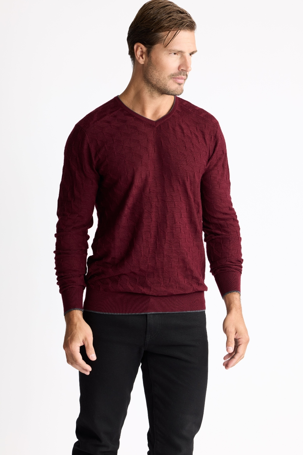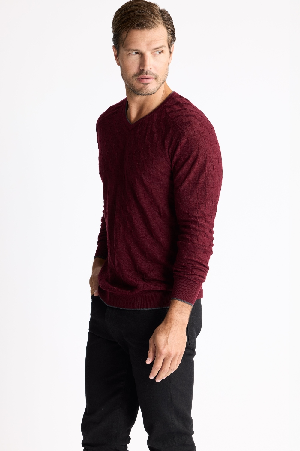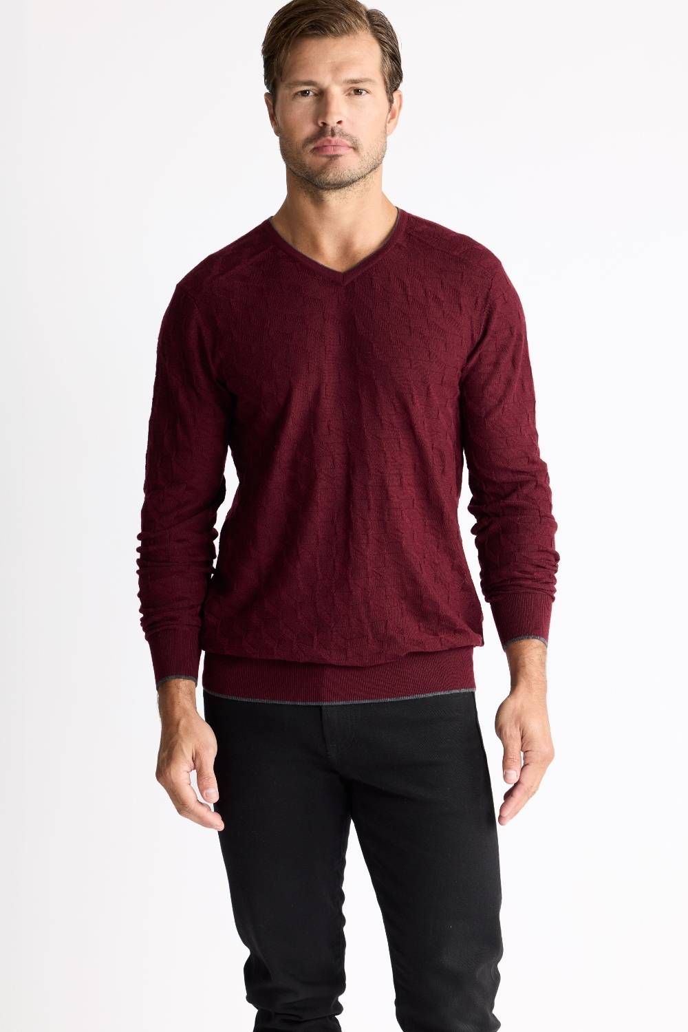 The Rowan, our wonderfully textured Jacquard V-Neck sweater created from our Extrafine Merino Wool blend. The garment features a thin complementary stripe detail along the collar and sleeves. Designed for you to "Look your best to feel your best."