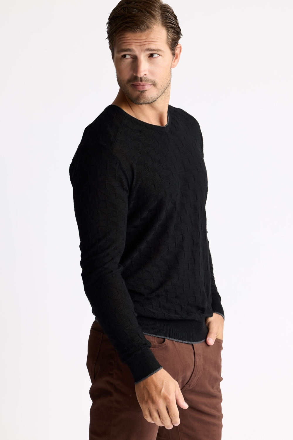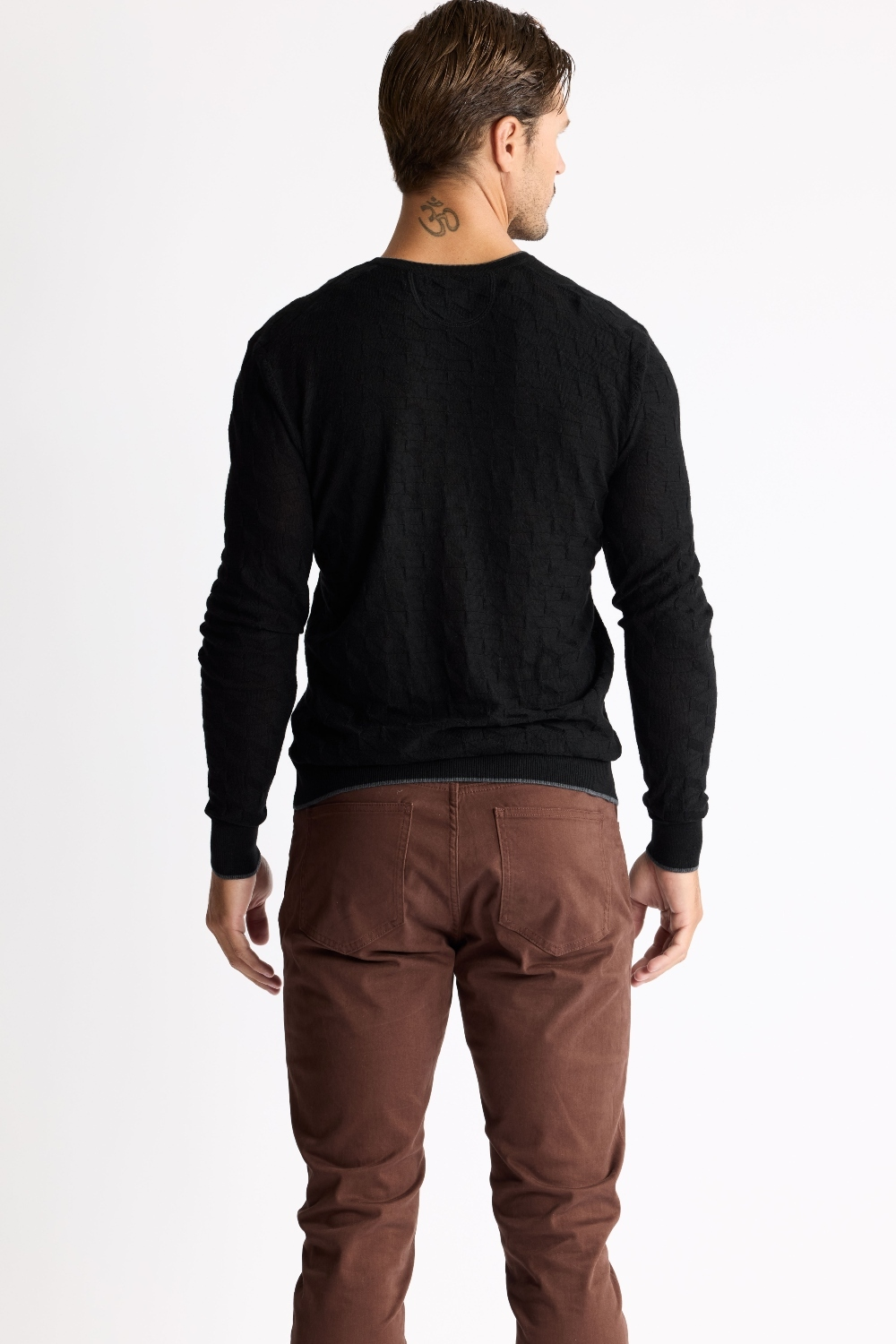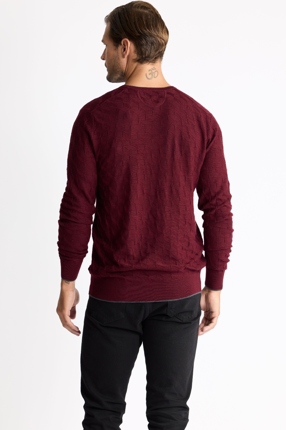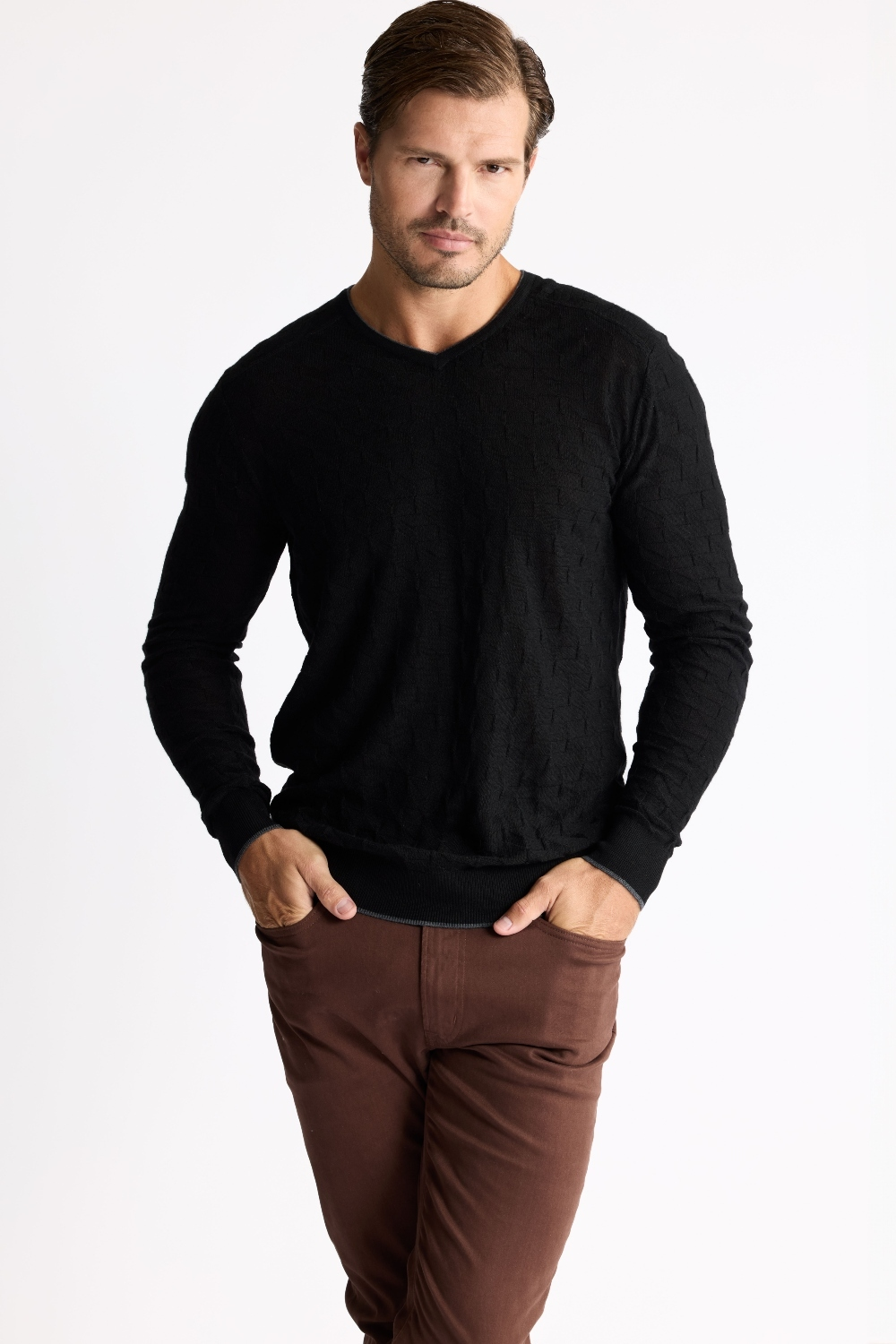 The Rowan, our wonderfully textured Jacquard V-Neck sweater created from our Extrafine Merino Wool blend. The garment features a thin complementary stripe detail along the collar and sleeves. Designed for you to "Look your best to feel your best."
