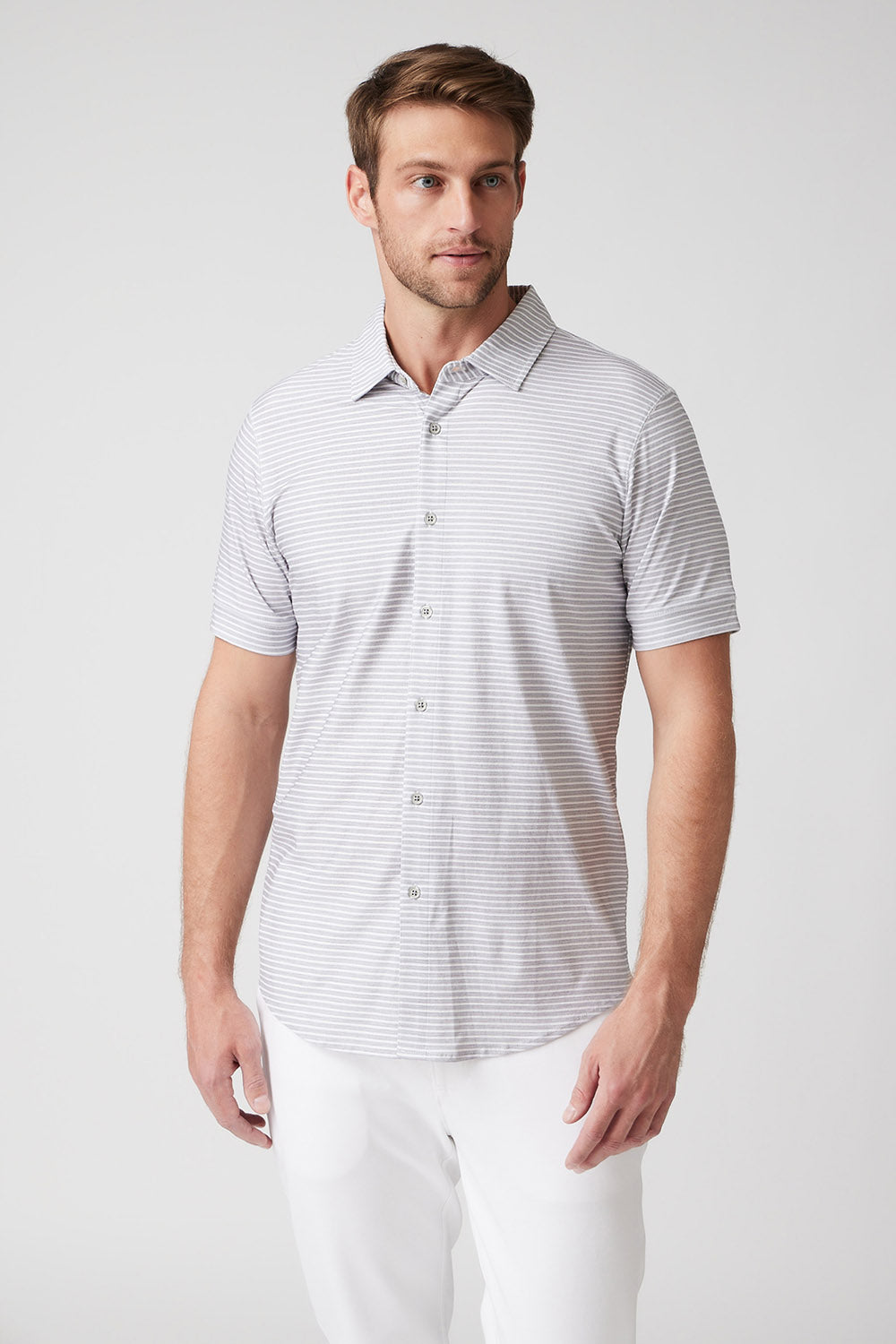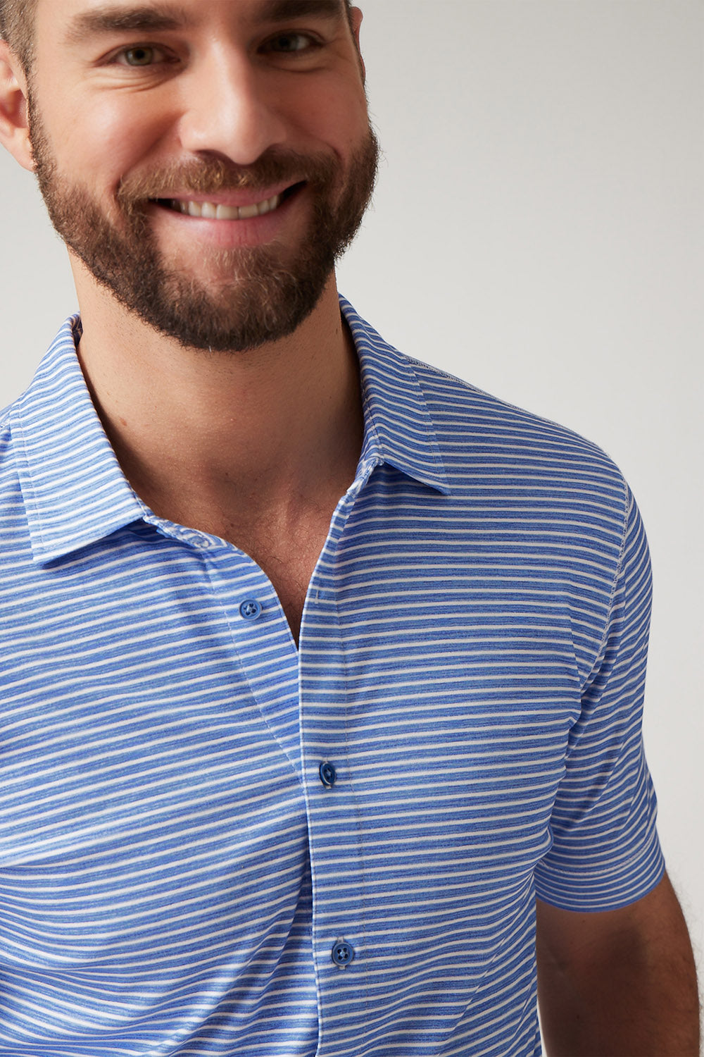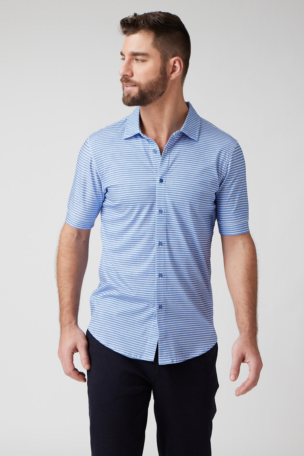 Sure to become your favorite sunny day shirt, The Trey is designed in our signature 100% Aqua Cotton for a lightweight feel and breathability. The blue and grey horizontal stripes give a nautical vibe that looks great paired with the Andrew pant for a perfect summertime look.