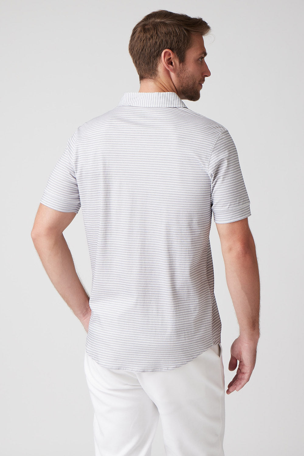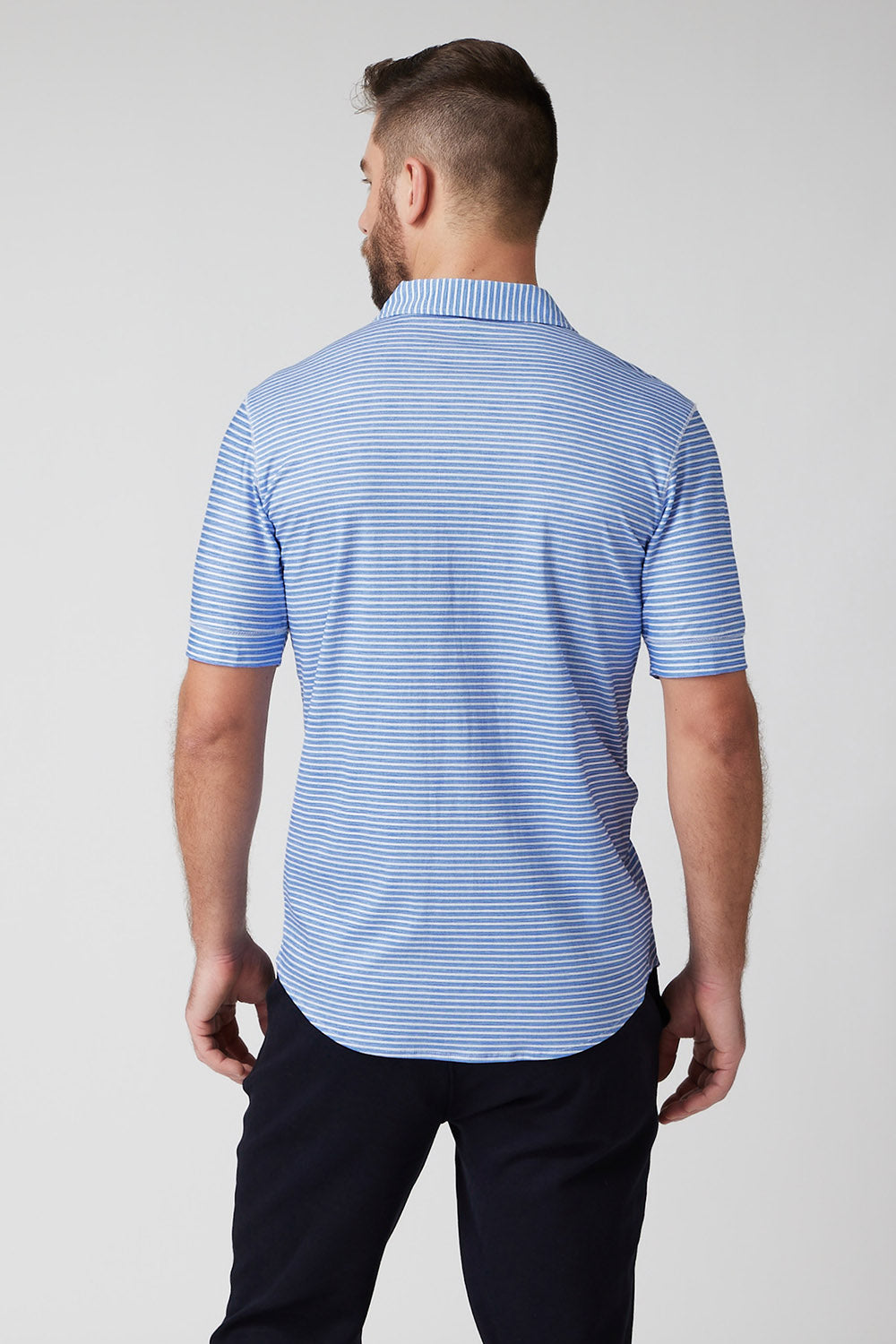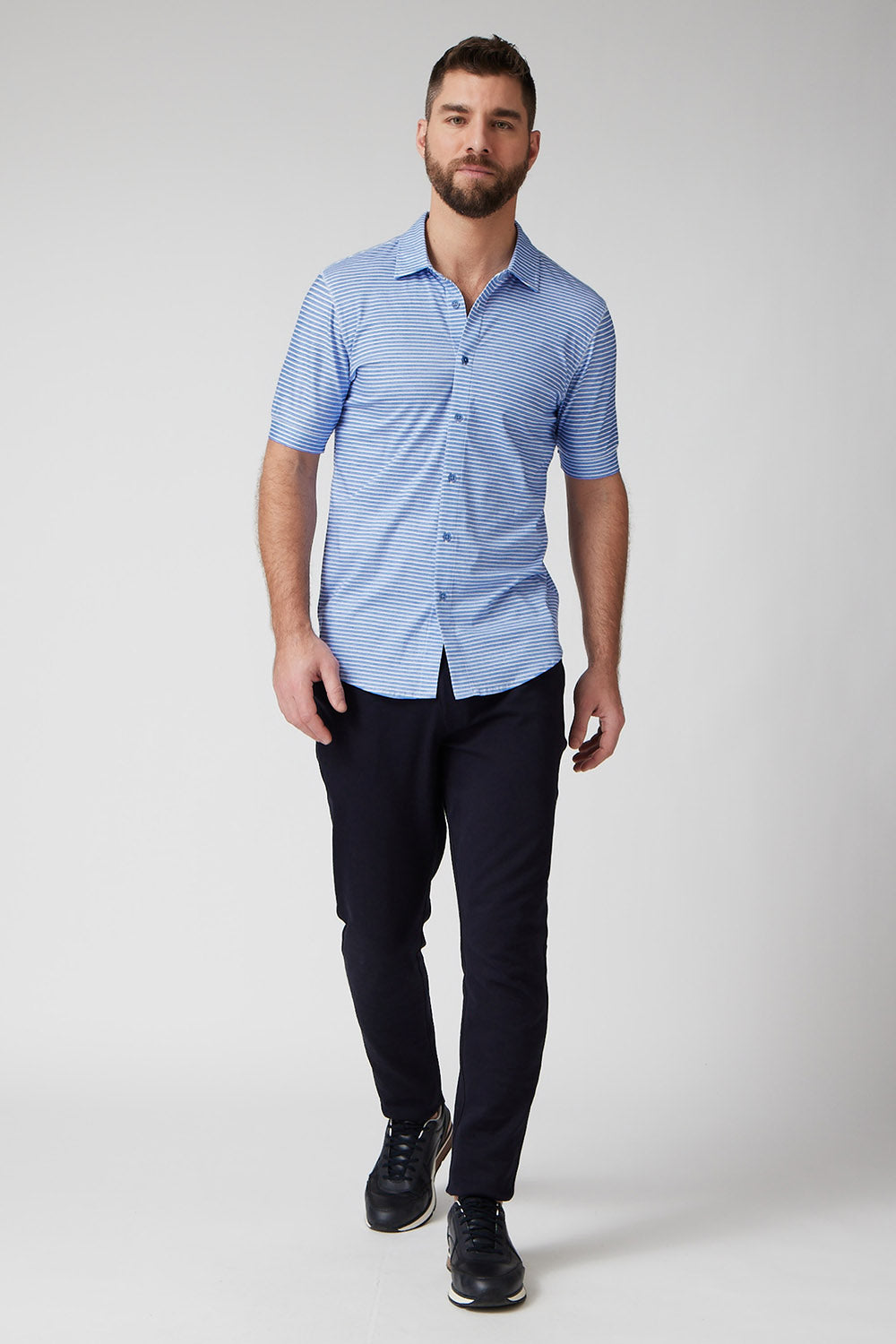 Sure to become your favorite sunny day shirt, The Trey is designed in our signature 100% Aqua Cotton for a lightweight feel and breathability. The blue and grey horizontal stripes give a nautical vibe that looks great paired with the Andrew pant for a perfect summertime look.