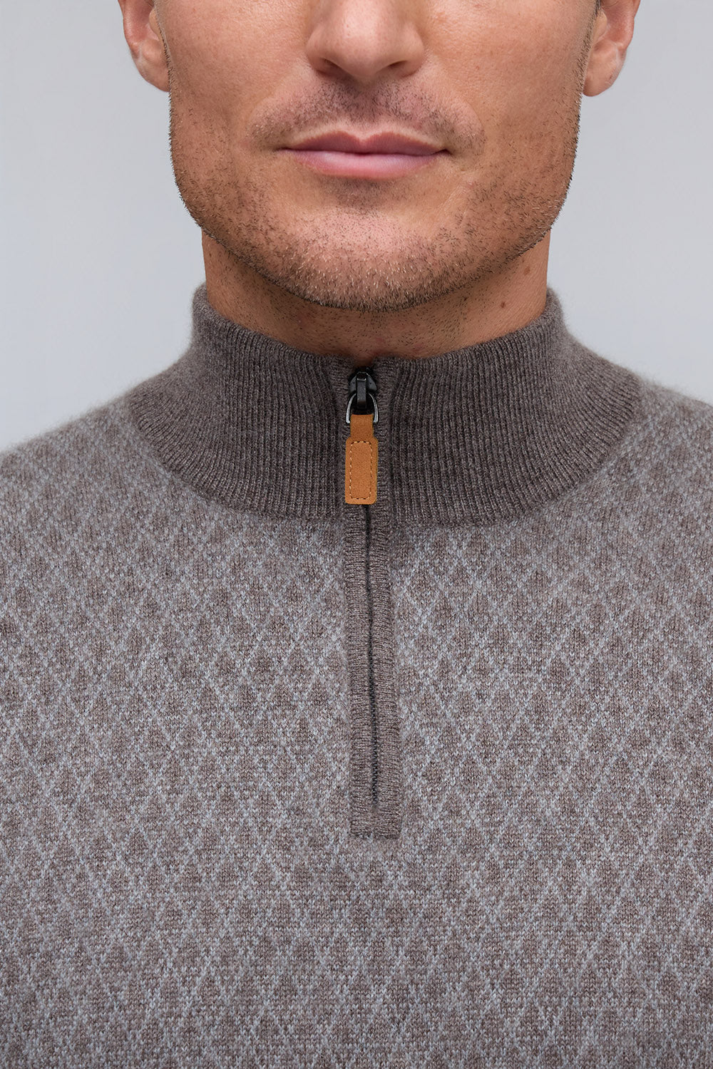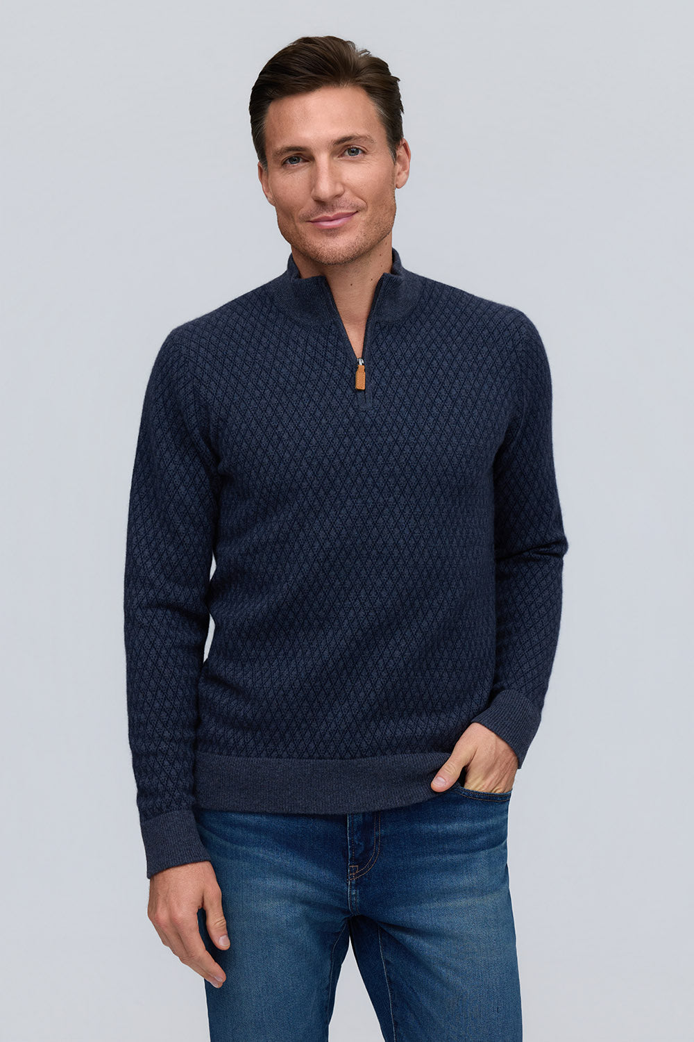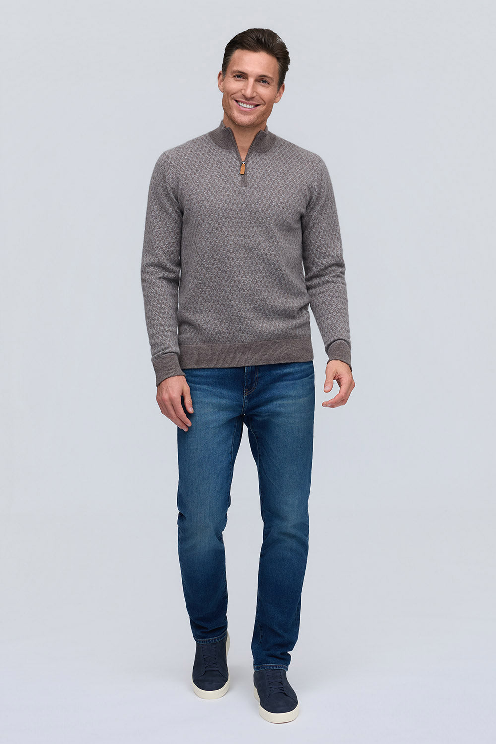 Exquisitely crafted from 100% pure cashmere, this sweater features a sophisticated jacquard diamond pattern enhanced by contrasting trims. The sleek zip mock neck adds a refined, contemporary edge to this timeless piece.
