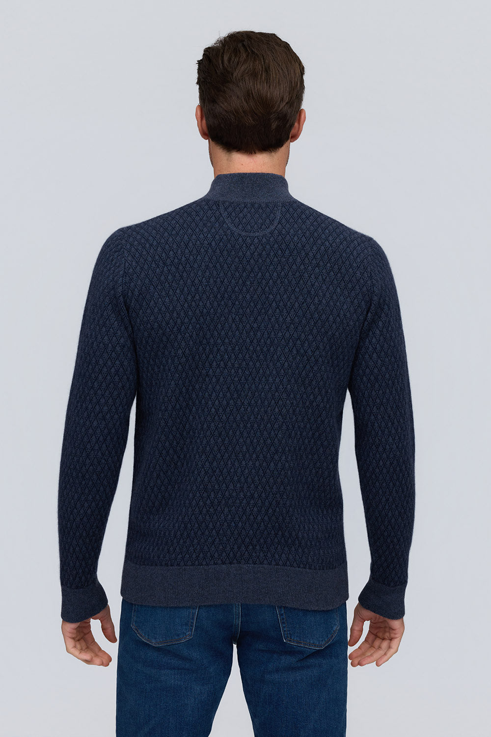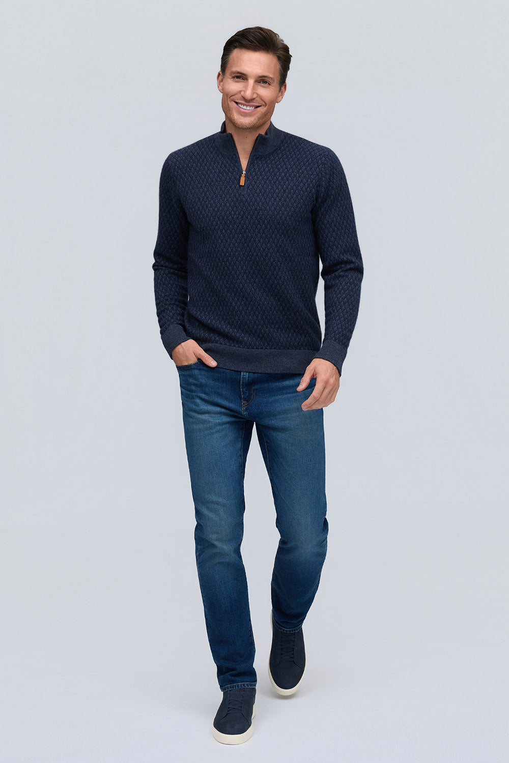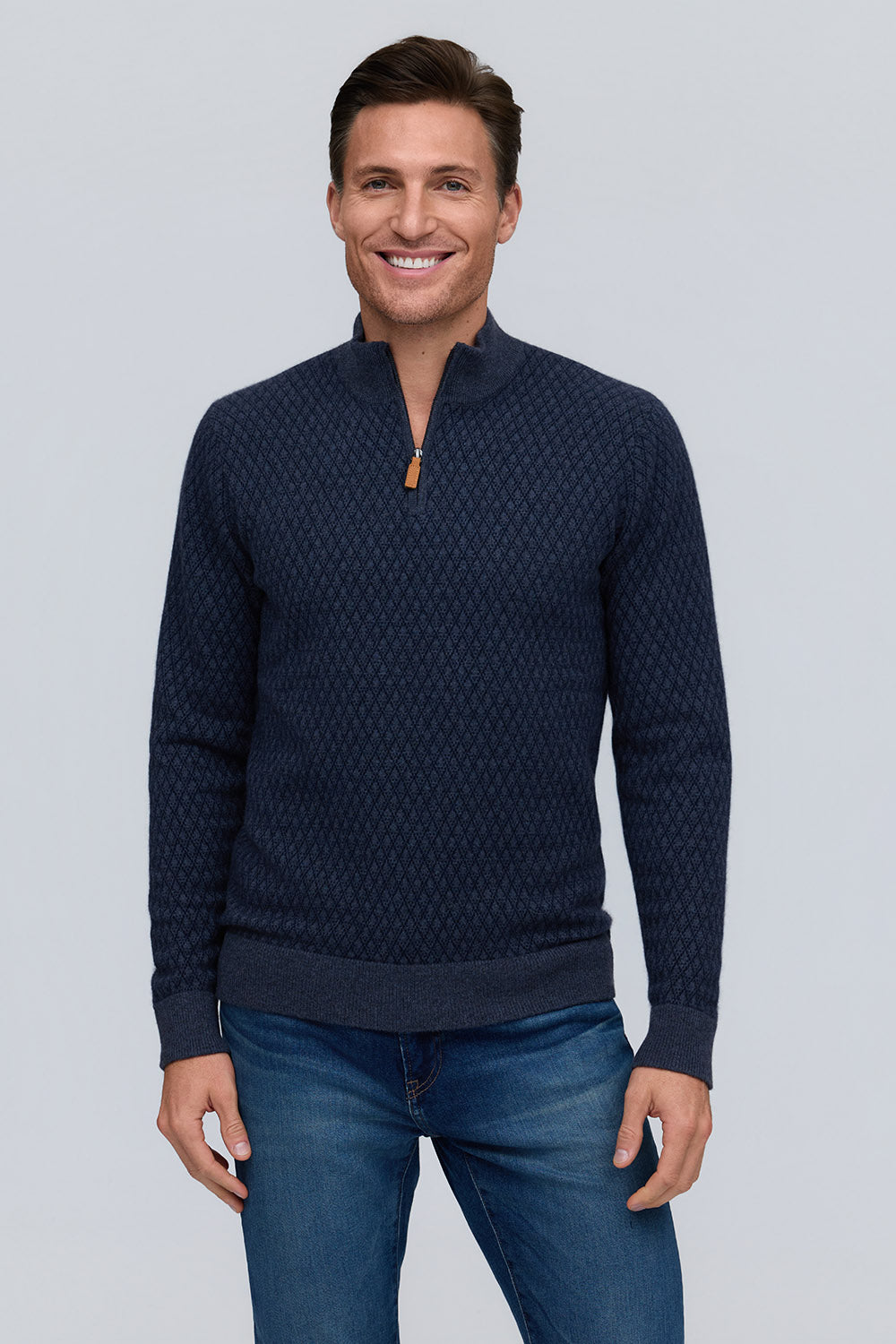 Exquisitely crafted from 100% pure cashmere, this sweater features a sophisticated jacquard diamond pattern enhanced by contrasting trims. The sleek zip mock neck adds a refined, contemporary edge to this timeless piece.