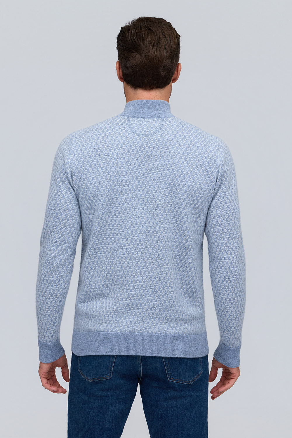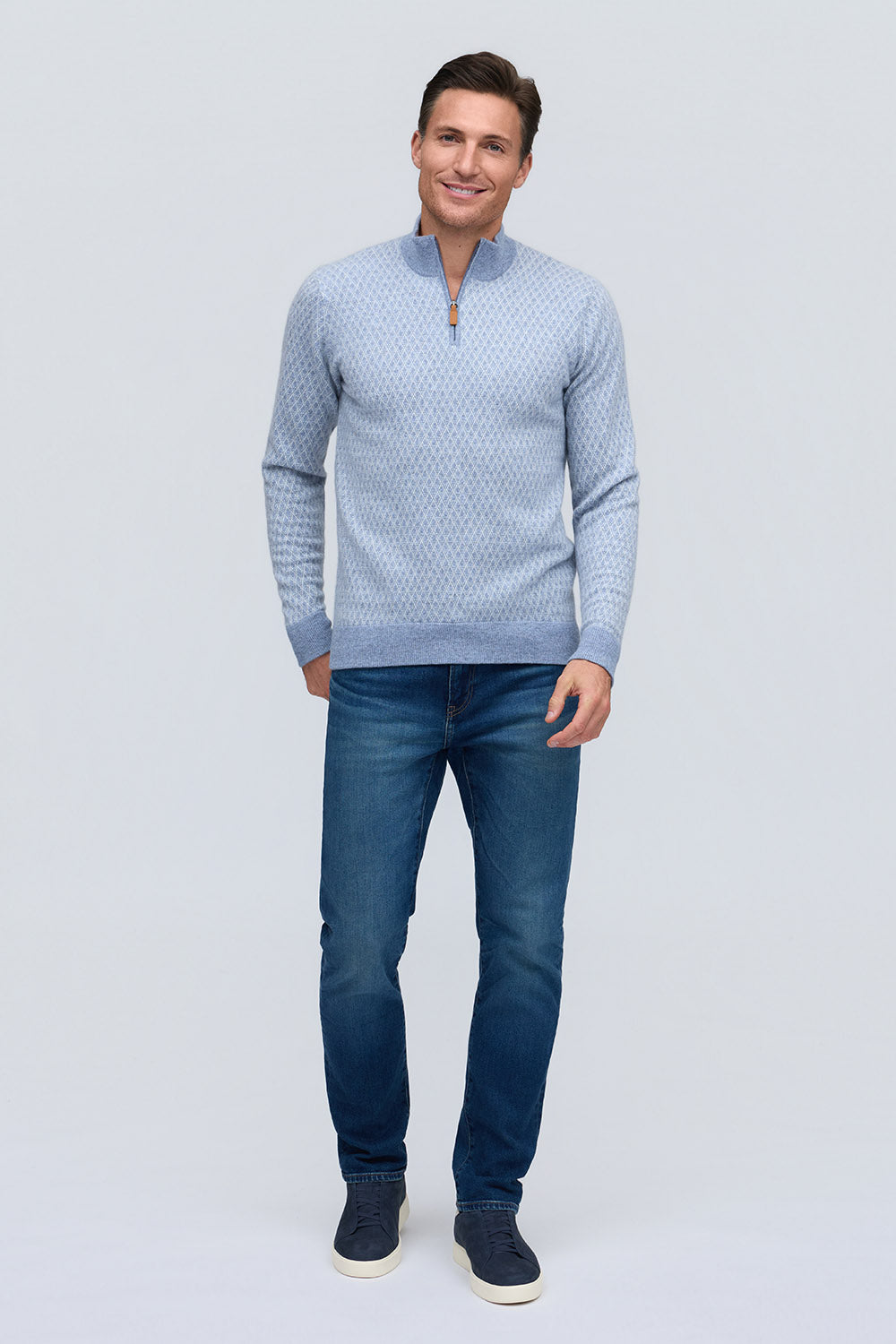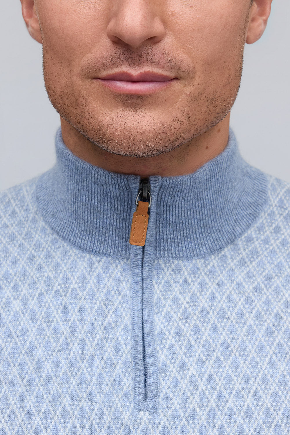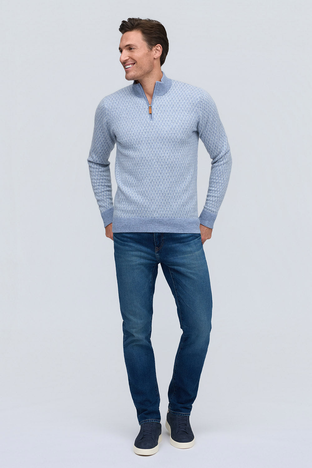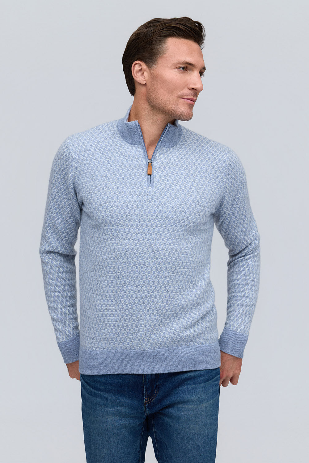 Exquisitely crafted from 100% pure cashmere, this sweater features a sophisticated jacquard diamond pattern enhanced by contrasting trims. The sleek zip mock neck adds a refined, contemporary edge to this timeless piece.