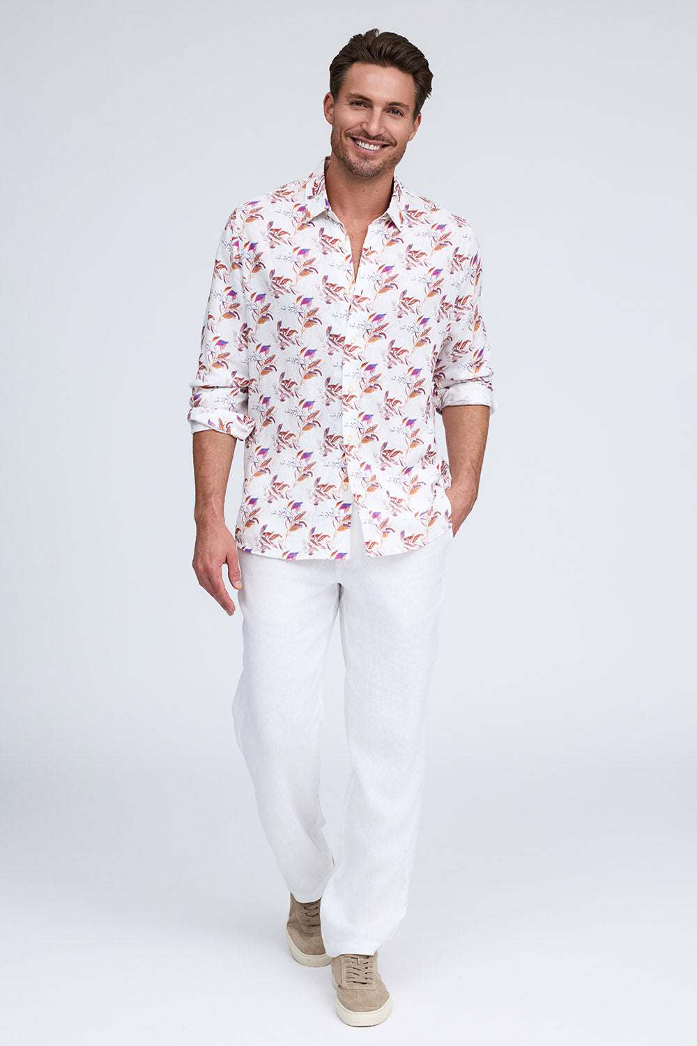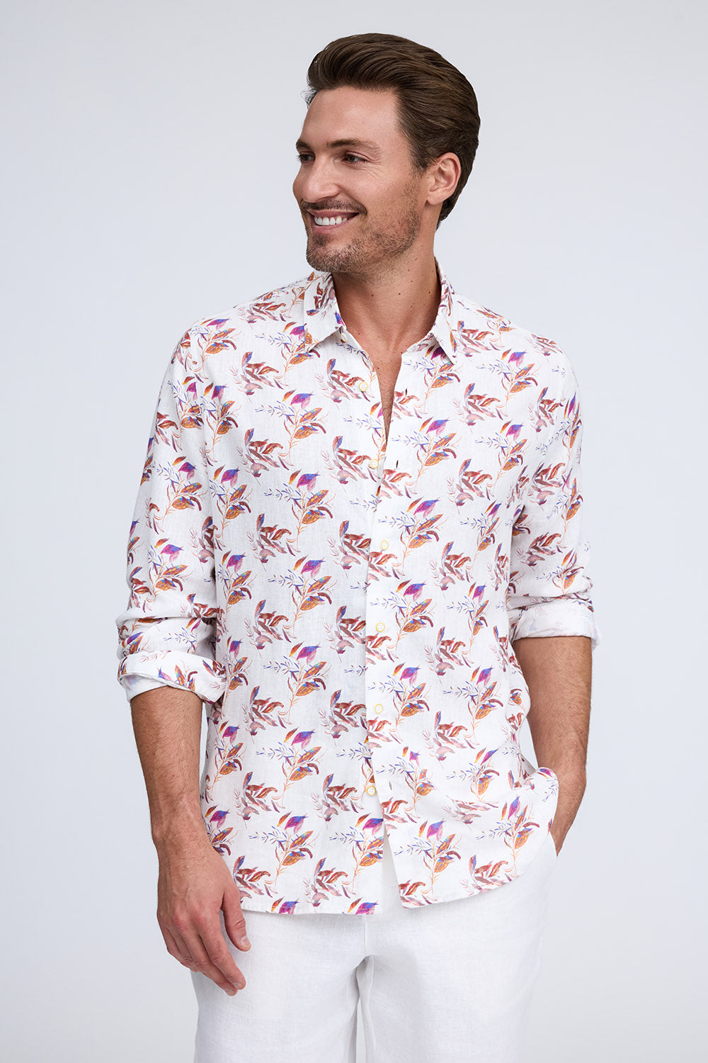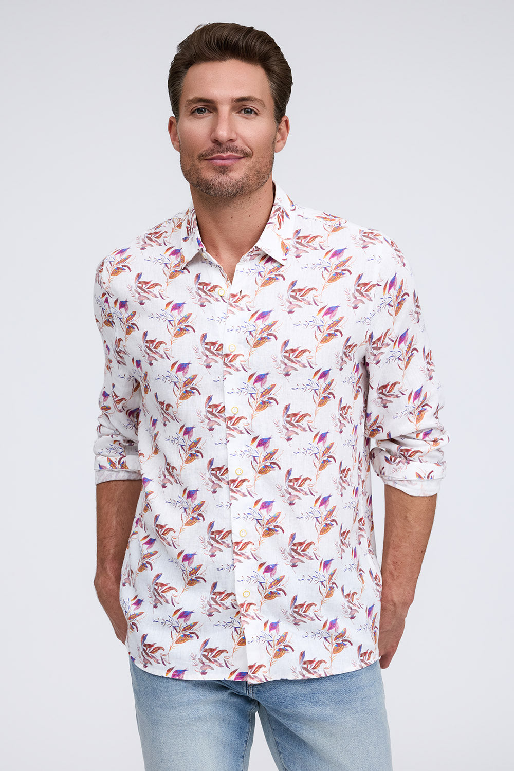 Strikingly unique - the Arlington is your new staple for standout everyday style. Made from a light, airy linen blend, this button-front long sleeve shirt features a vibrant, colorful leaf print that adds energy and flair. With its easy fit and bold design, the Arlington makes a confident statement, bringing a lively burst of character to any wardrobe.
