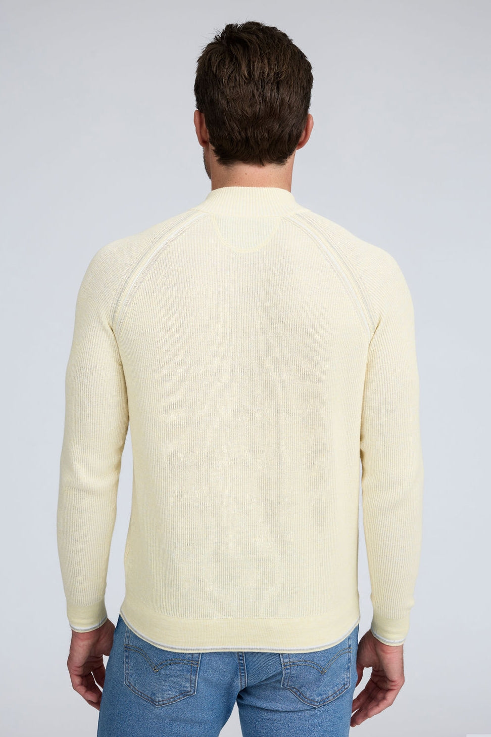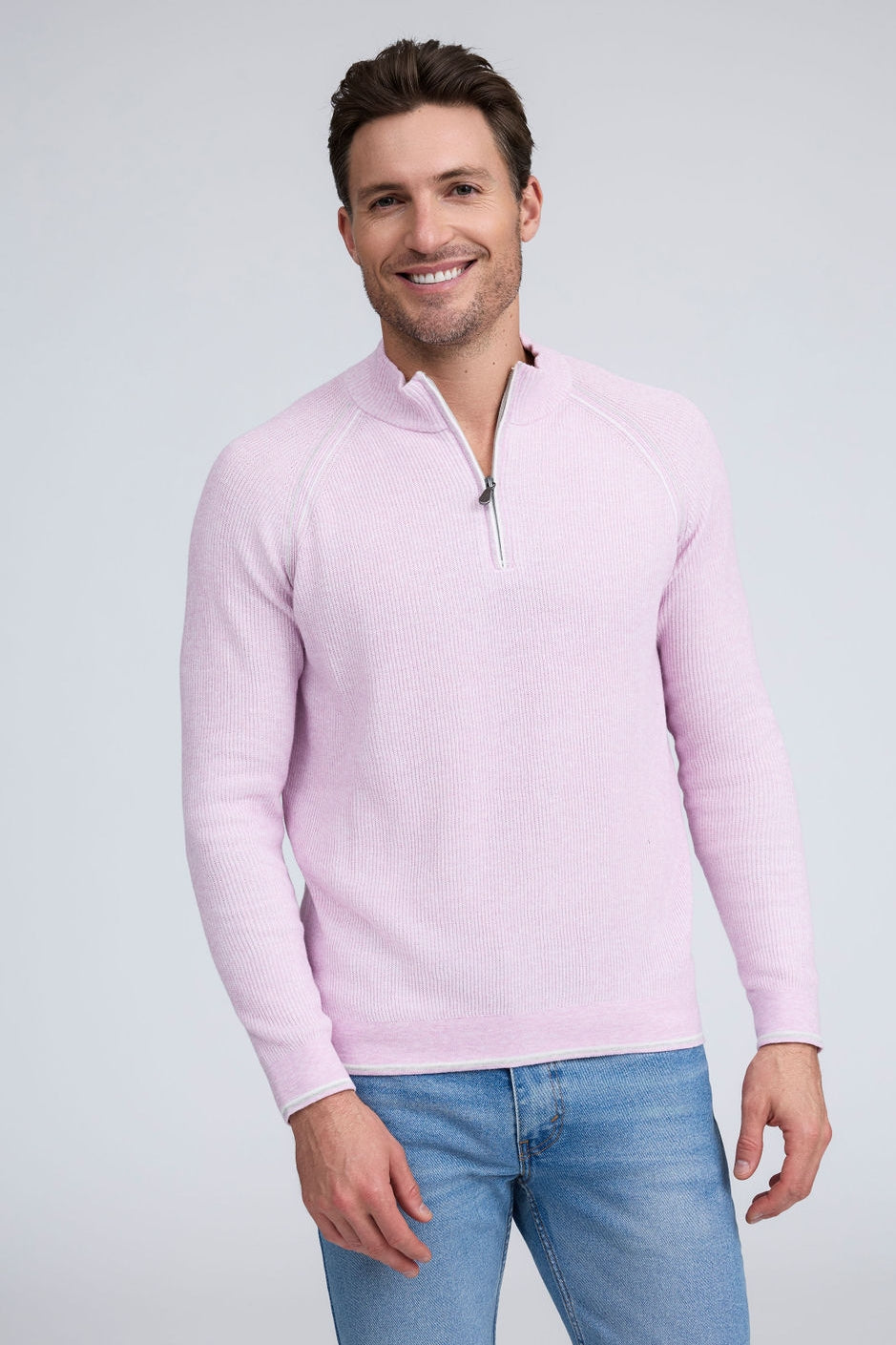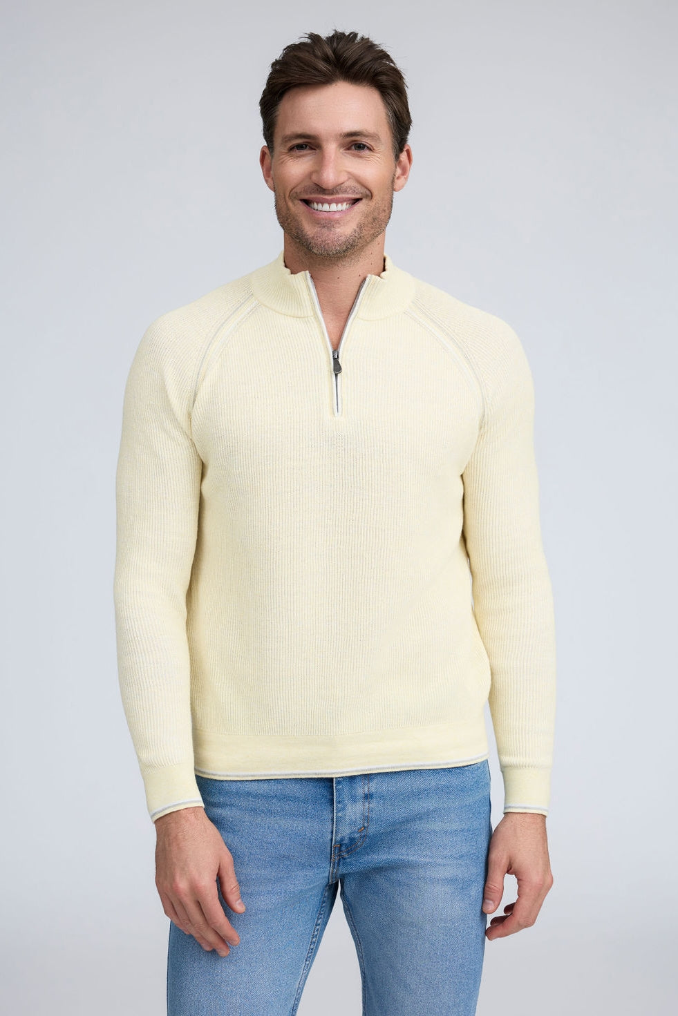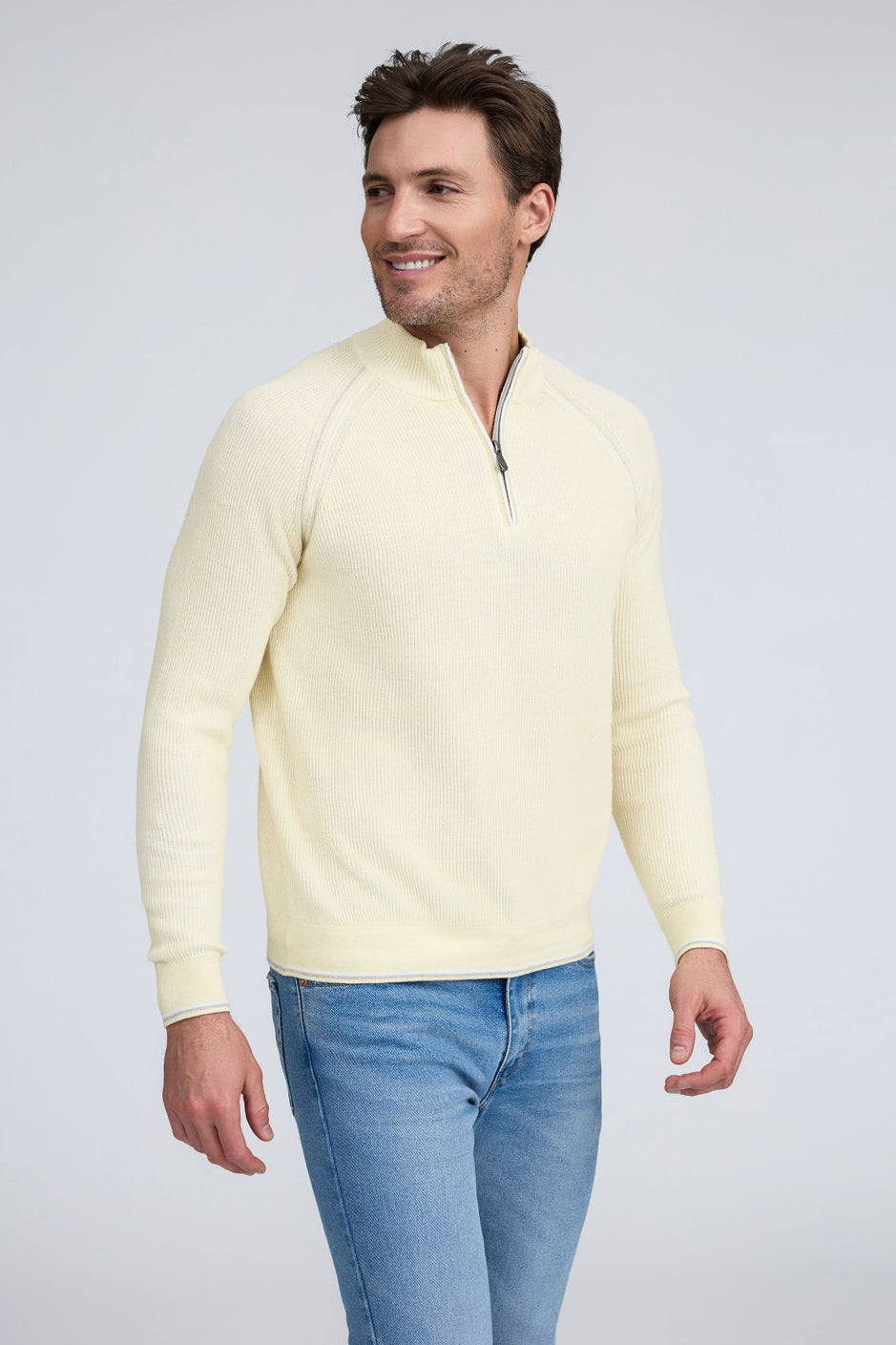 Our English Rib Knit sweater provides a refined casual look to your wardrobe. Crafted from 100% Pure Cotton, we added stitch detailing to the raglan armholes and placket trim, along with subtle contrasting color piping on the cuff and hem. The Arturo is the perfect sweater to layer over our Aqua cotton tees, adding just the right amount of warmth on a chilly day.