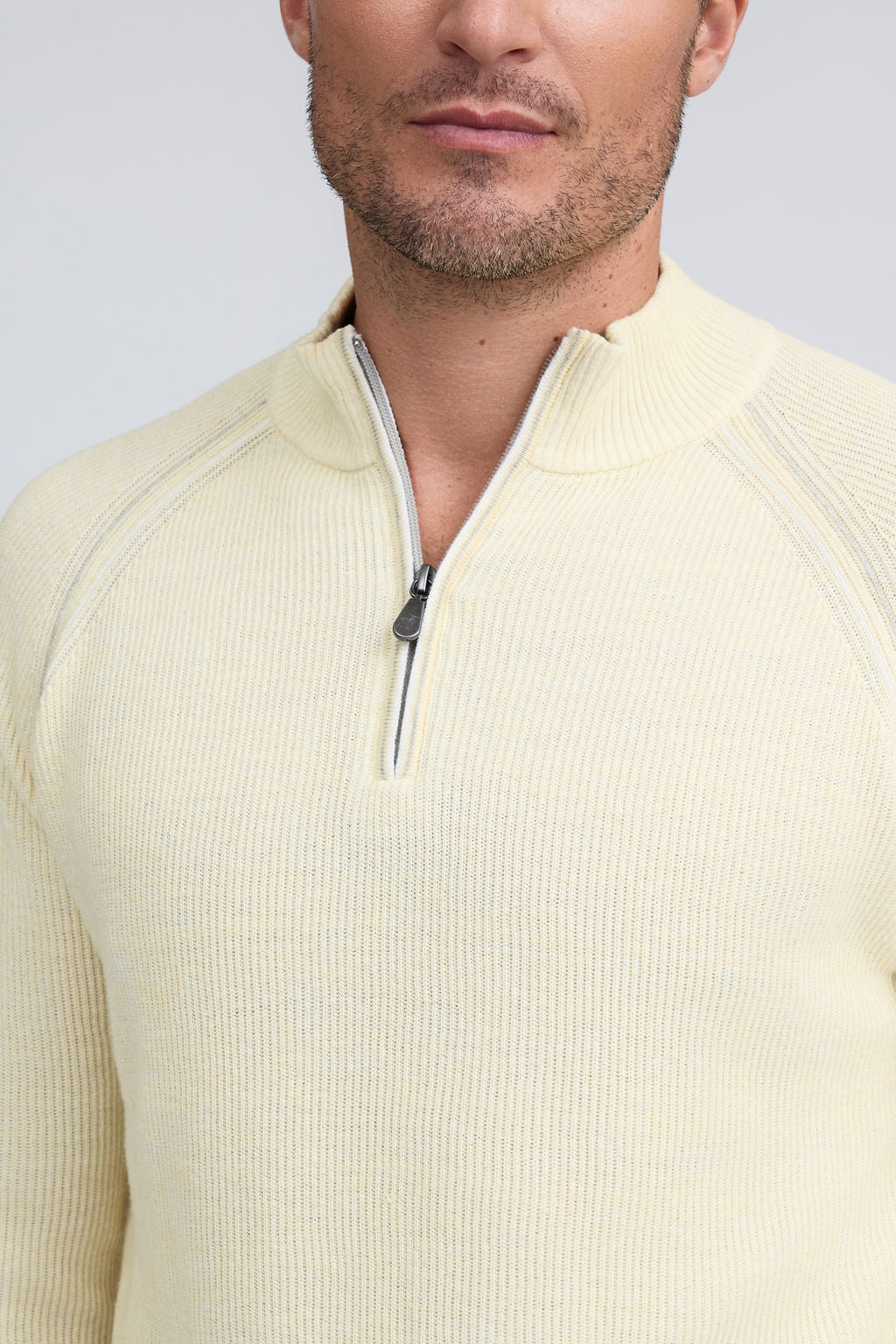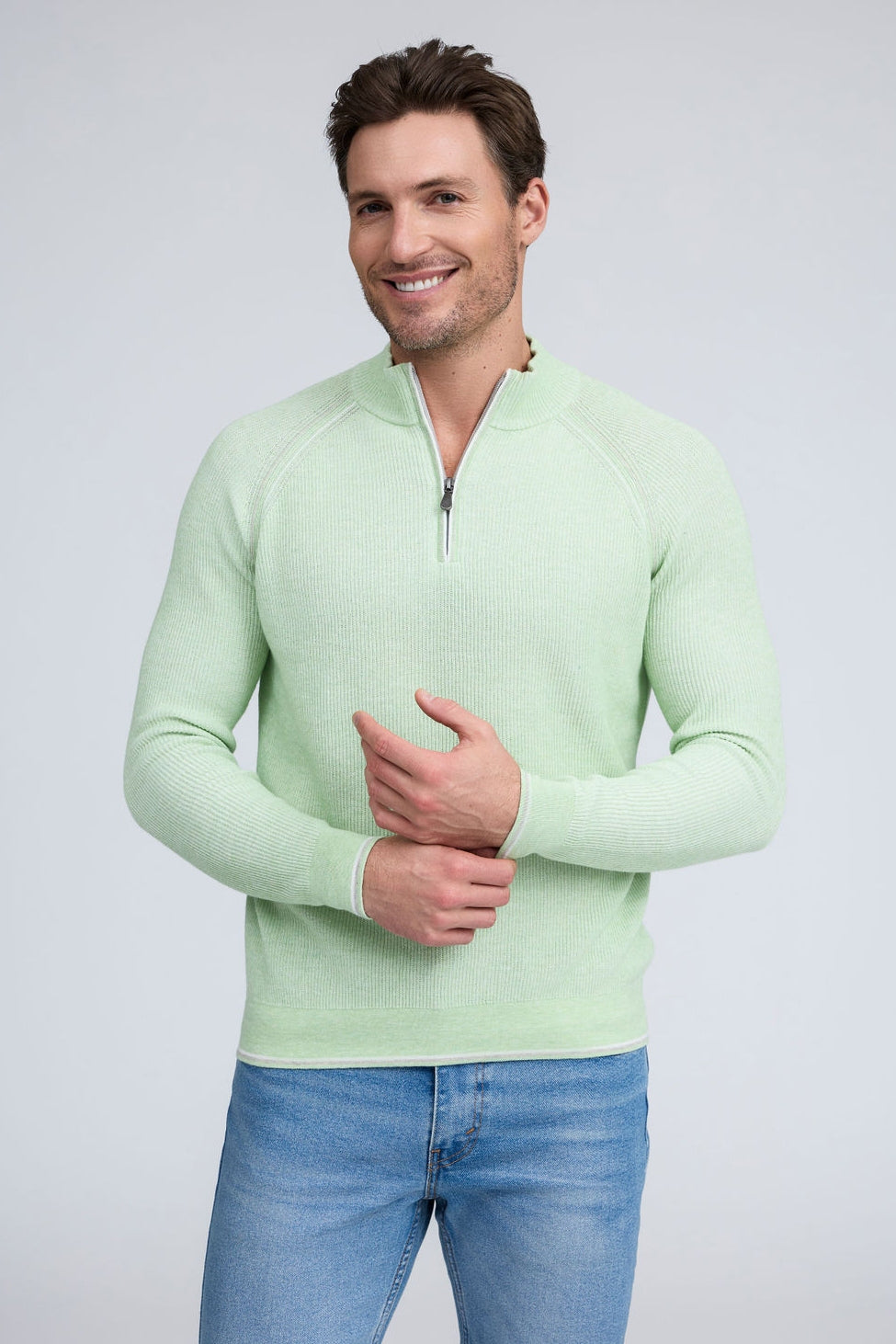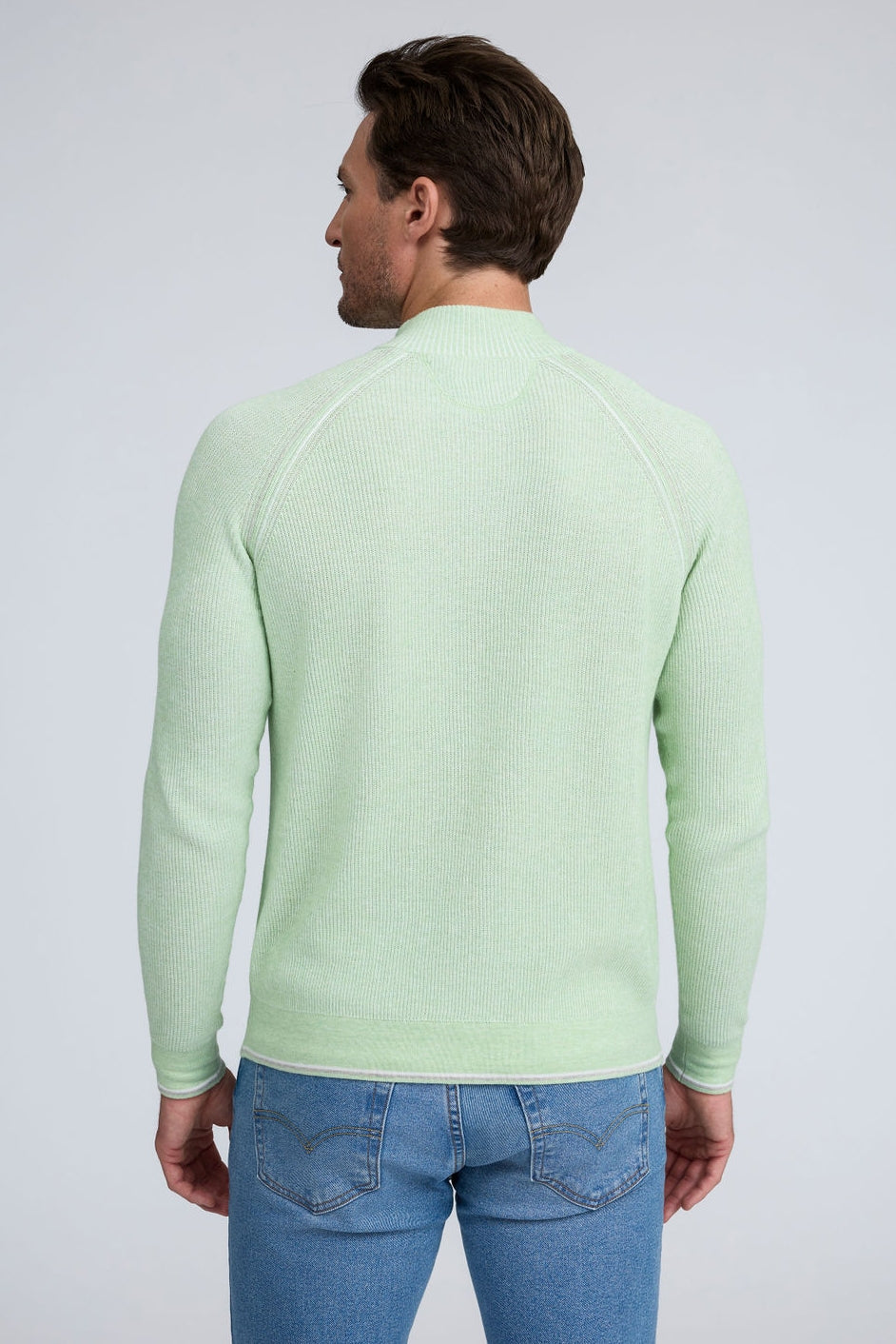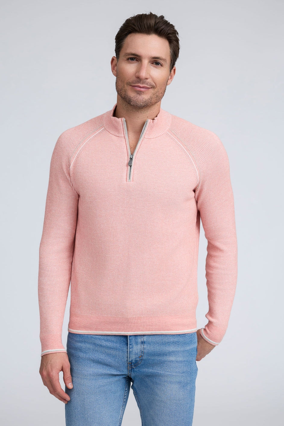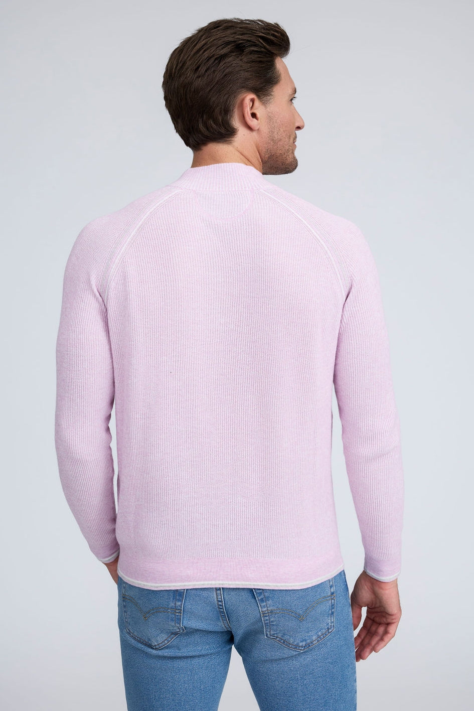 Our English Rib Knit sweater provides a refined casual look to your wardrobe. Crafted from 100% Pure Cotton, we added stitch detailing to the raglan armholes and placket trim, along with subtle contrasting color piping on the cuff and hem. The Arturo is the perfect sweater to layer over our Aqua cotton tees, adding just the right amount of warmth on a chilly day.