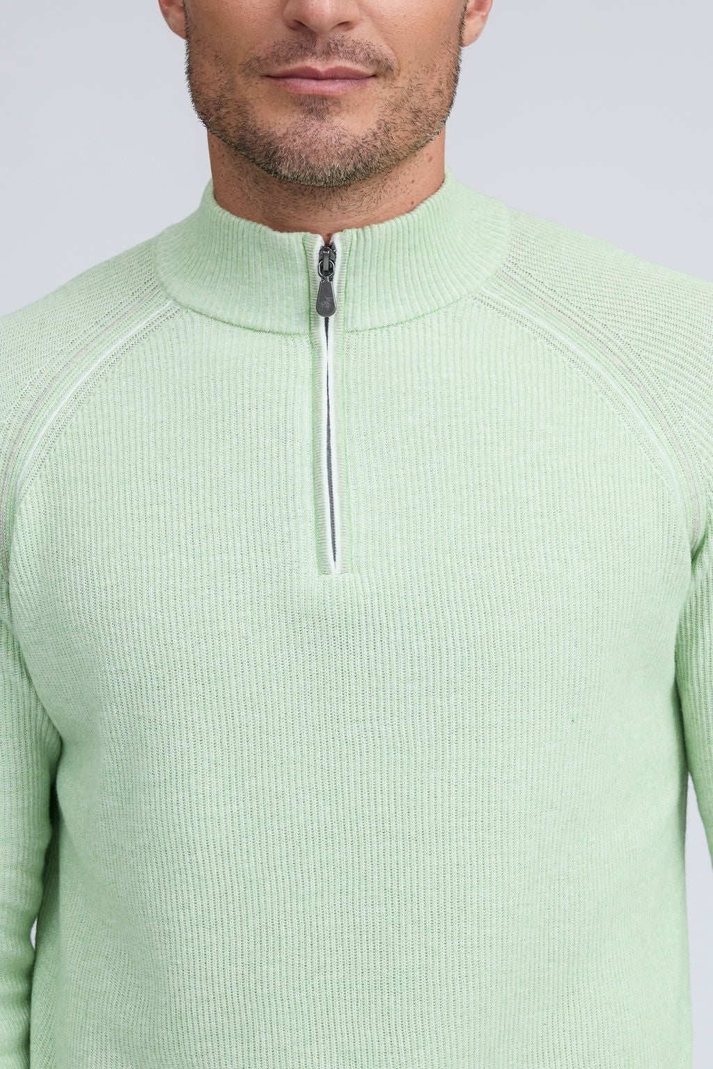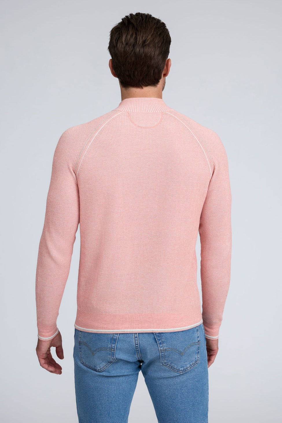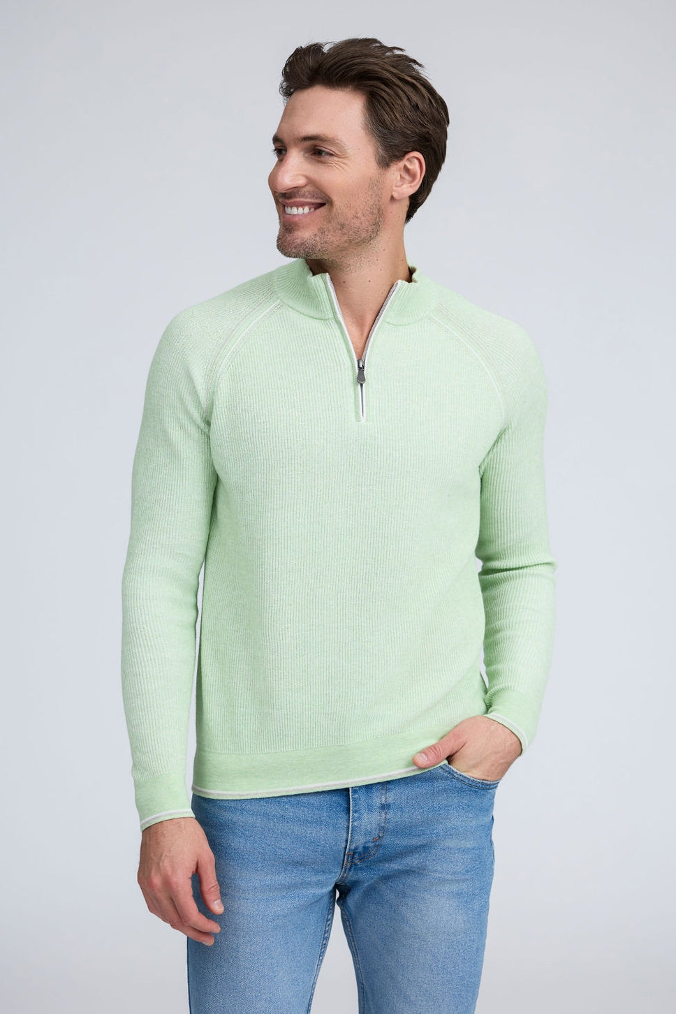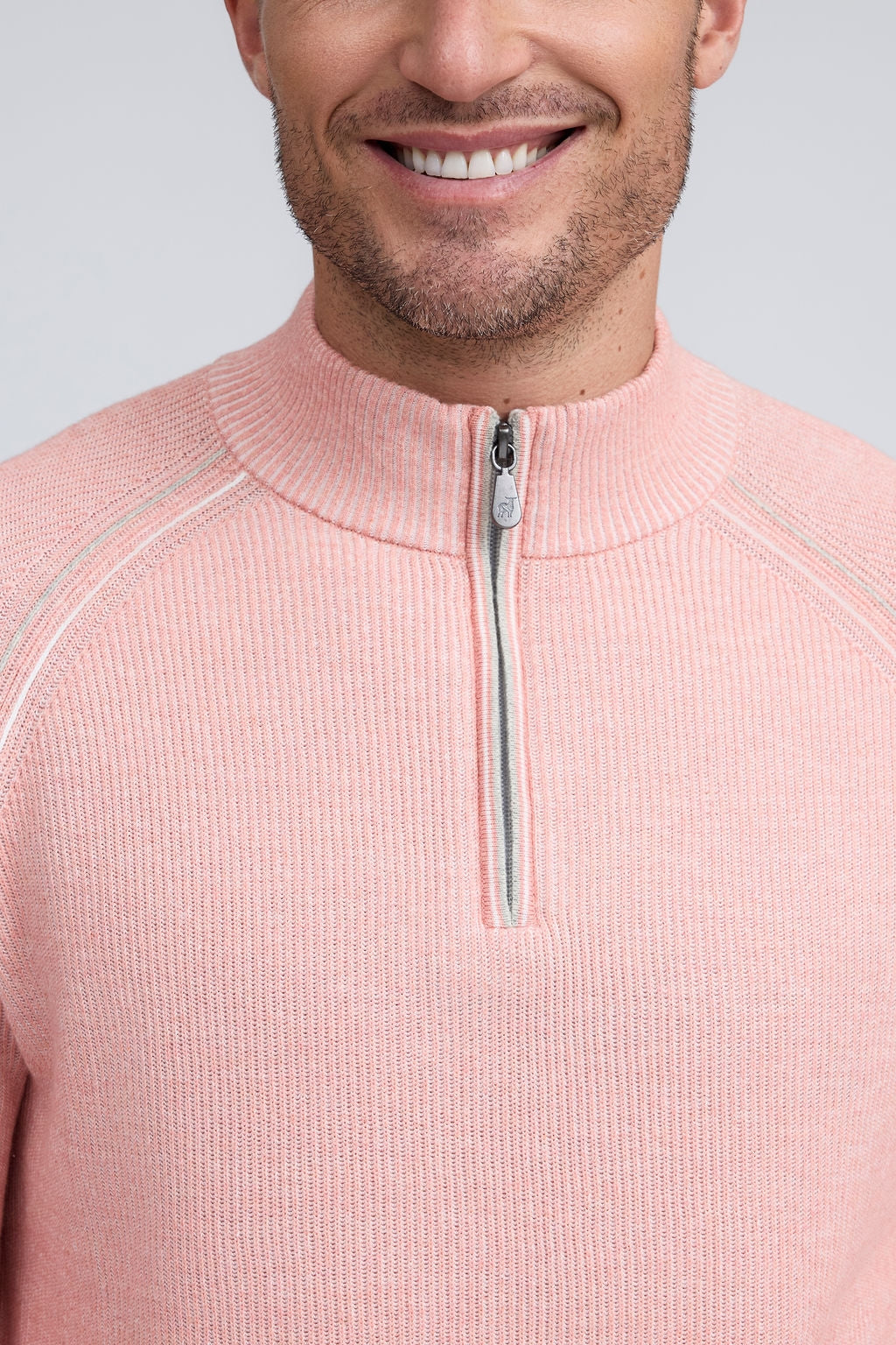 Our English Rib Knit sweater provides a refined casual look to your wardrobe. Crafted from 100% Pure Cotton, we added stitch detailing to the raglan armholes and placket trim, along with subtle contrasting color piping on the cuff and hem. The Arturo is the perfect sweater to layer over our Aqua cotton tees, adding just the right amount of warmth on a chilly day.