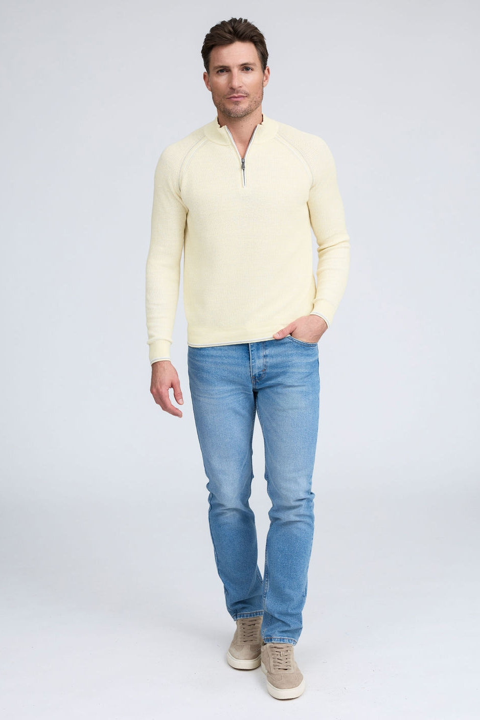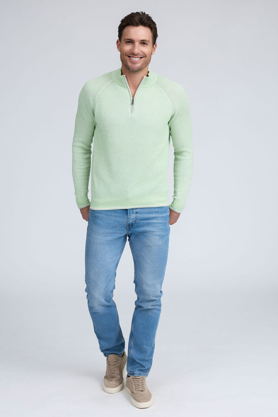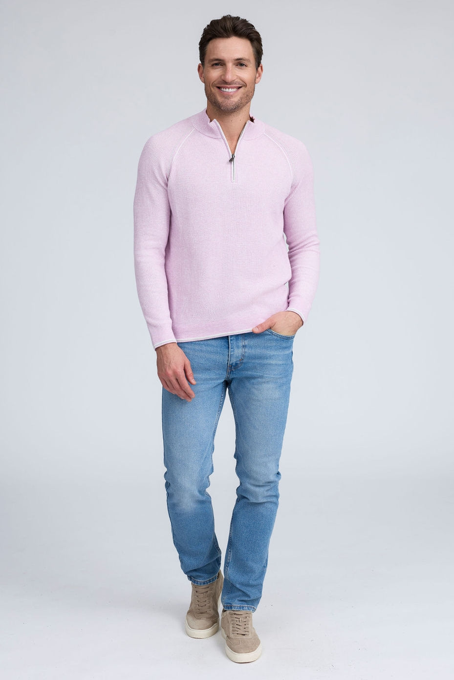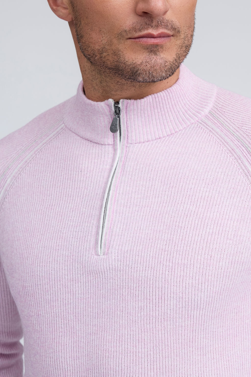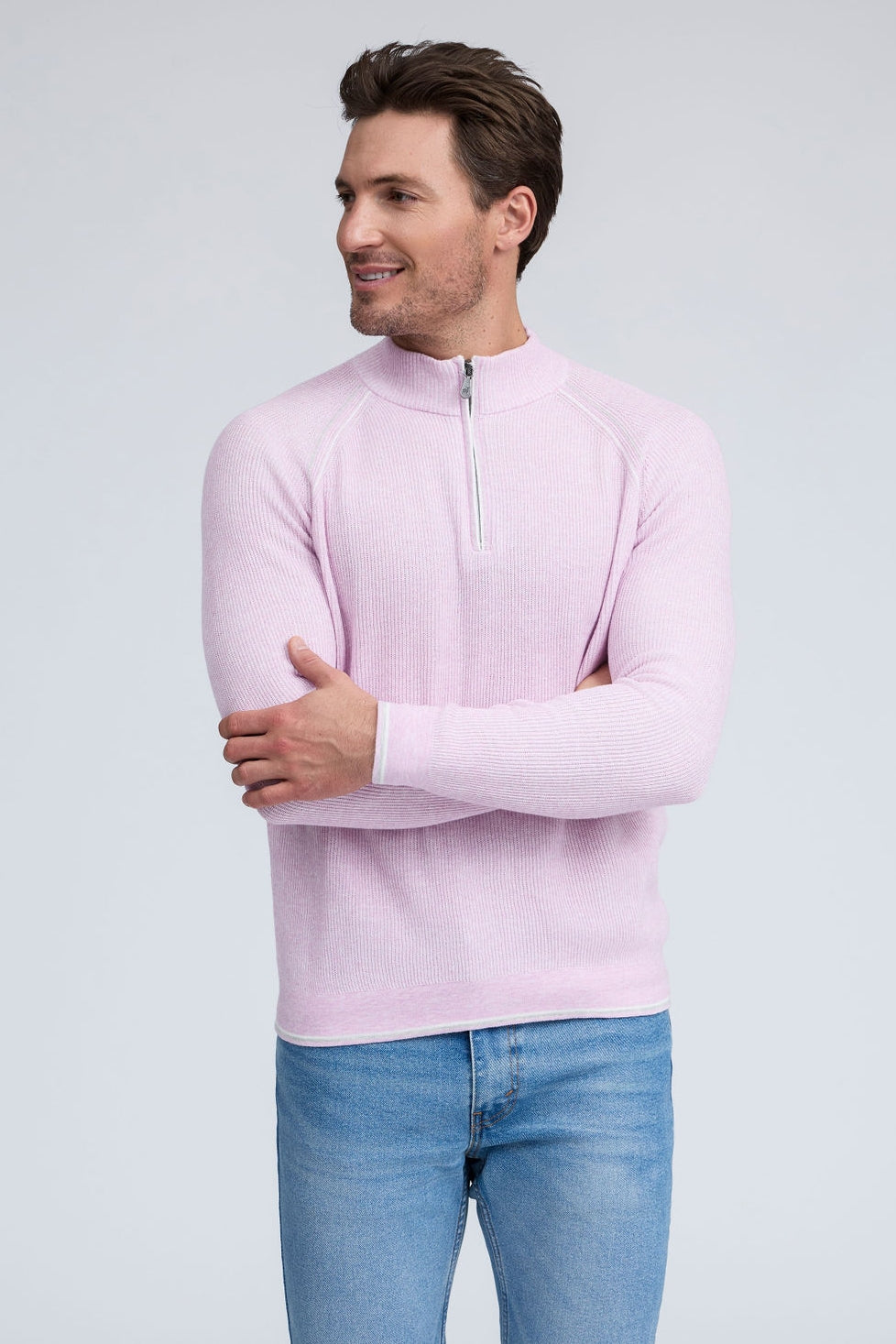 Our English Rib Knit sweater provides a refined casual look to your wardrobe. Crafted from 100% Pure Cotton, we added stitch detailing to the raglan armholes and placket trim, along with subtle contrasting color piping on the cuff and hem. The Arturo is the perfect sweater to layer over our Aqua cotton tees, adding just the right amount of warmth on a chilly day.