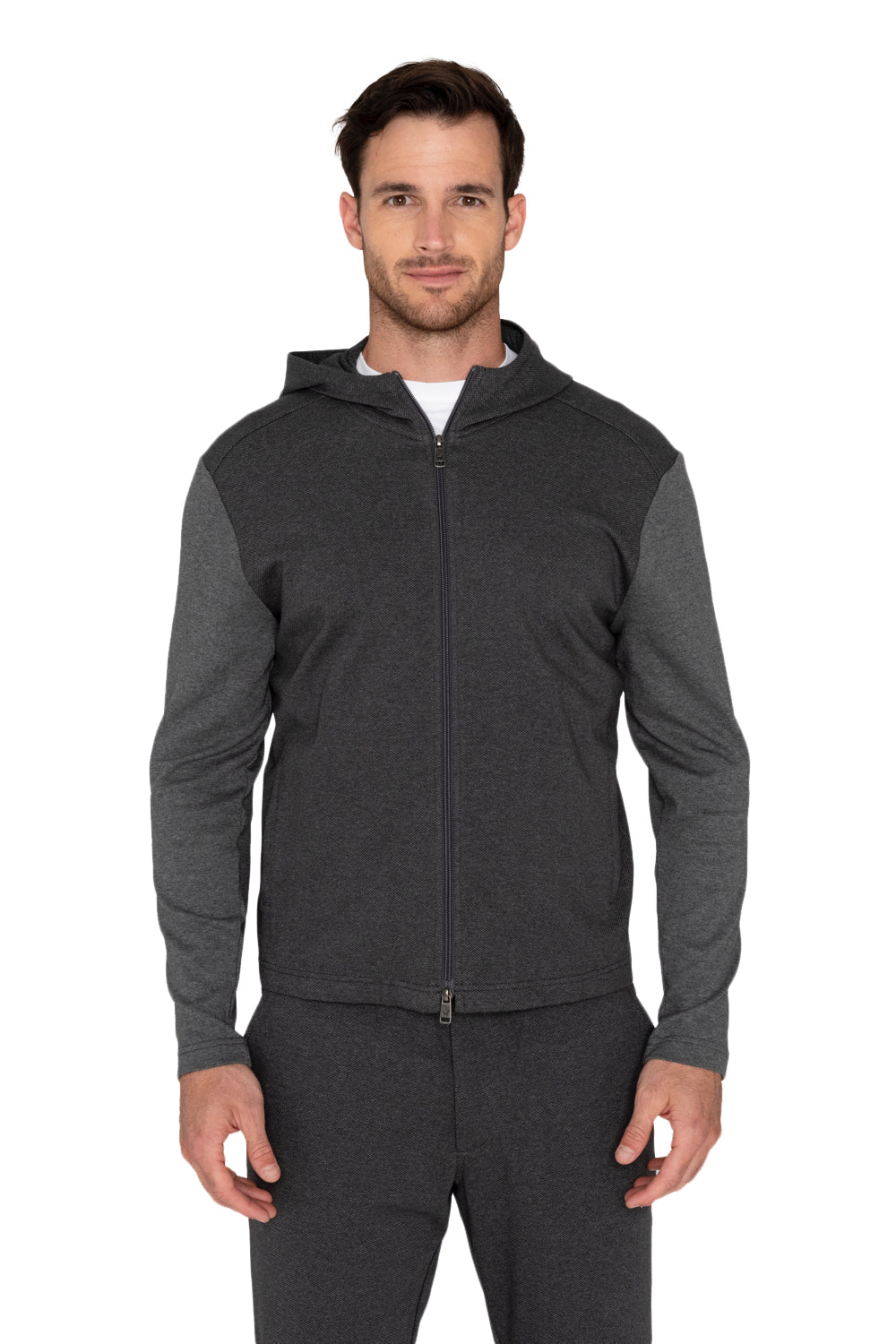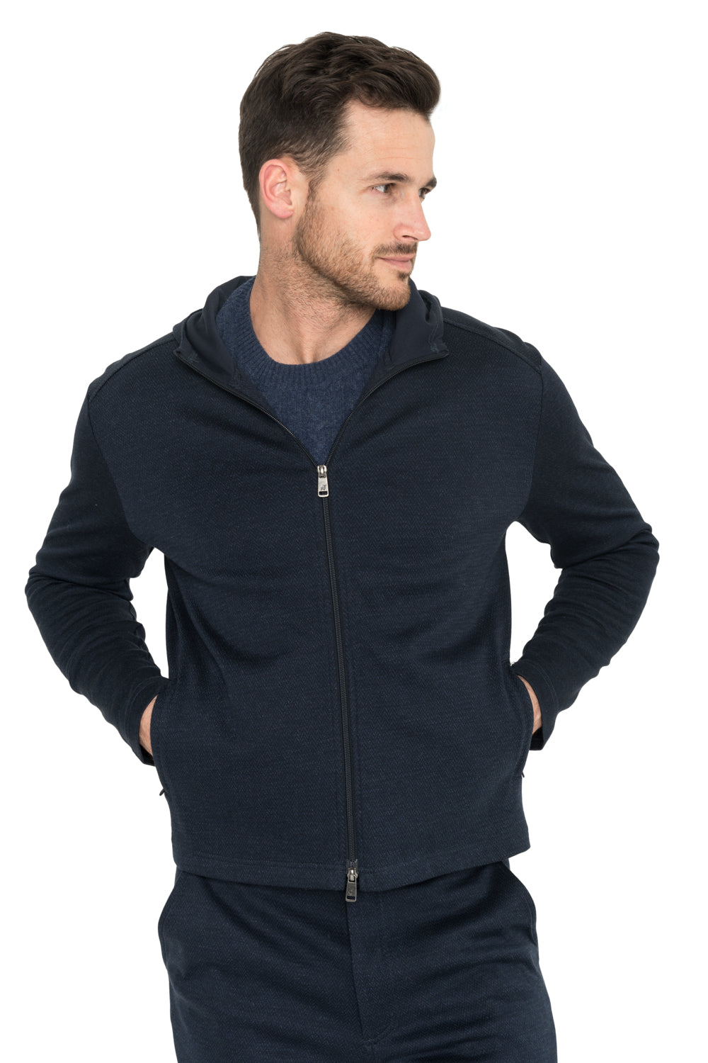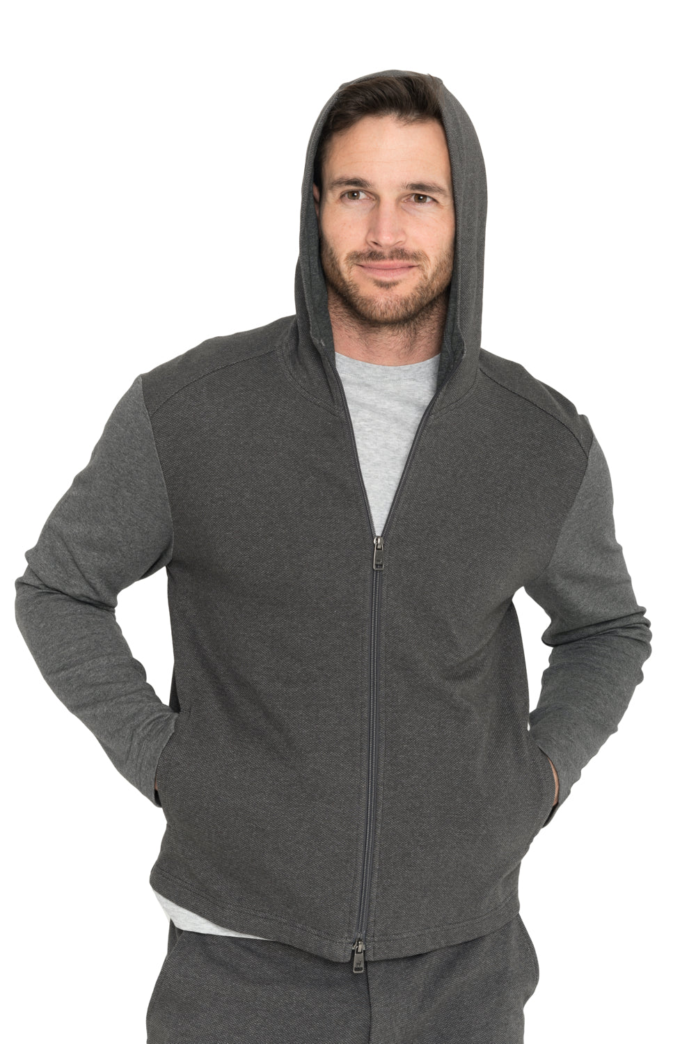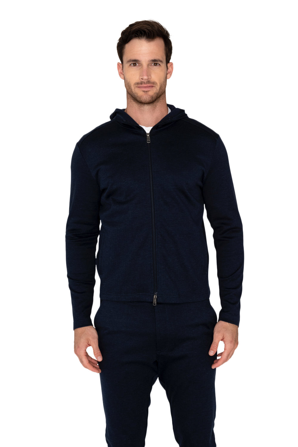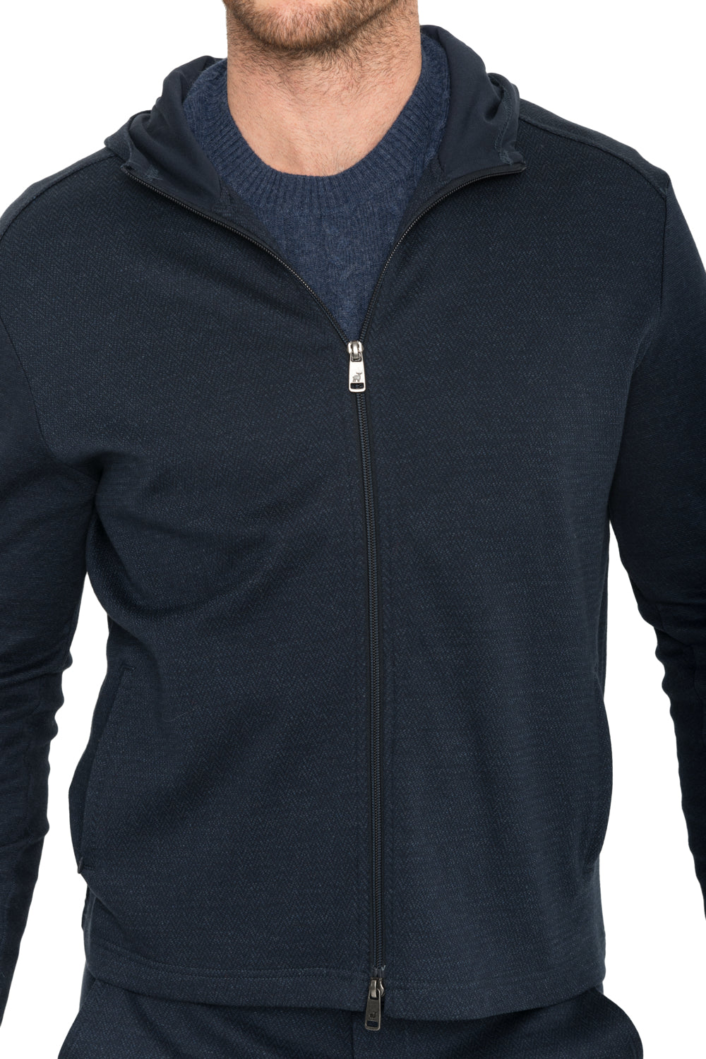 Our aqua cotton zip hoodie made in the charcoal birdseye and the navy herringbone. The jacquard weave gives subtle detailing that elevates one of our best selling hoodies.