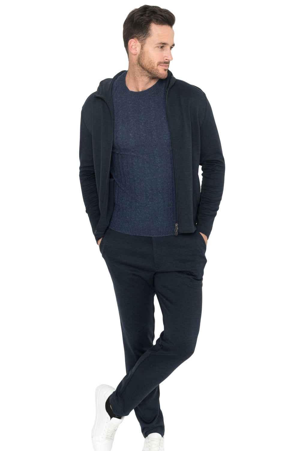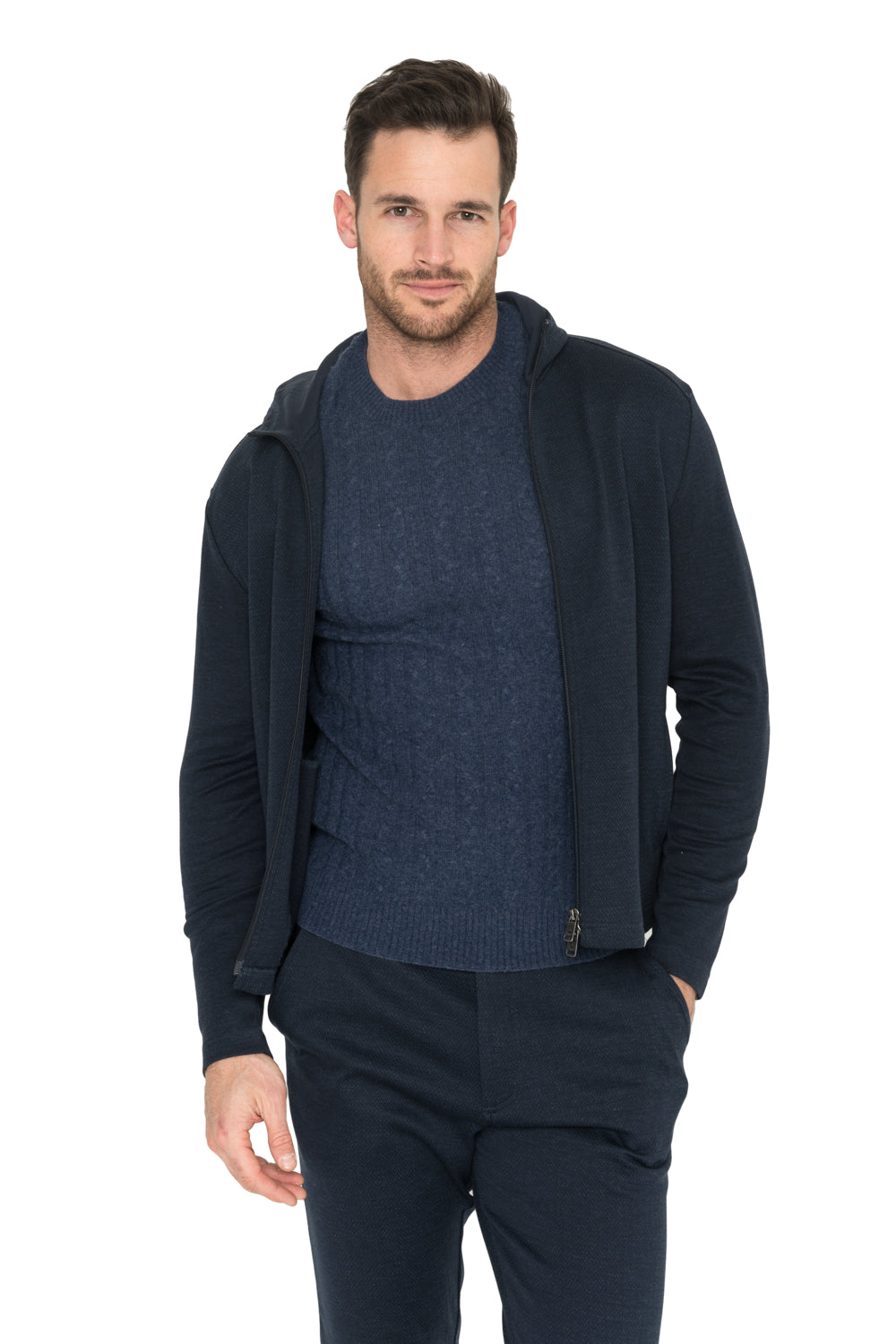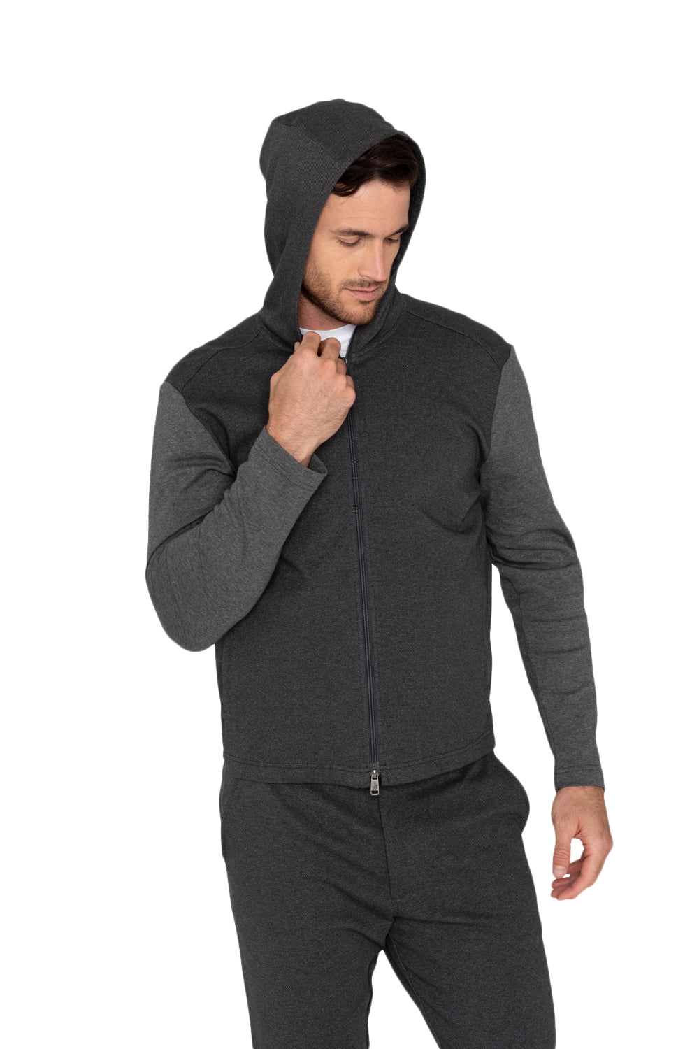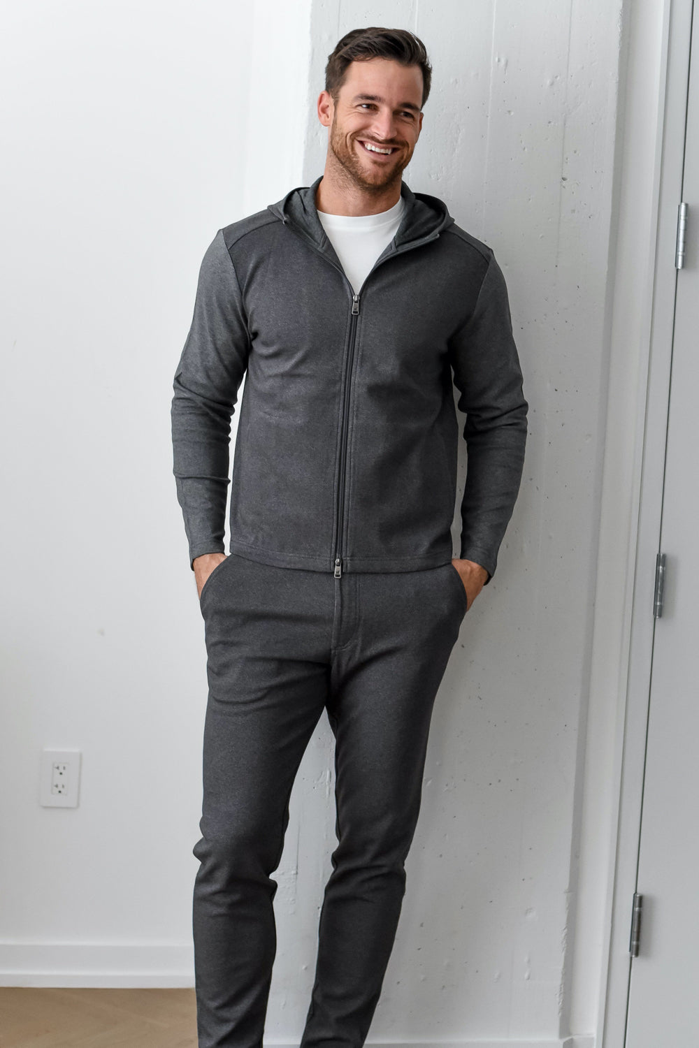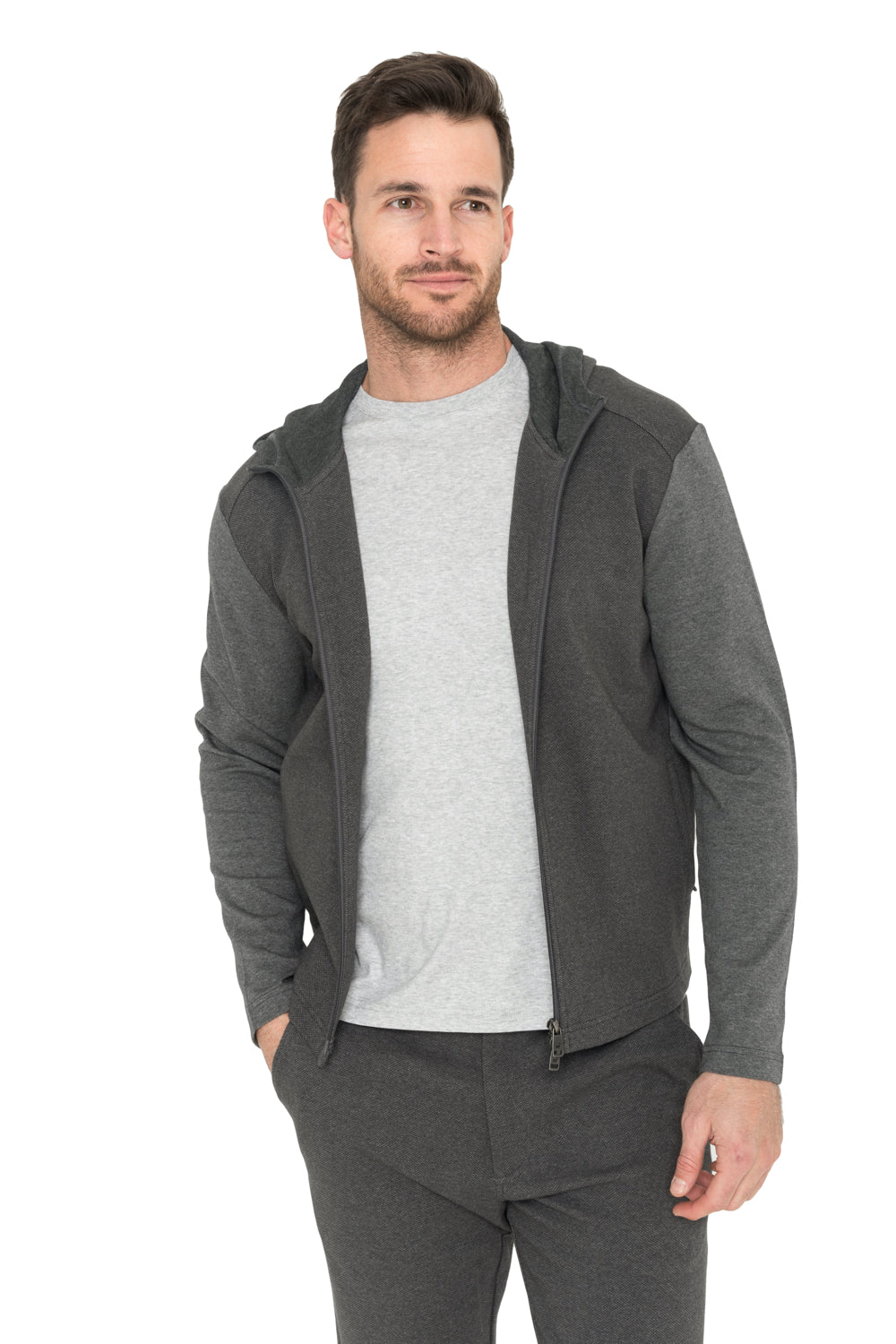 Our aqua cotton zip hoodie made in the charcoal birdseye and the navy herringbone. The jacquard weave gives subtle detailing that elevates one of our best selling hoodies.
