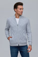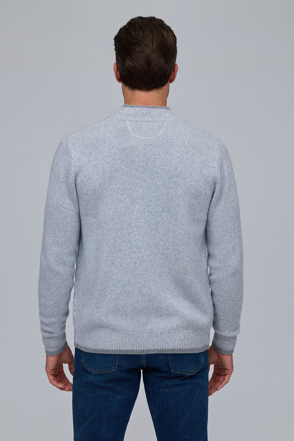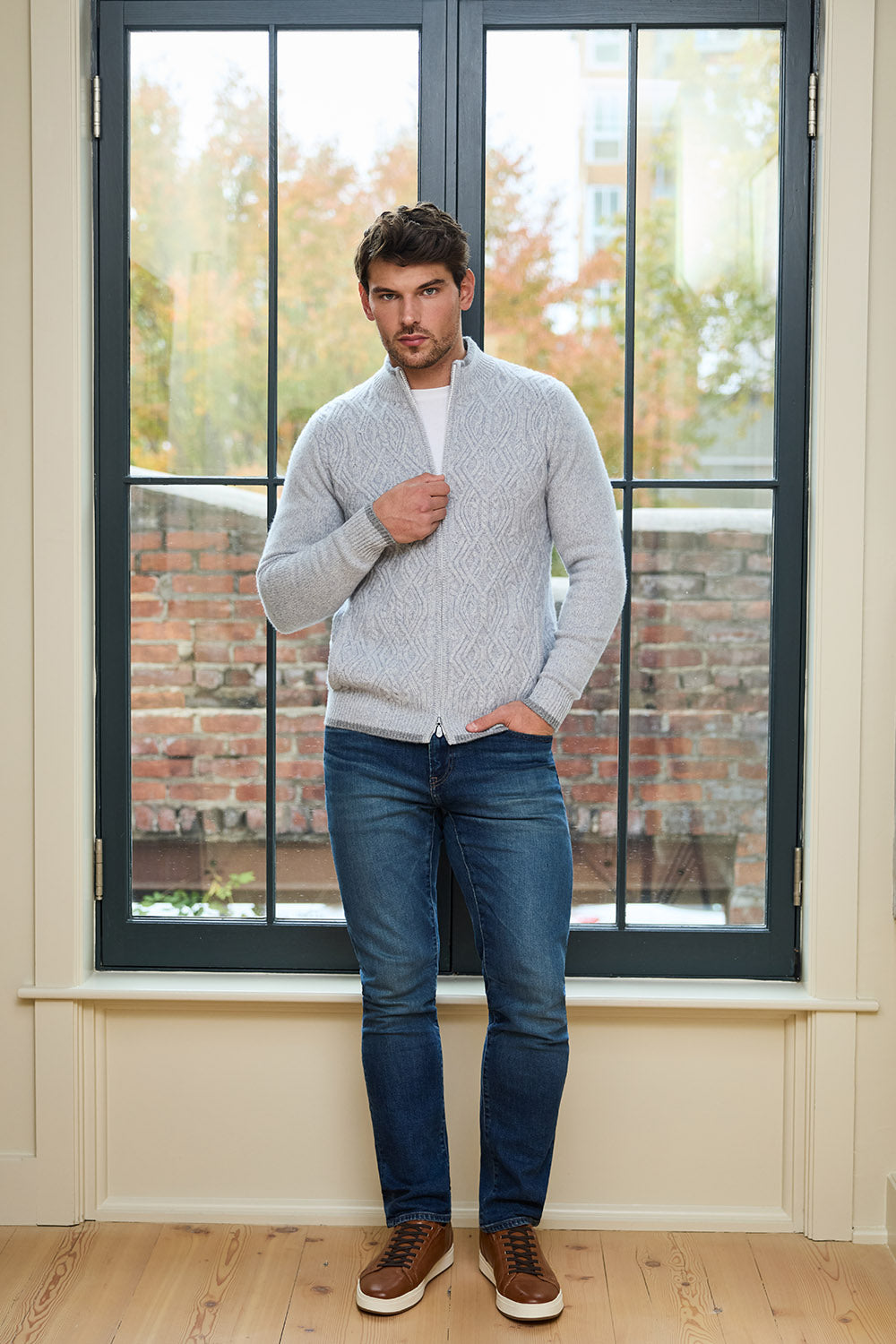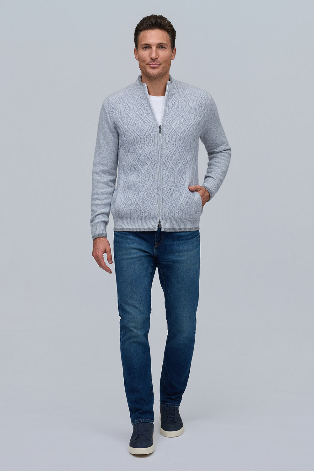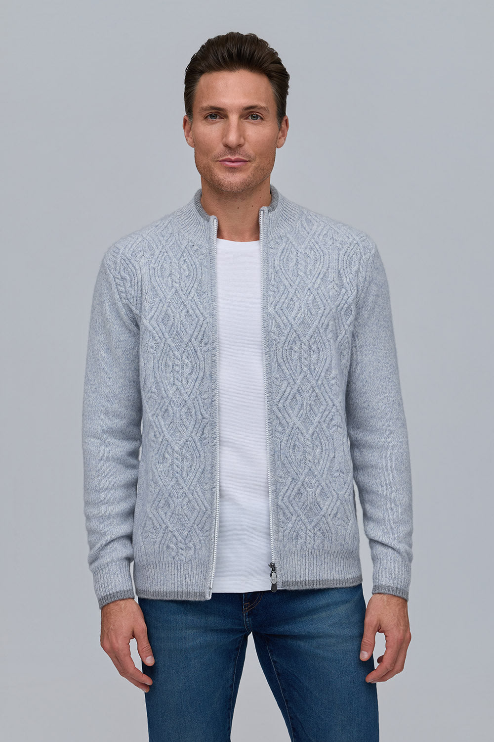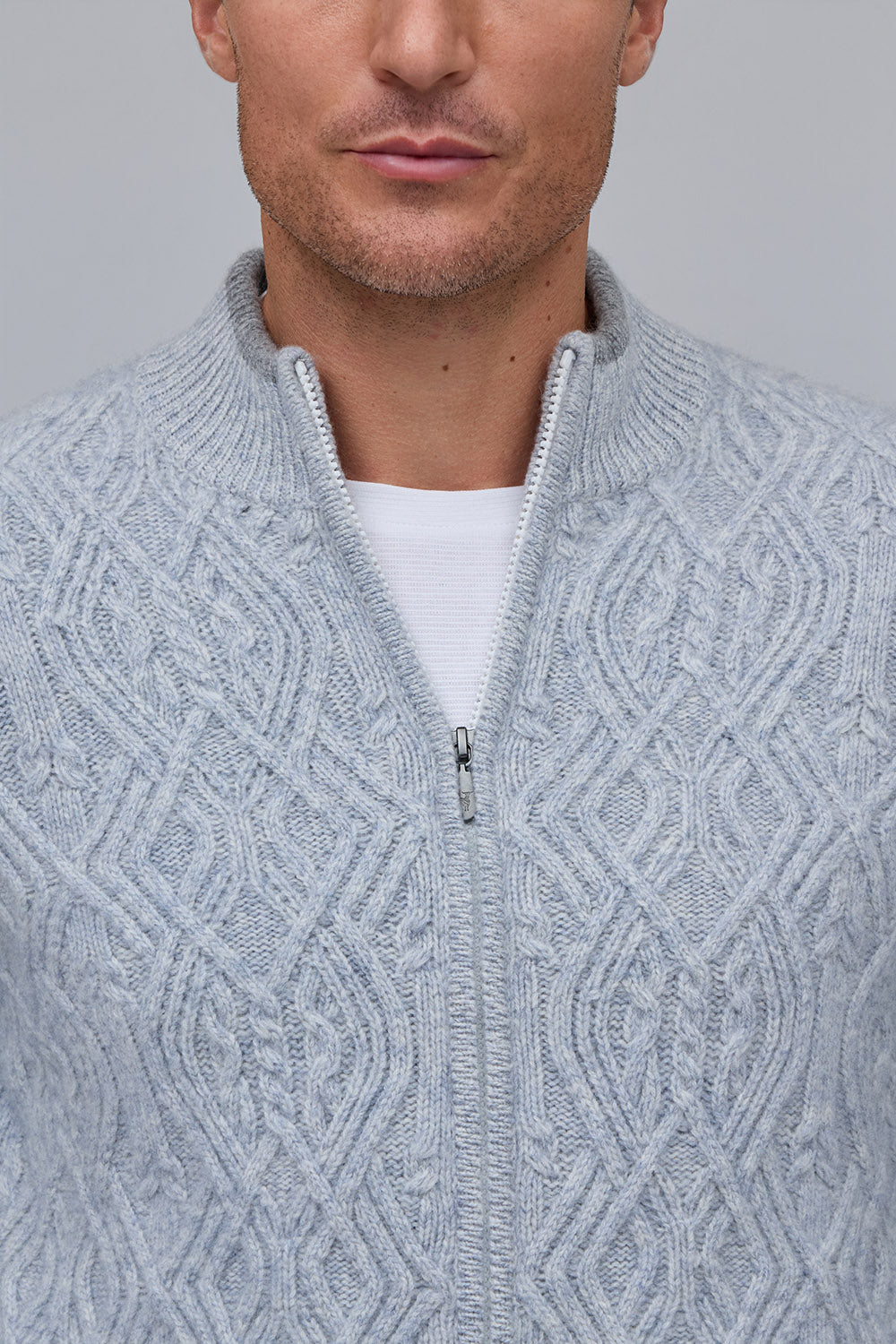 This luxurious mouline tweed jacket blends warmth and style in a premium 70% wool, 30% cashmere blend. Featuring a textured cable knit front, sleek zip closure, and refined grey trim, it’s an elegant cold-weather essential.