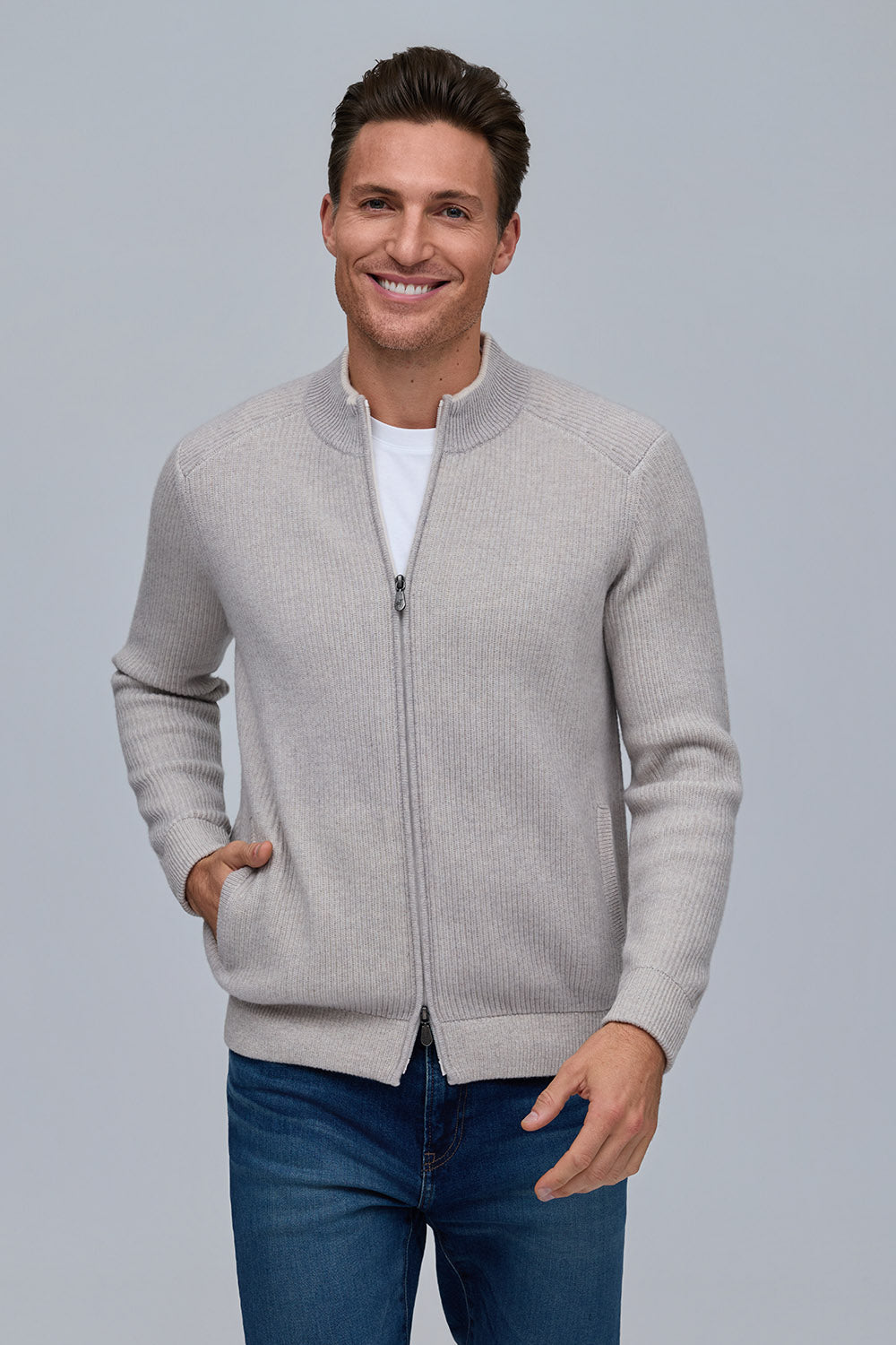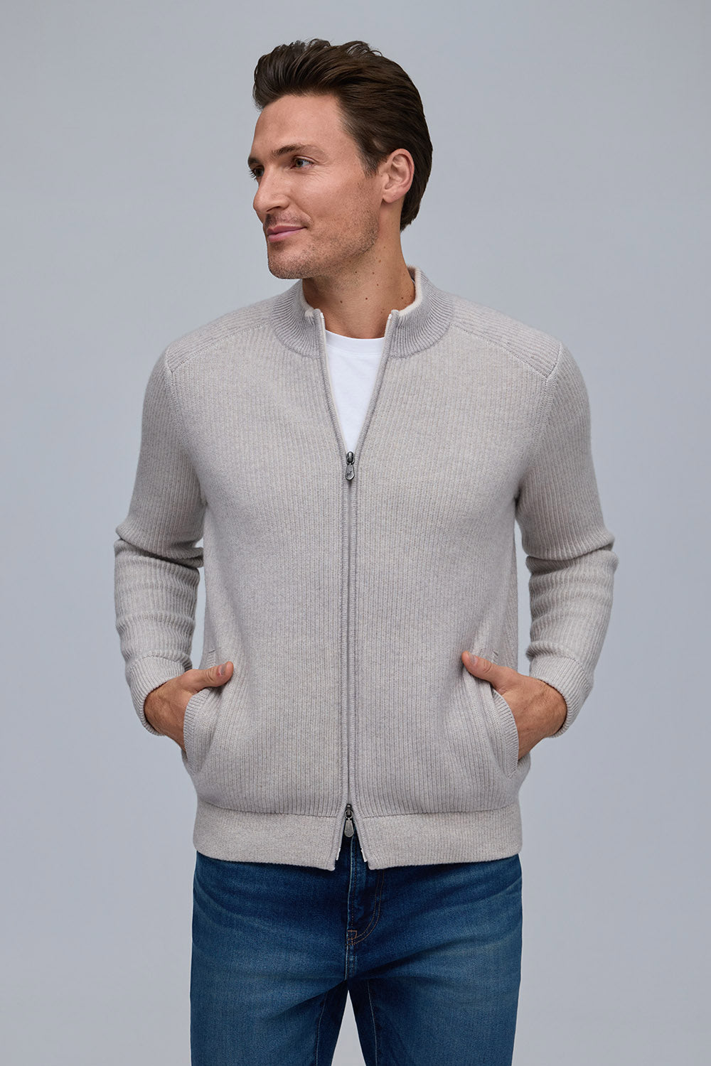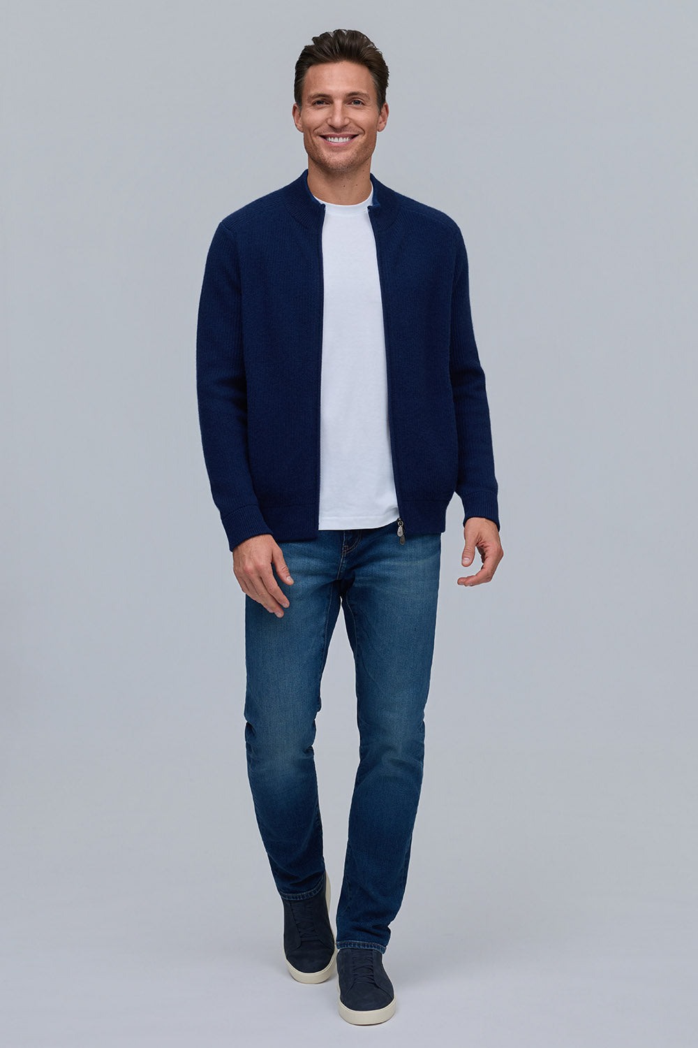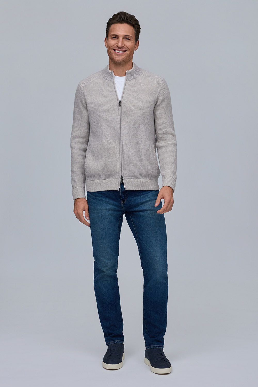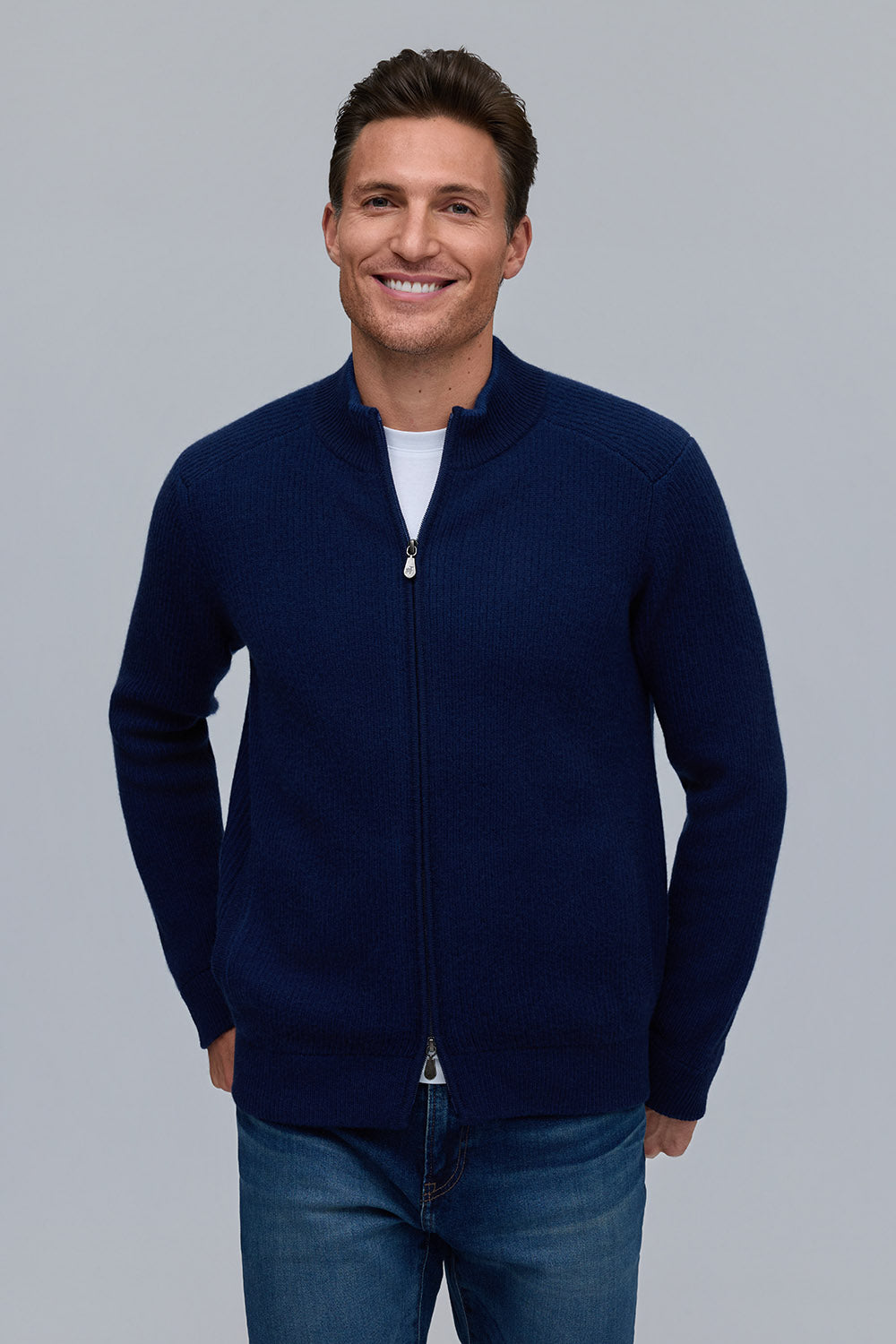 Crafted from a rich 90% wool, 10% cashmere blend, the Vanise English rib jacket offers exceptional warmth and softness. Featuring a full-zip front and refined ribbed texture, it combines timeless style with modern versatility. Available in classic cloud and navy, it pairs seamlessly with the matching Solace hat and Reno scarf for a complete, elevated look.