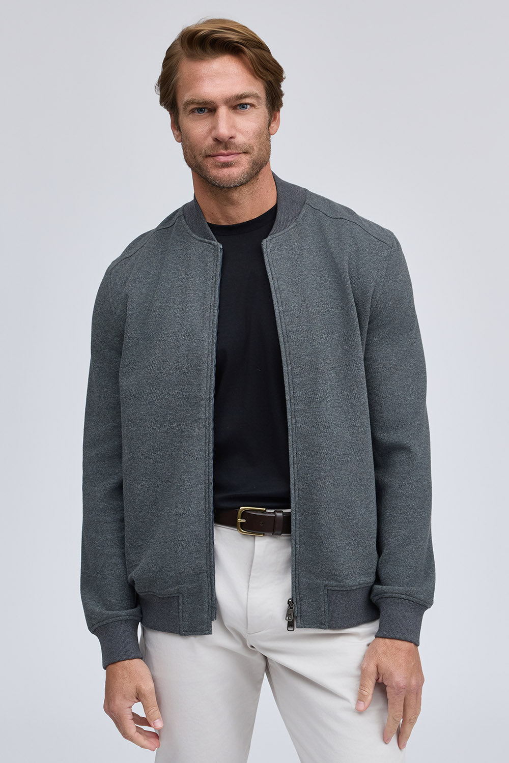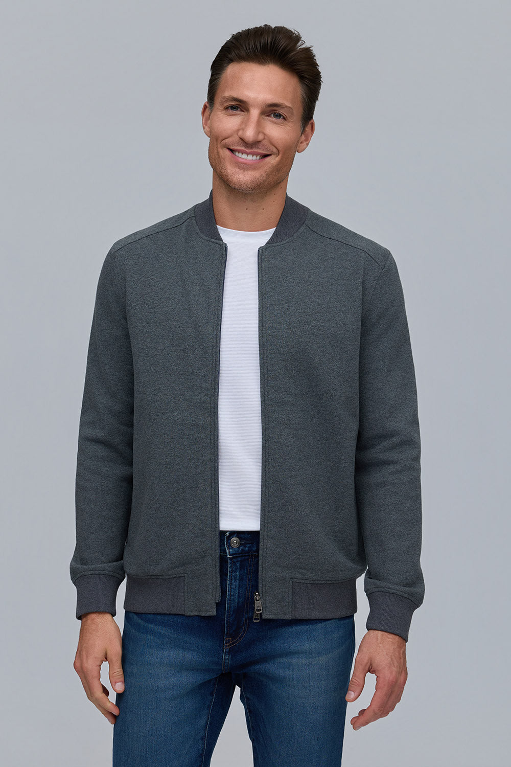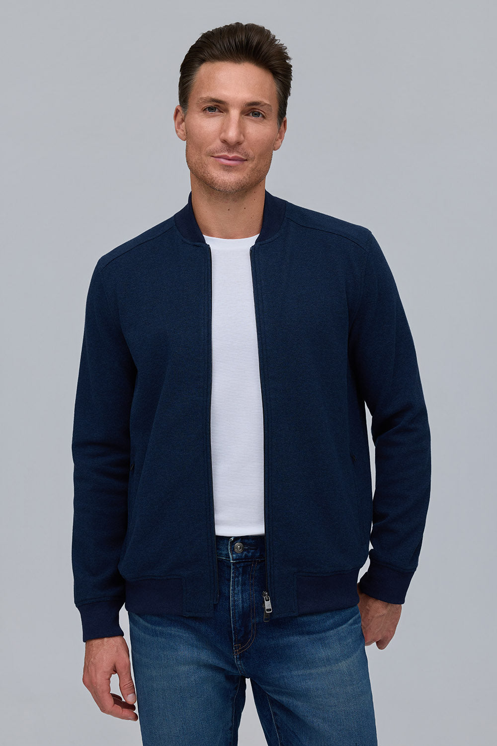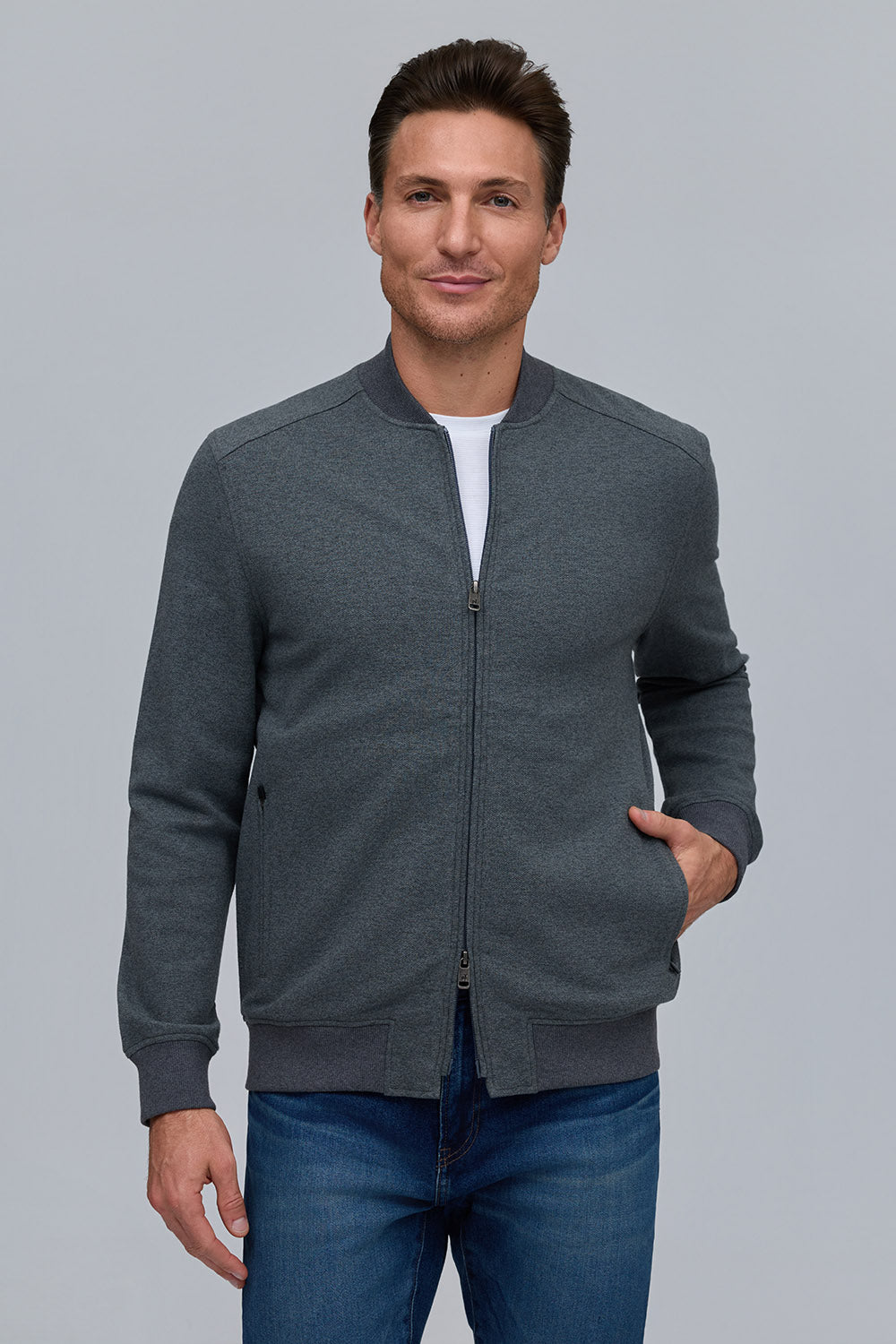 Crafted from a textured cotton blend, this modern bomber features a full zip front and sleek side zip pockets. A versatile layer with elevated style—perfect for transitional weather.