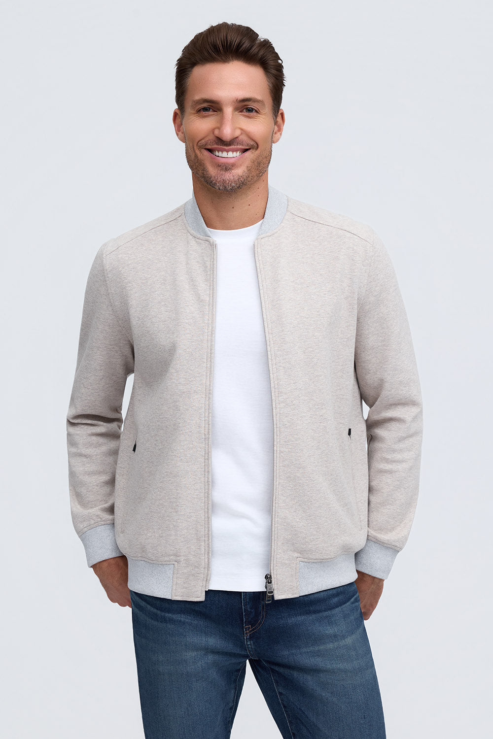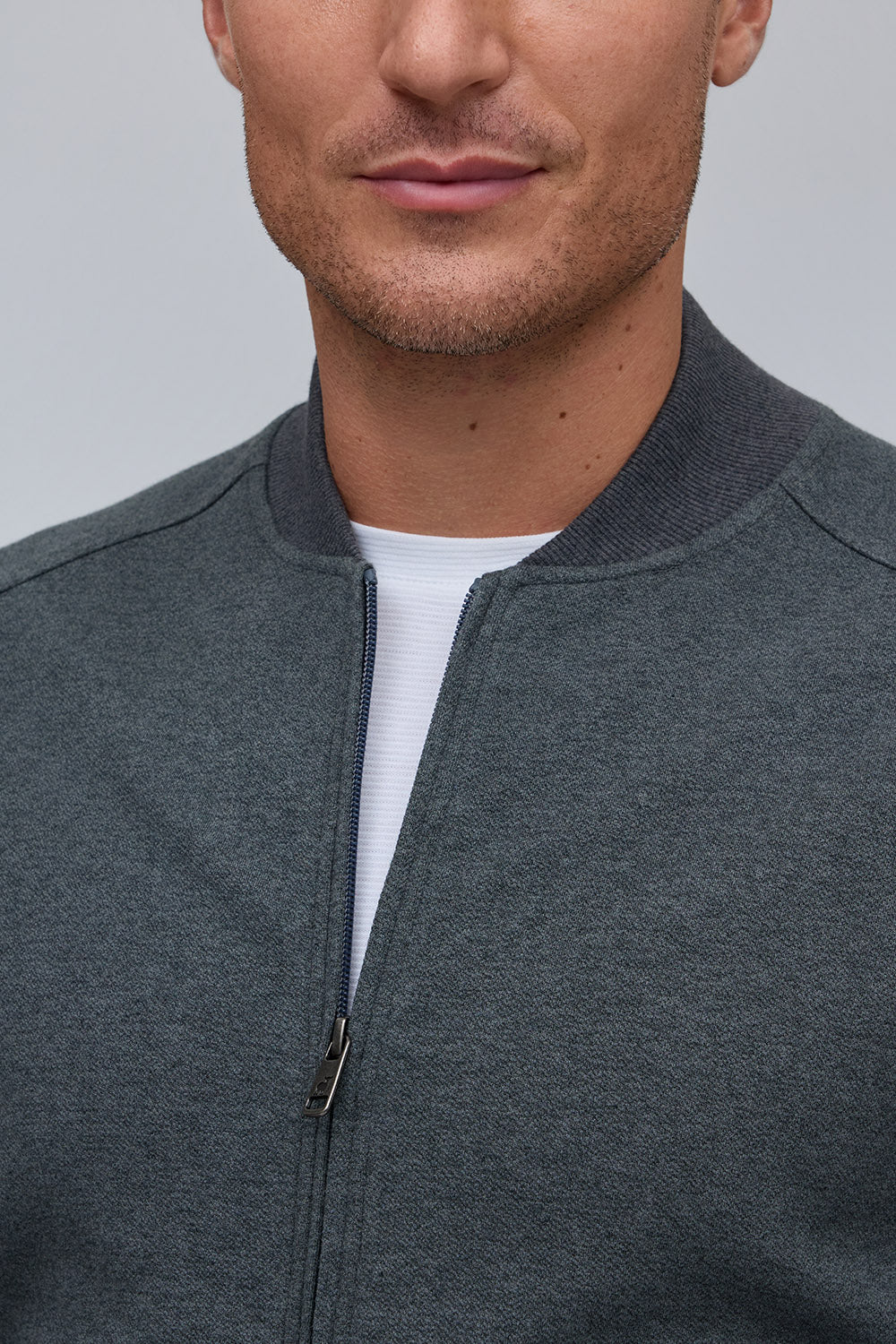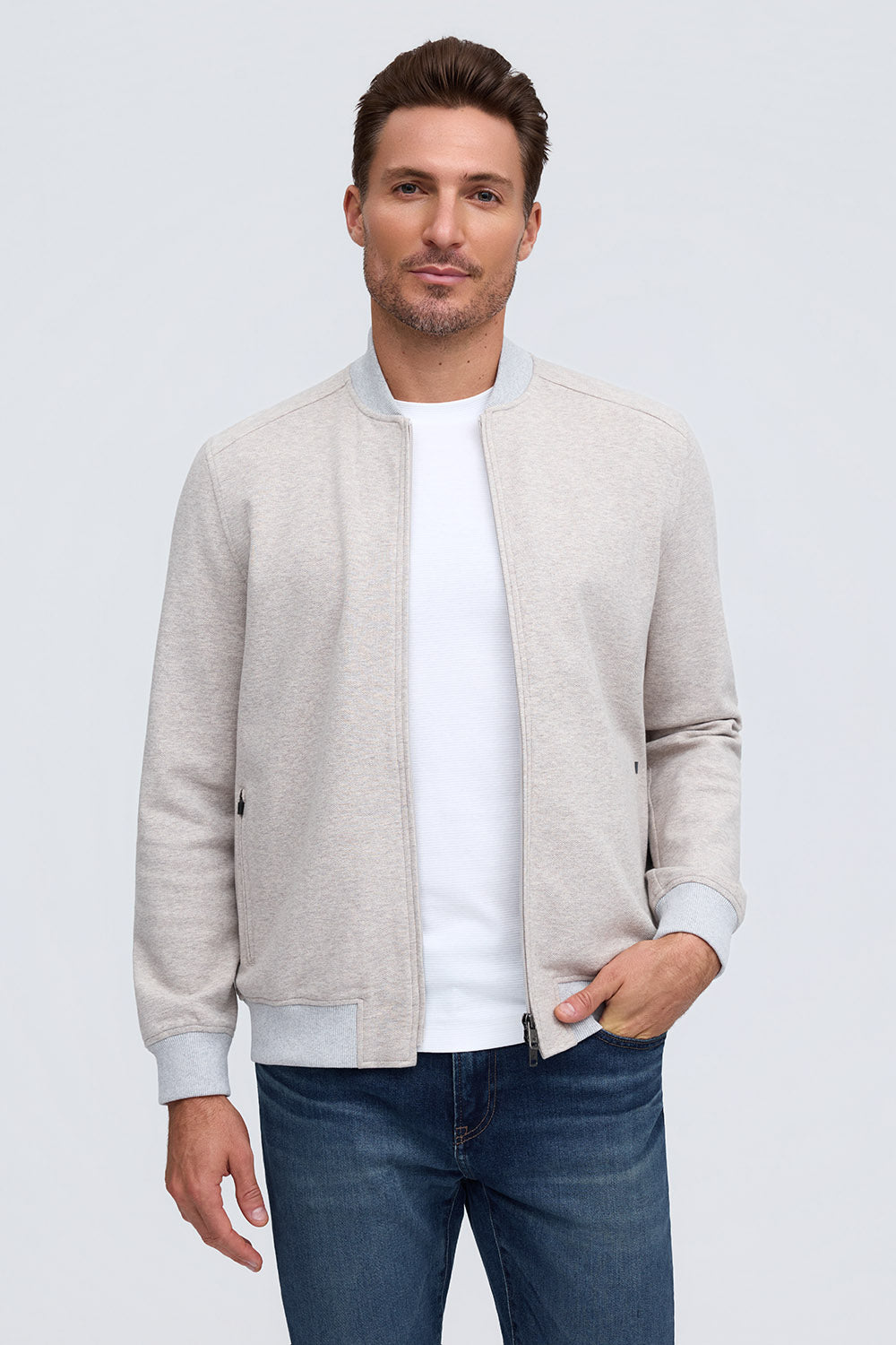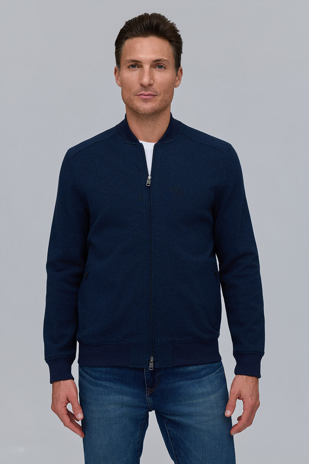 Crafted from a textured cotton blend, this modern bomber features a full zip front and sleek side zip pockets. A versatile layer with elevated style—perfect for transitional weather.