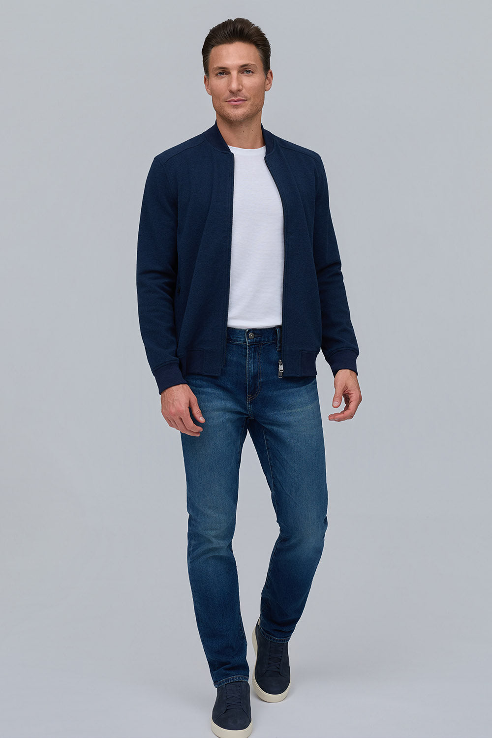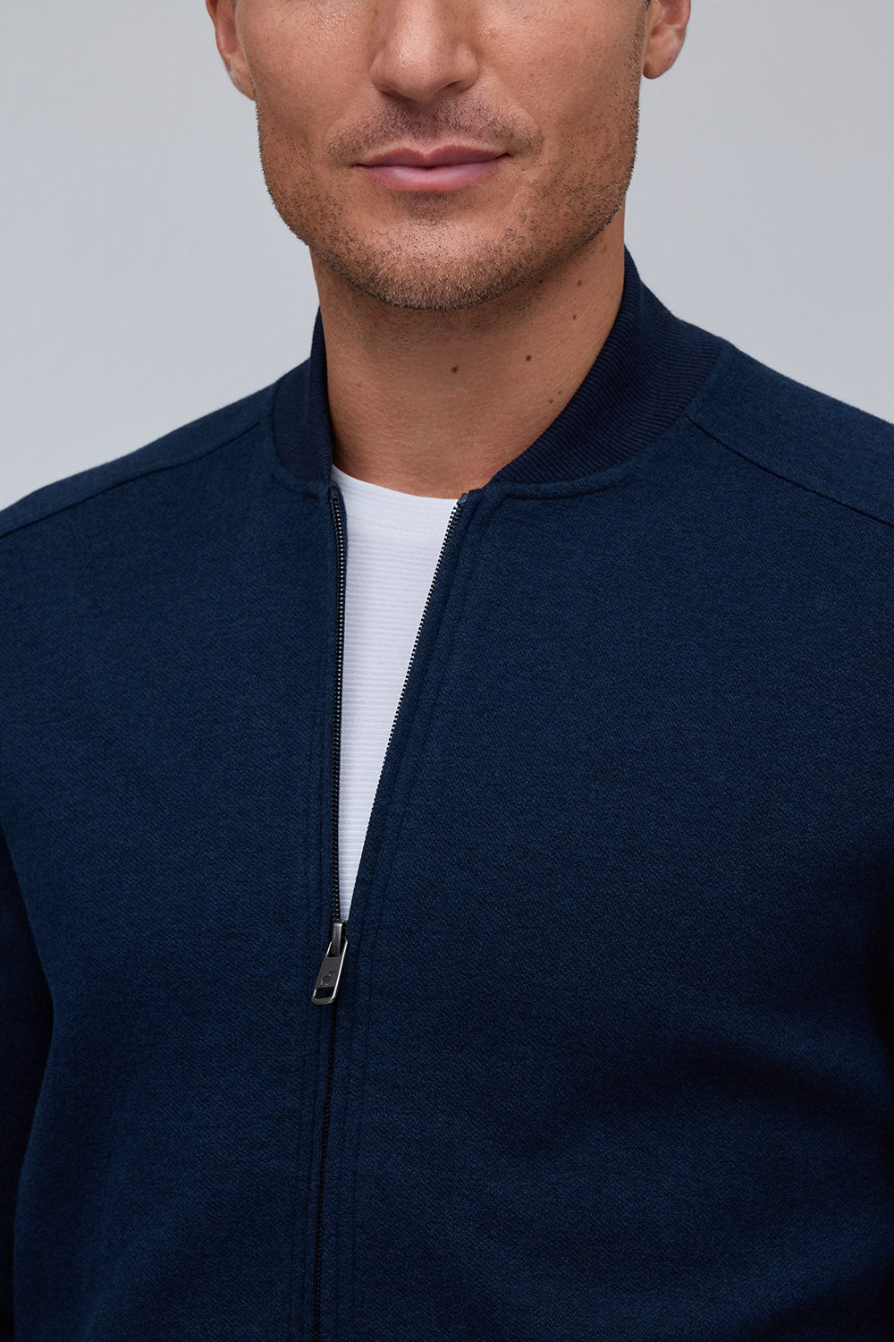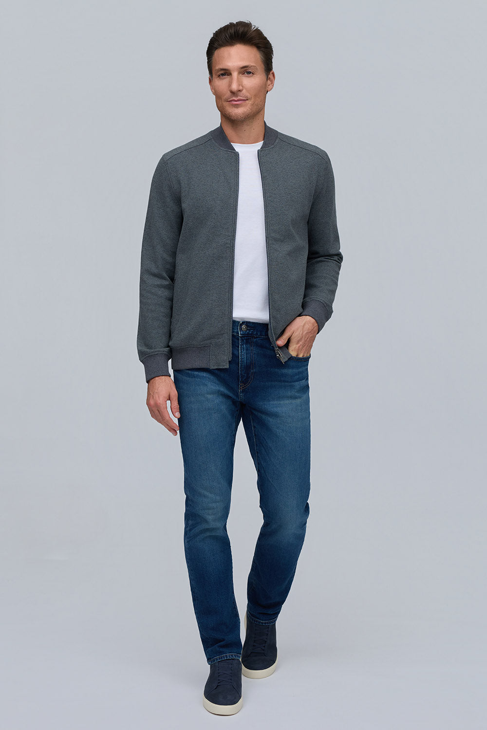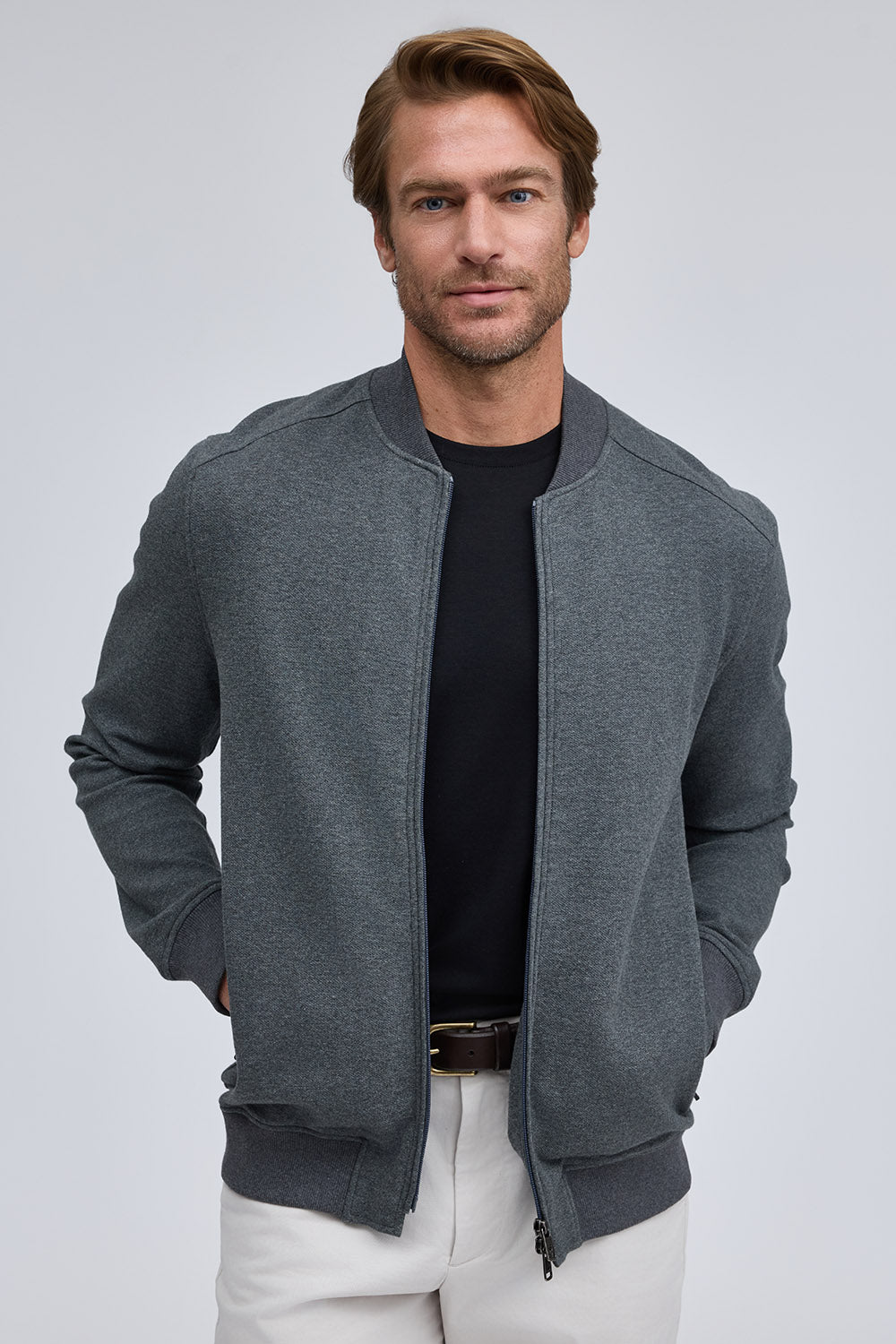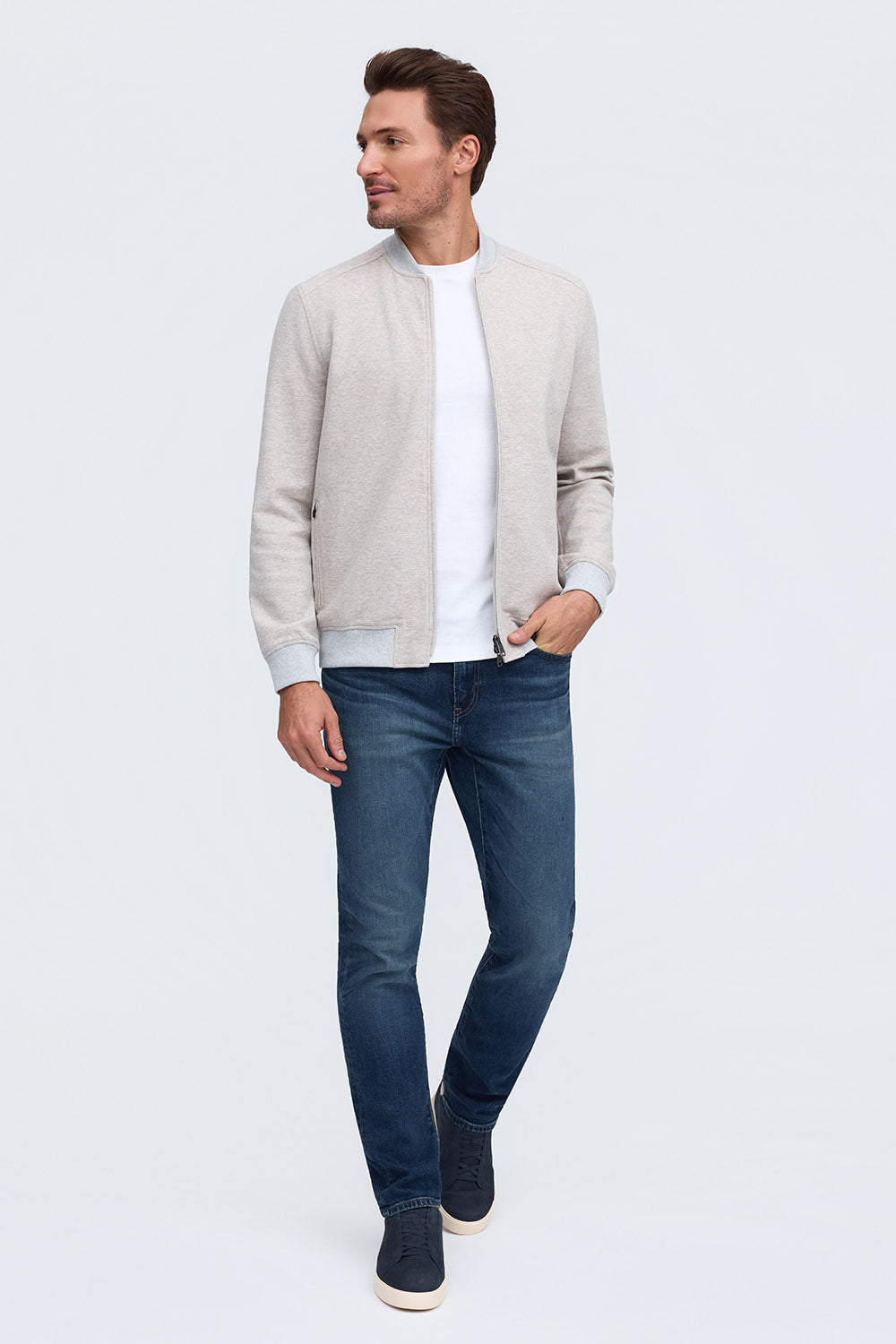 Crafted from a textured cotton blend, this modern bomber features a full zip front and sleek side zip pockets. A versatile layer with elevated style—perfect for transitional weather.