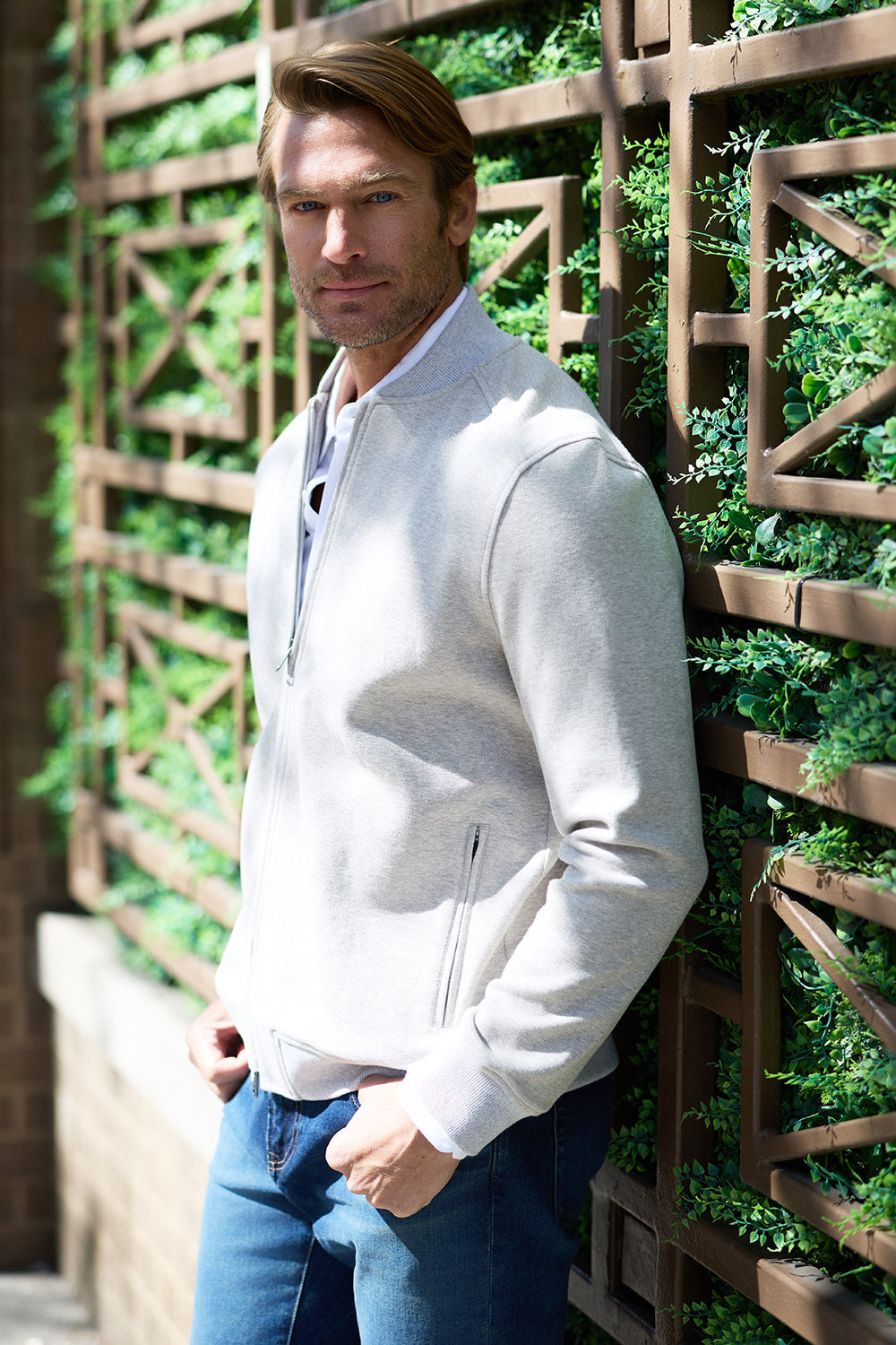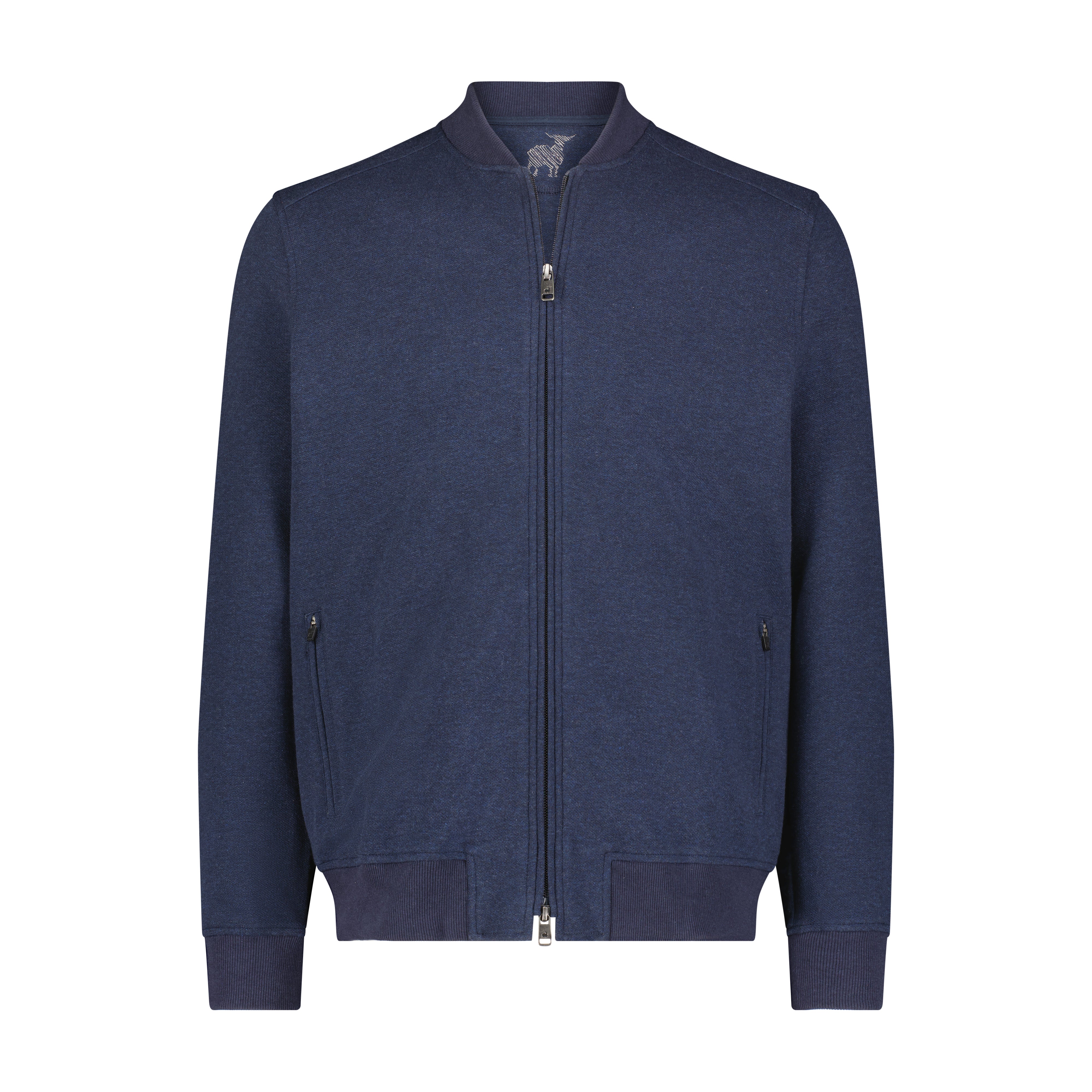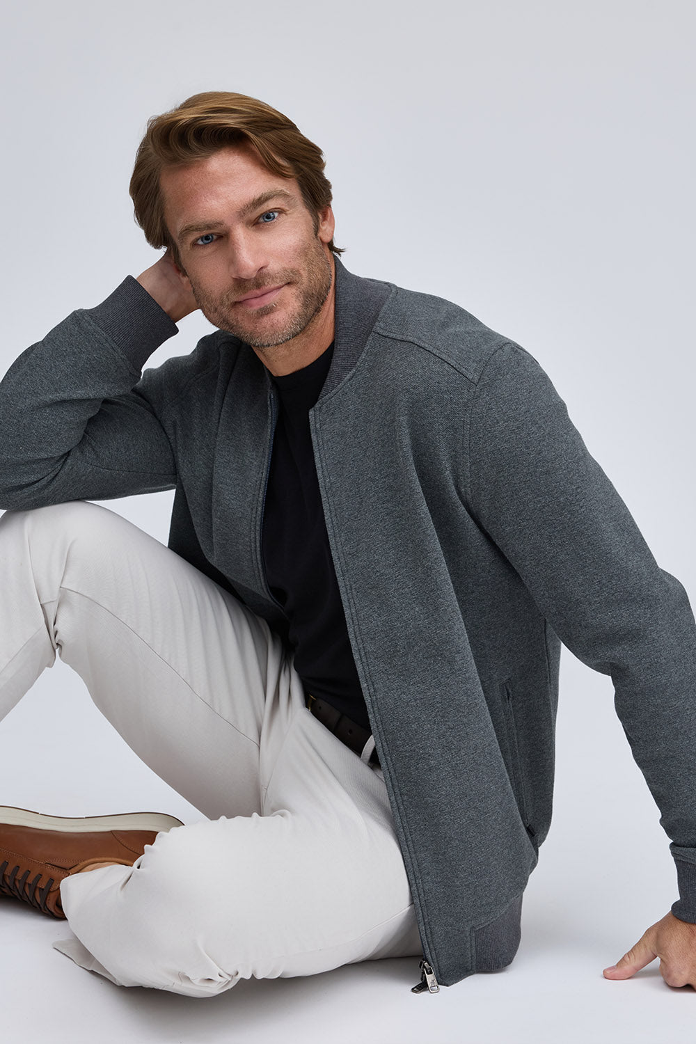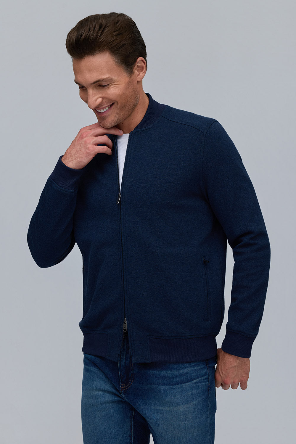 Crafted from a textured cotton blend, this modern bomber features a full zip front and sleek side zip pockets. A versatile layer with elevated style—perfect for transitional weather.