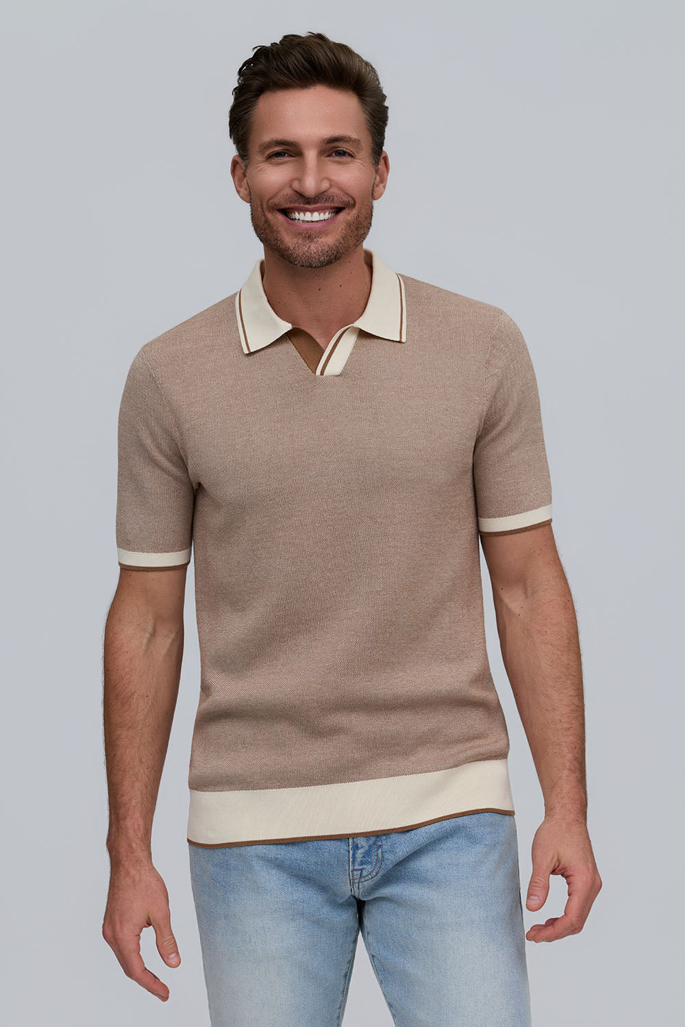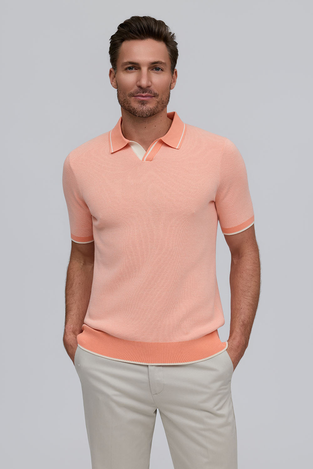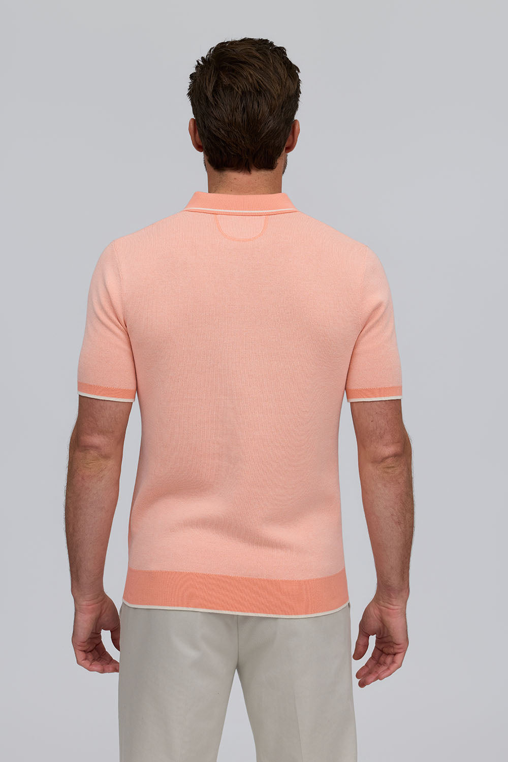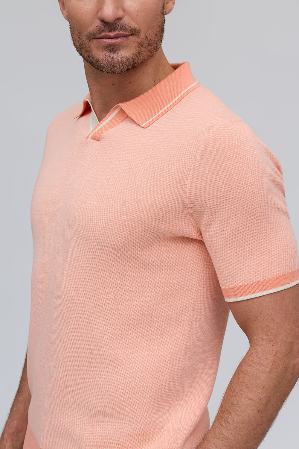 The Cooper is a cotton-silk blend polo with a textured pique Johnny collar for subtle sophistication. Offered in warm Desert and soft Sorbet, it effortlessly elevates both casual and refined ensembles.
