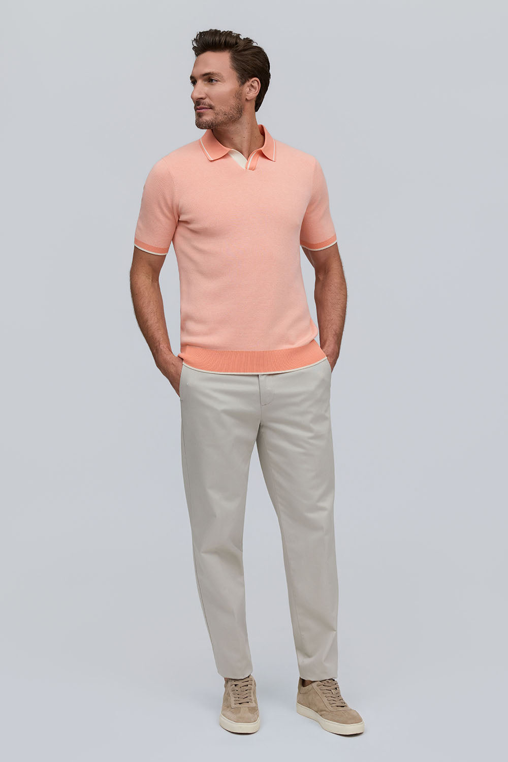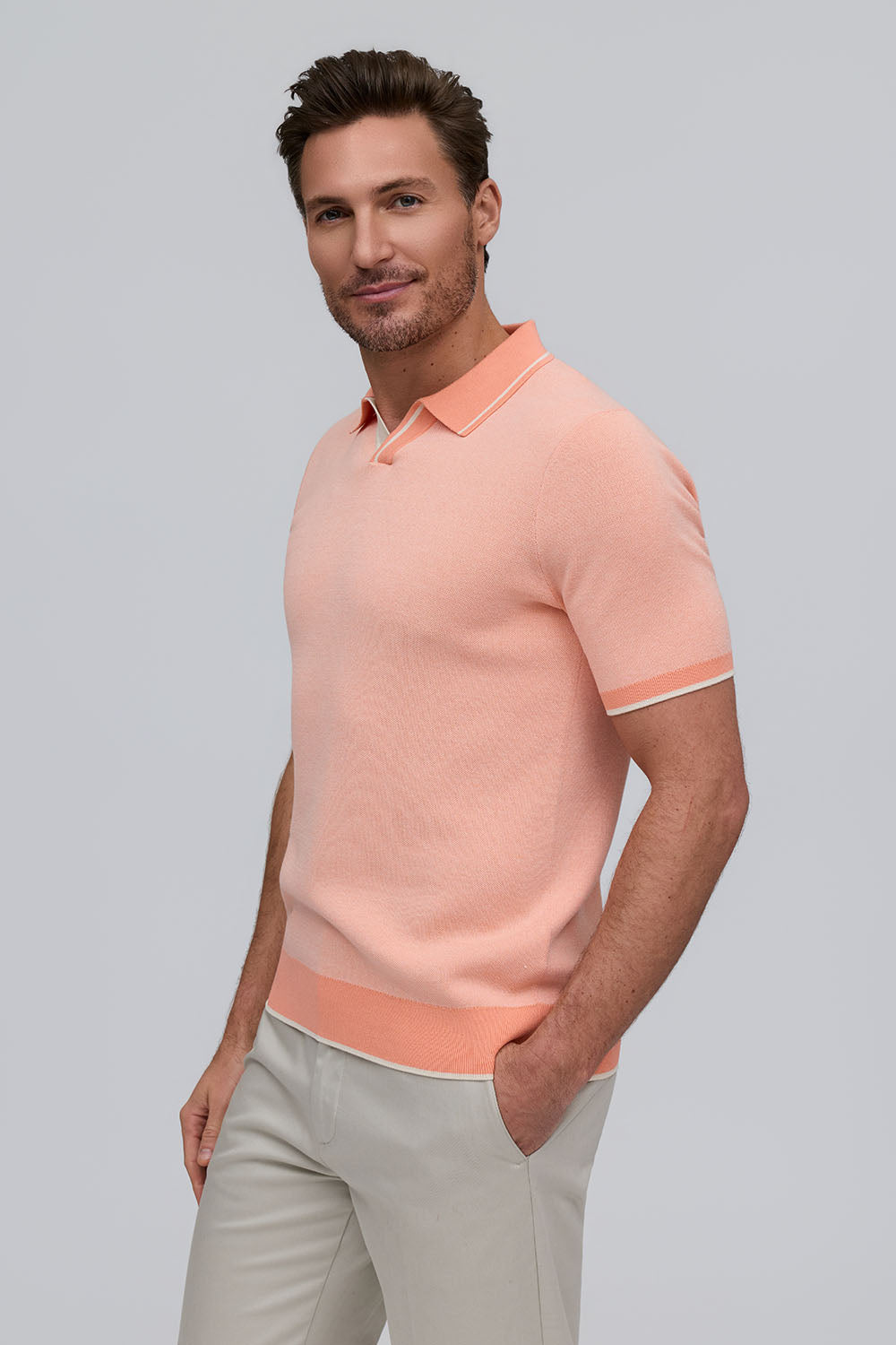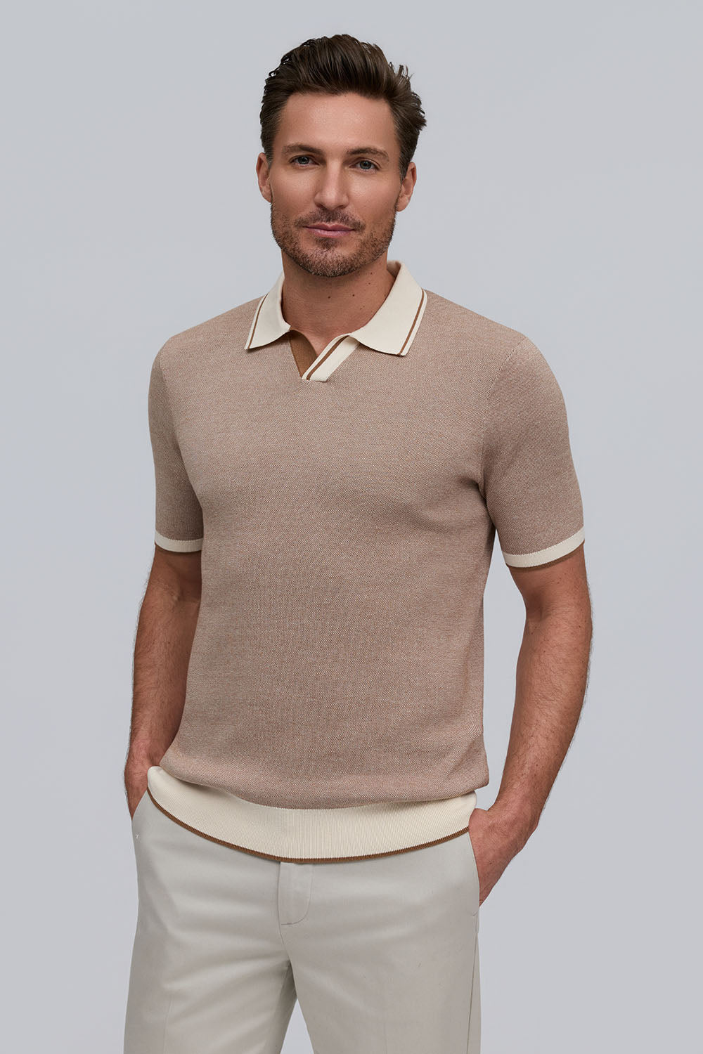 The Cooper is a cotton-silk blend polo with a textured pique Johnny collar for subtle sophistication. Offered in warm Desert and soft Sorbet, it effortlessly elevates both casual and refined ensembles.