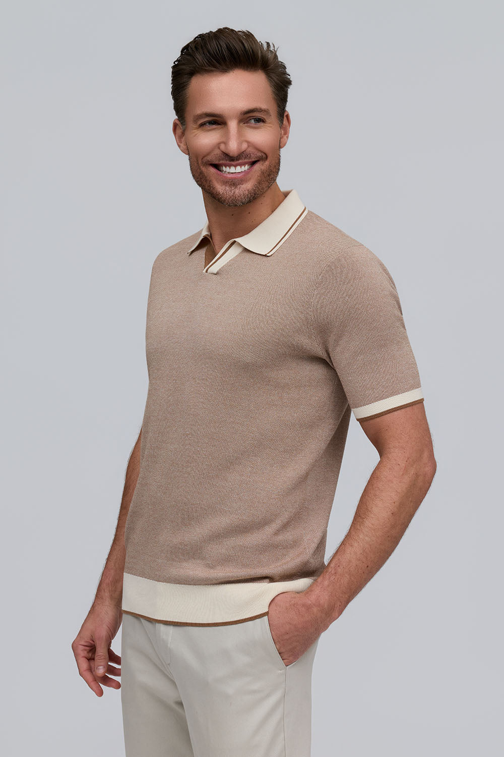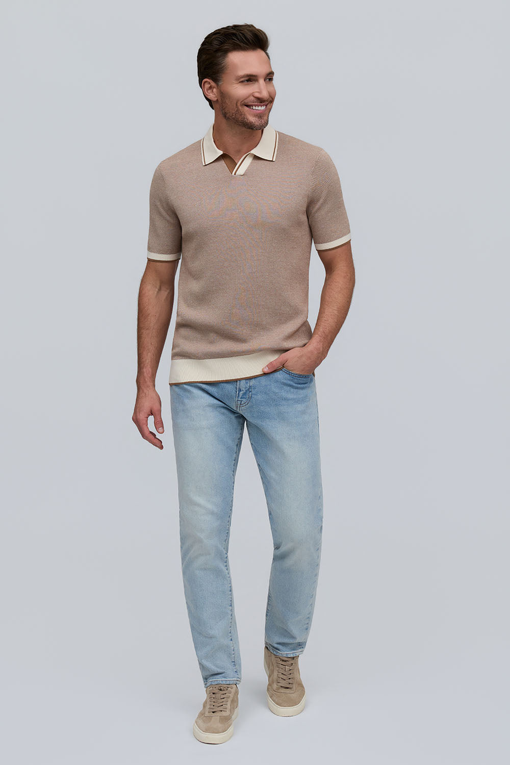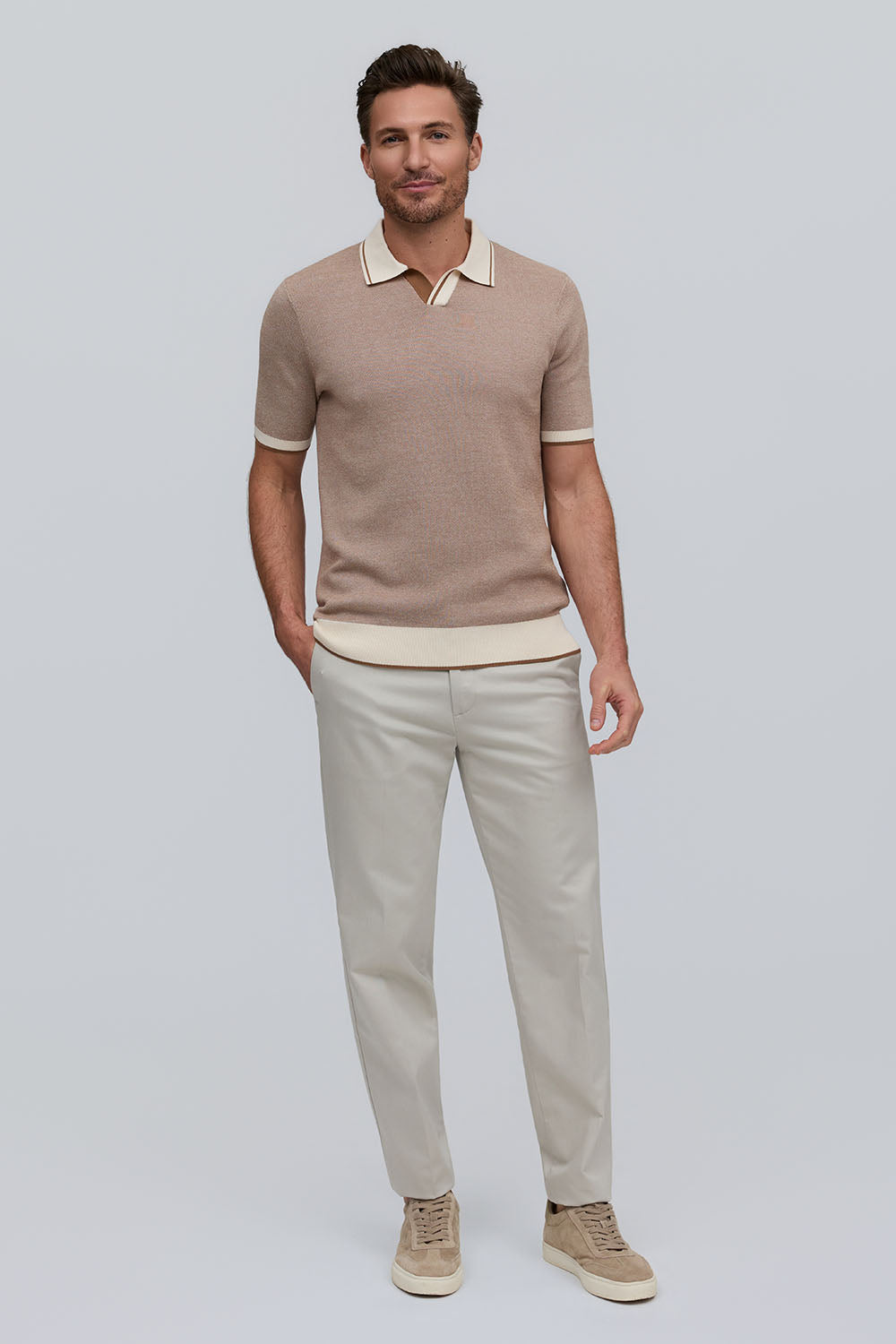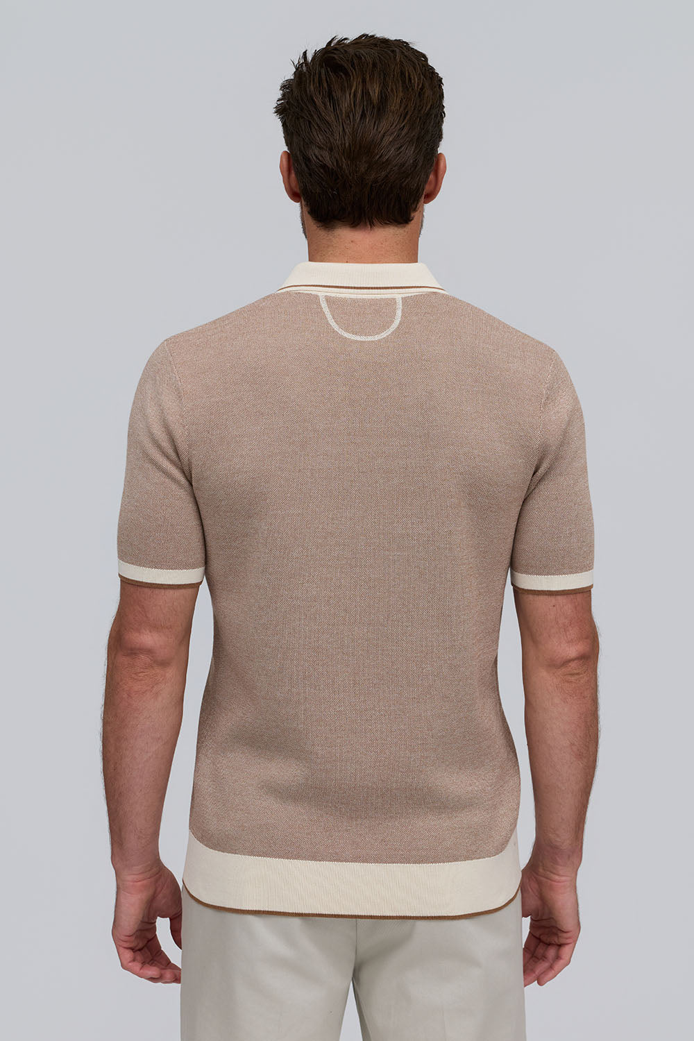 The Cooper is a cotton-silk blend polo with a textured pique Johnny collar for subtle sophistication. Offered in warm Desert and soft Sorbet, it effortlessly elevates both casual and refined ensembles.