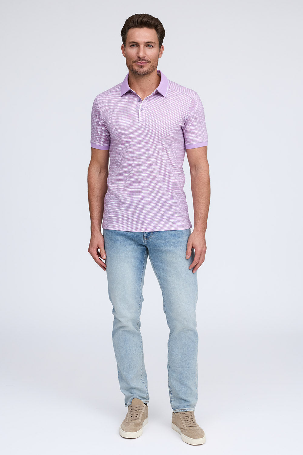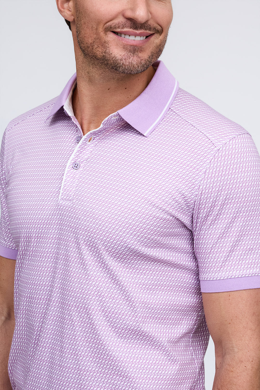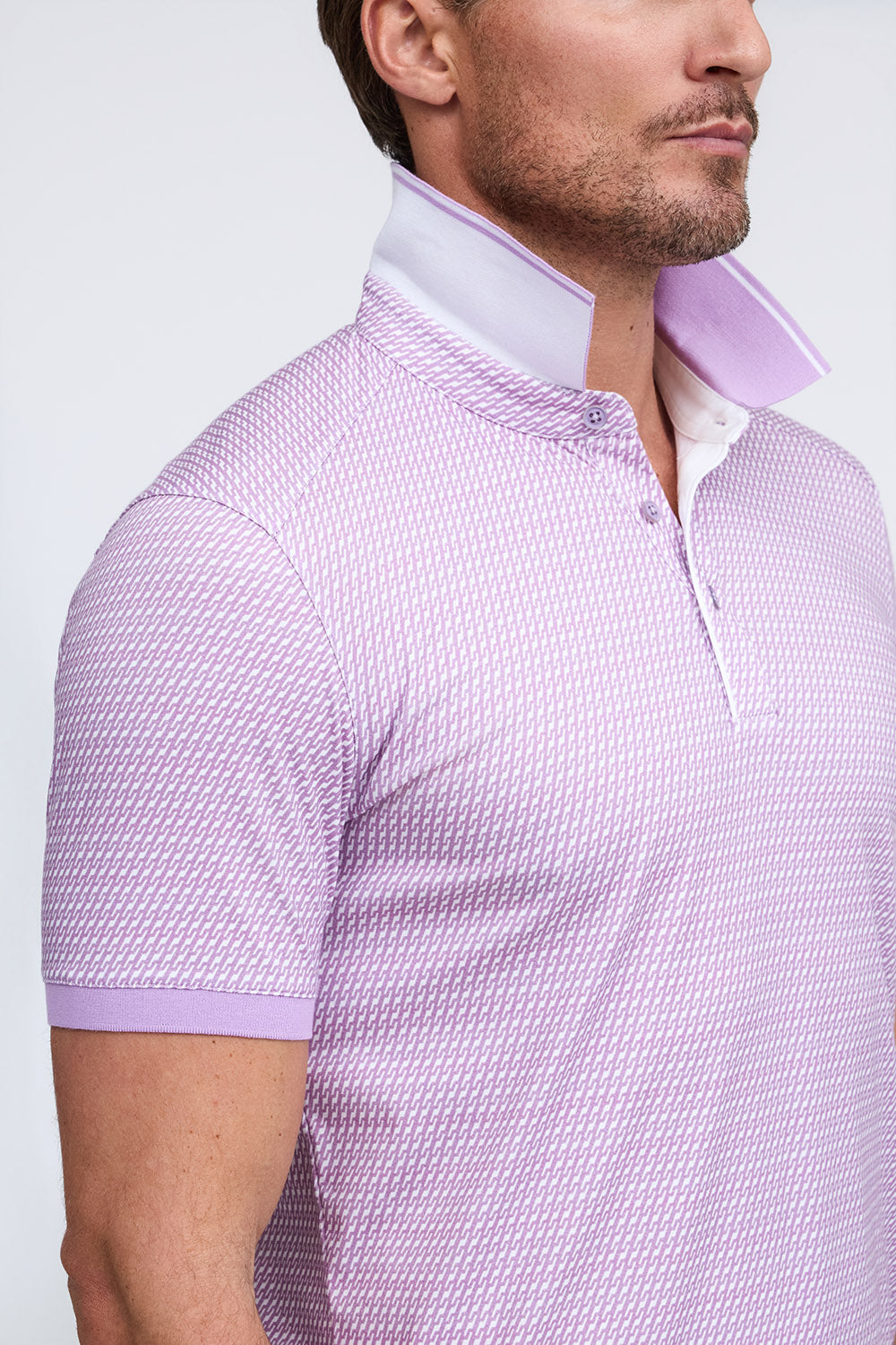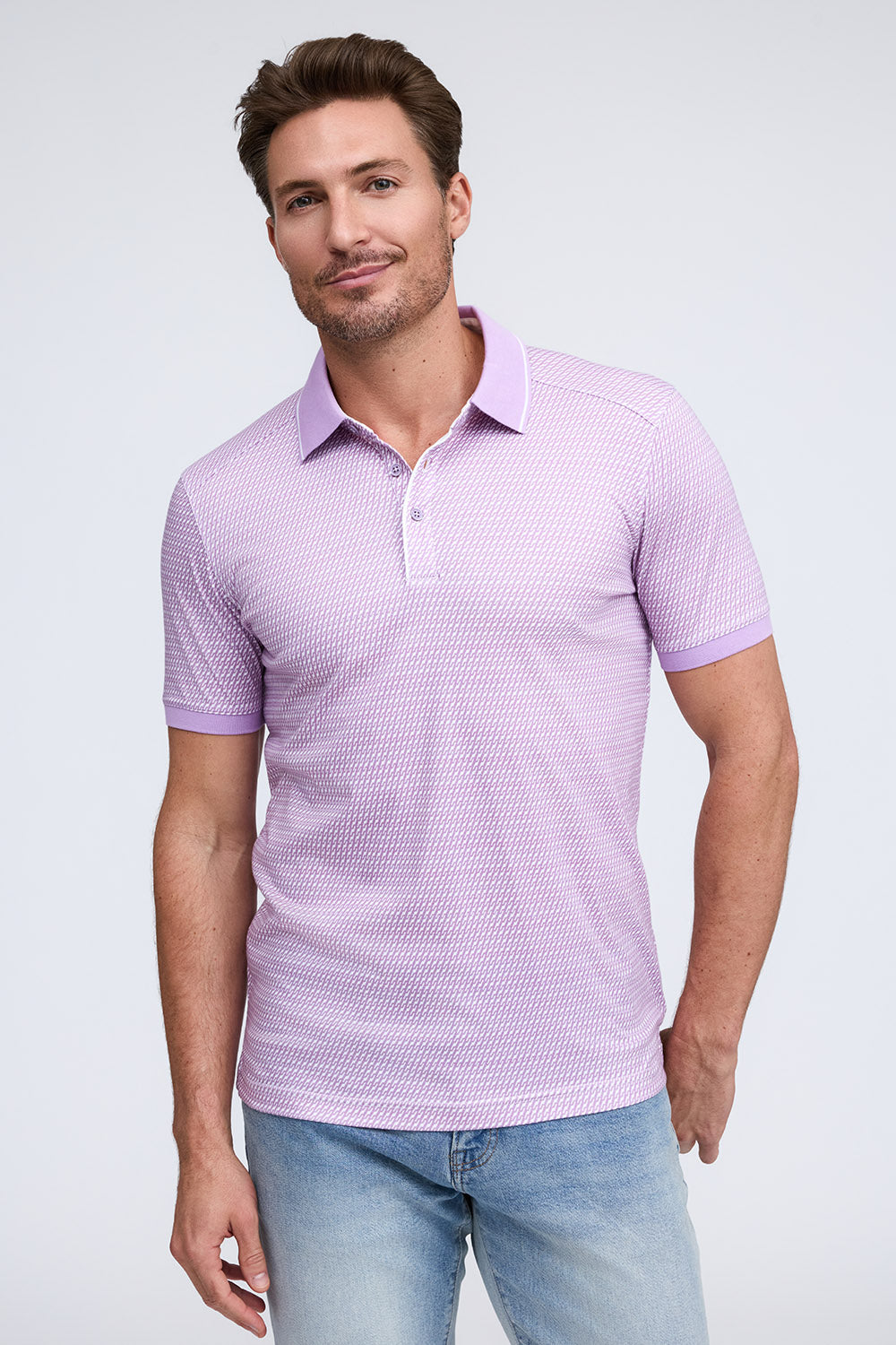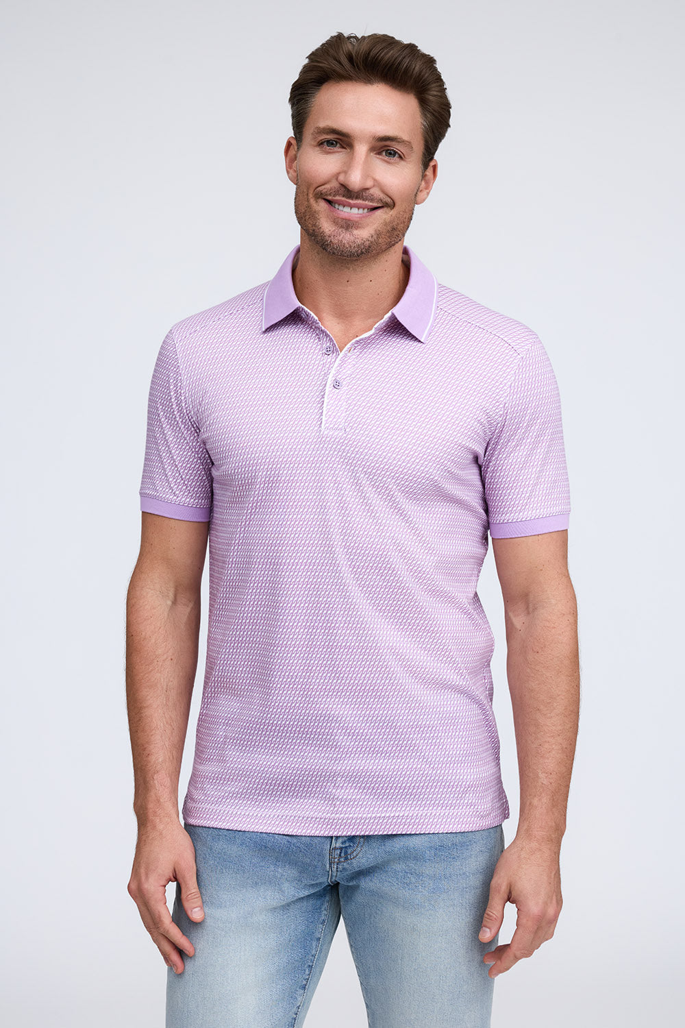 The Denver is a 100% Aqua Cotton jacquard printed polo, available in soft lilac and refreshing water colors. With white detailing on the collar and trim, this shirt delivers a crisp, clean, and elevated look, perfect for adding a touch of sophistication to your wardrobe.