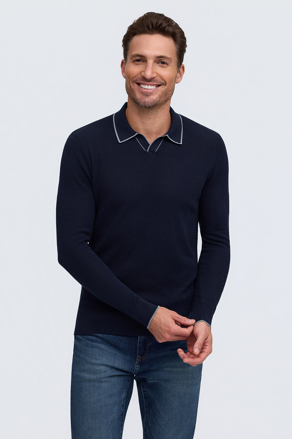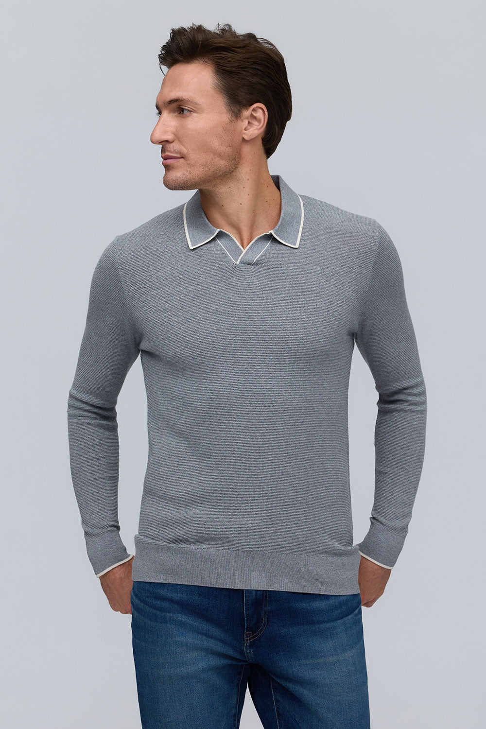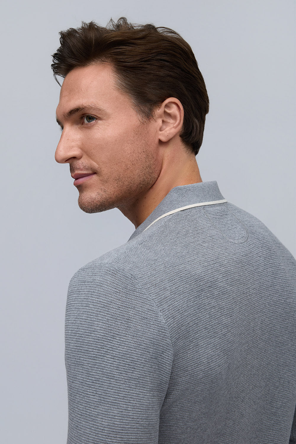Crafted from a luxurious 55% silk and 45% cotton blend, this lightweight sweater features a textured stitch and polished trim detailing around the collar and sleeves for an elevated, modern look.