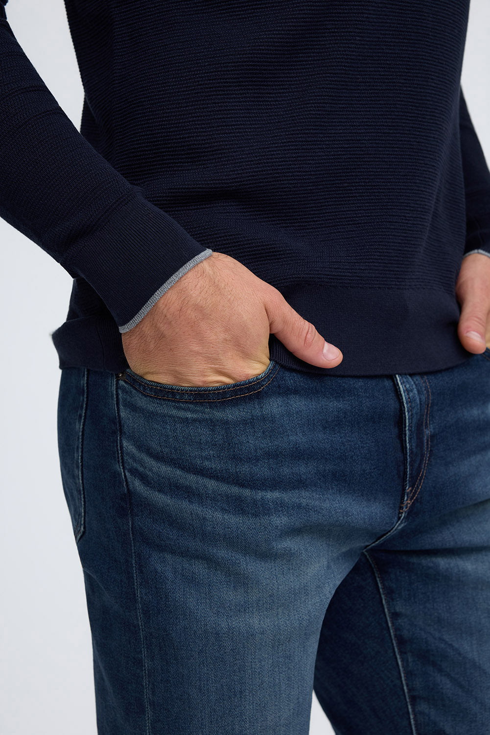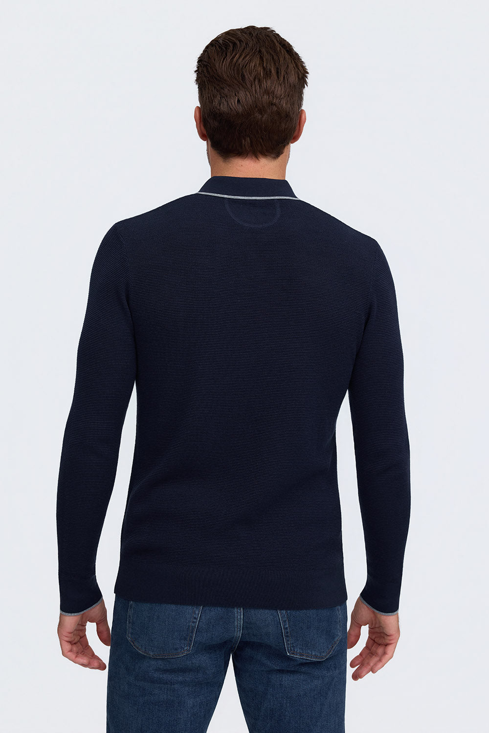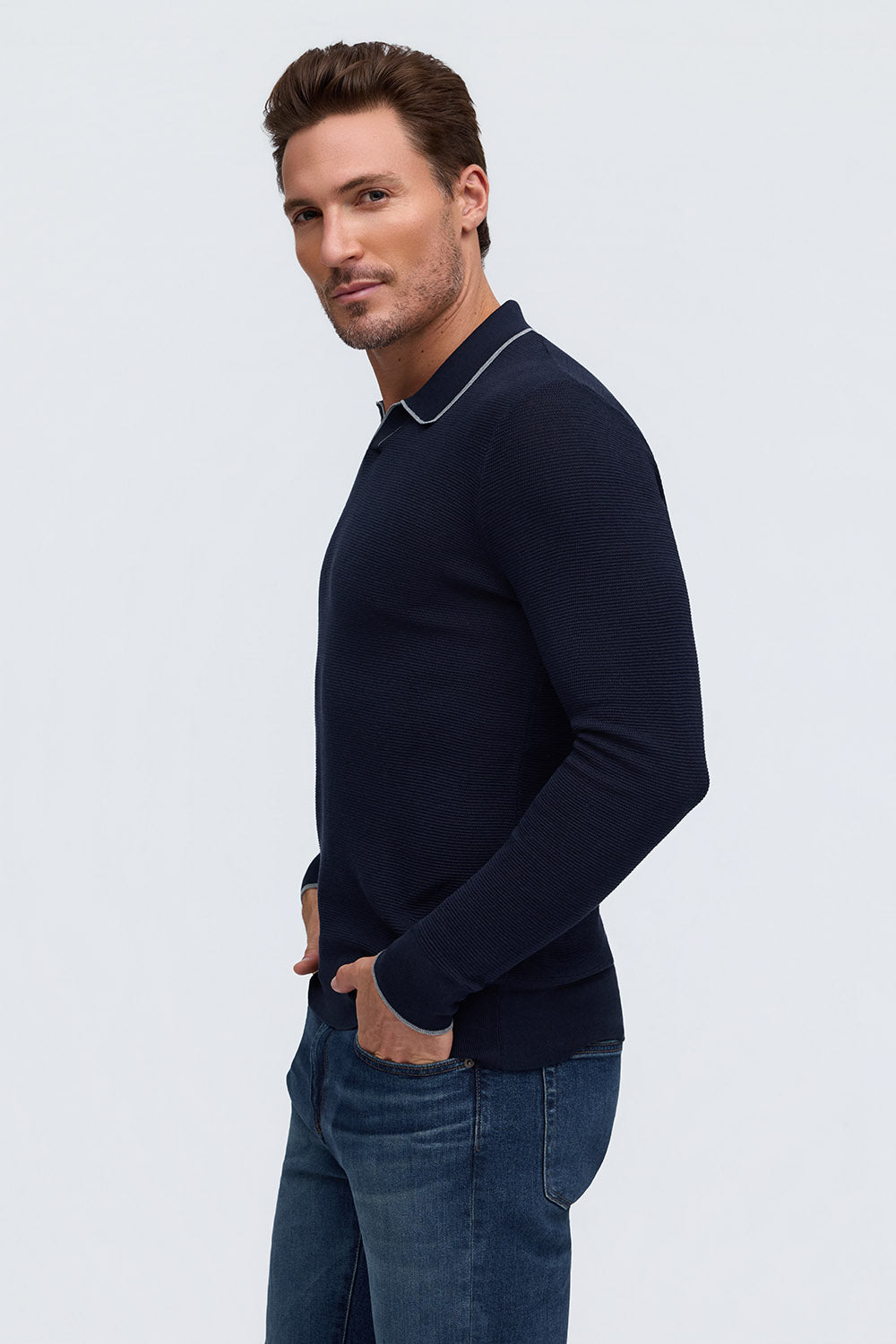Crafted from a luxurious 55% silk and 45% cotton blend, this lightweight sweater features a textured stitch and polished trim detailing around the collar and sleeves for an elevated, modern look.