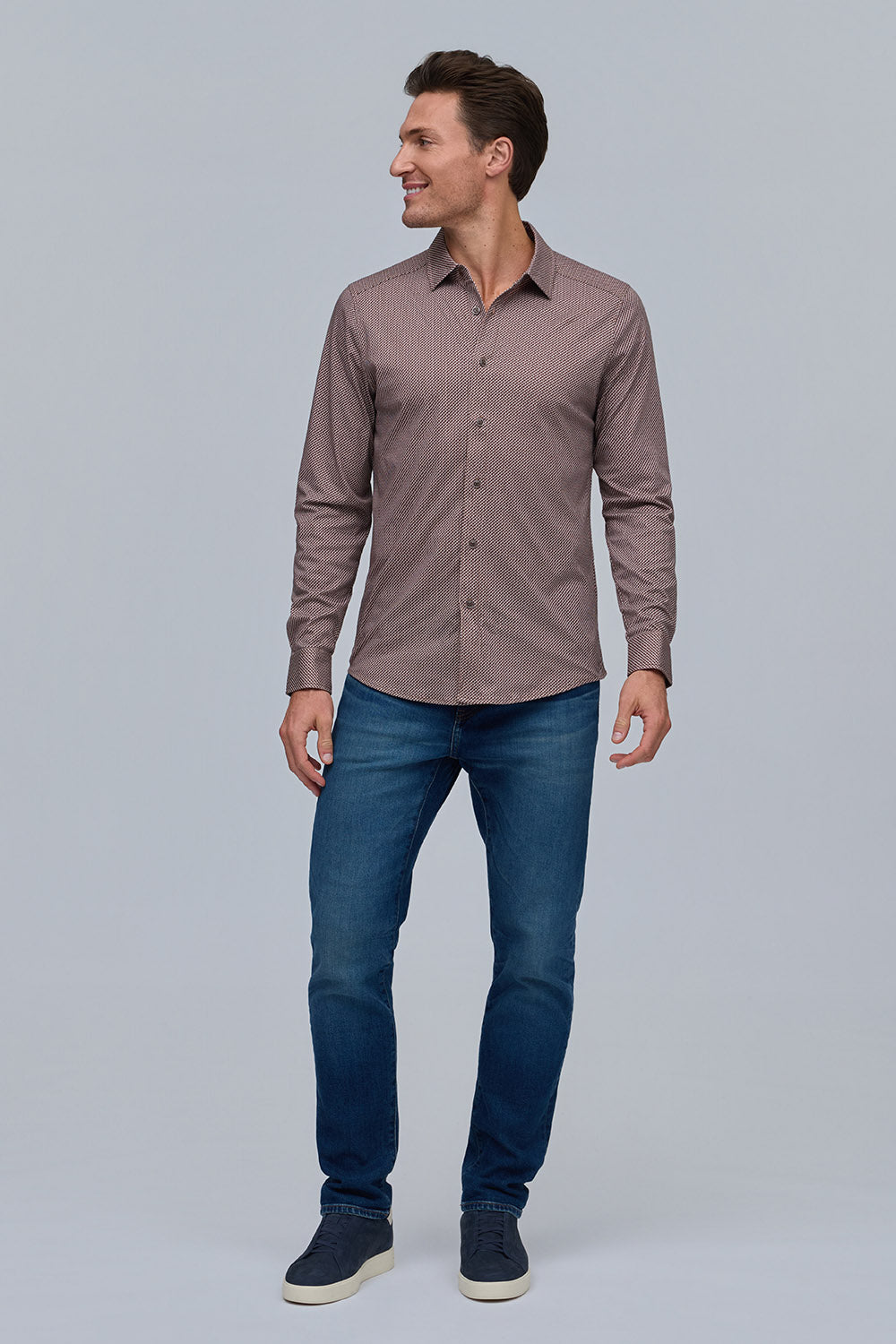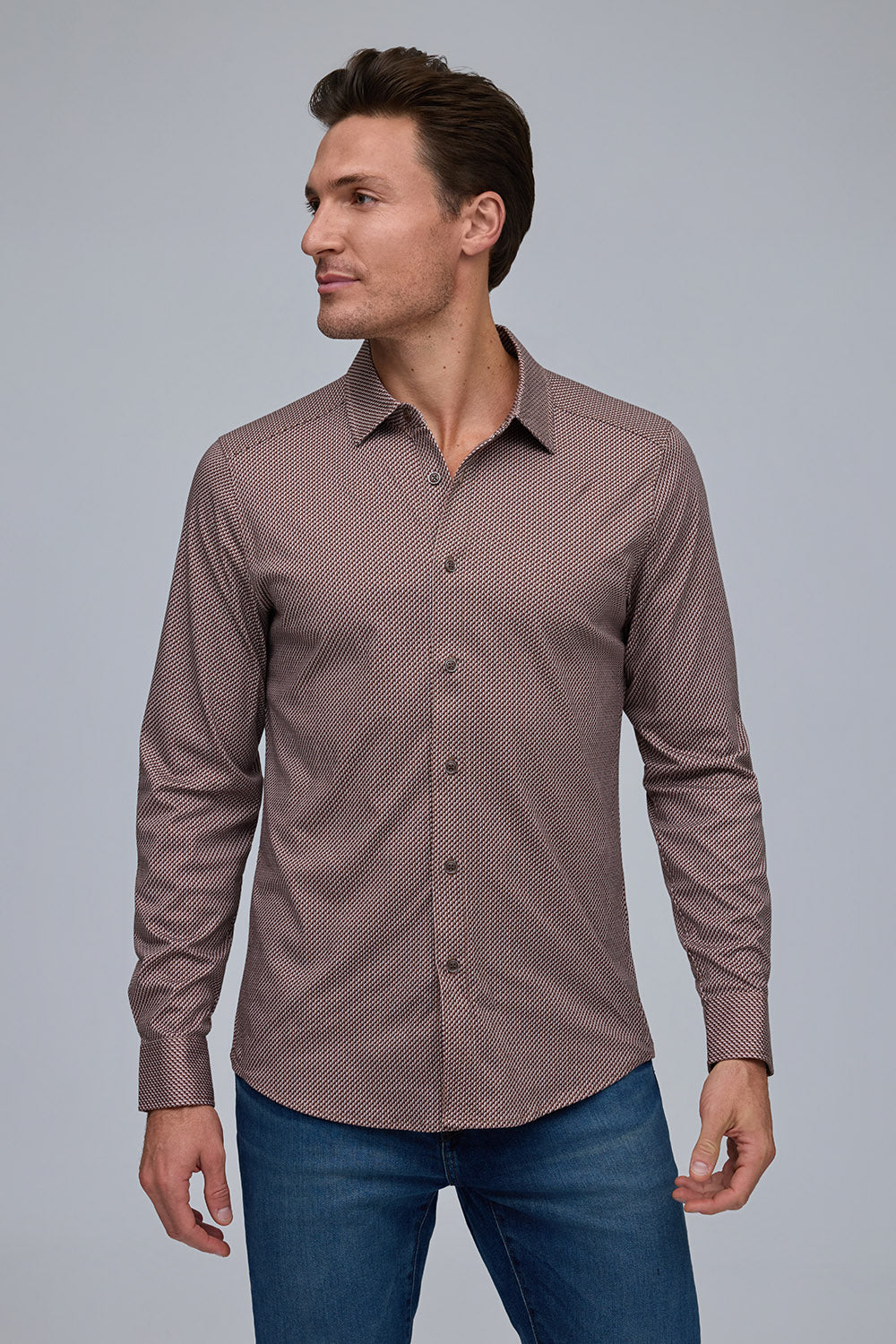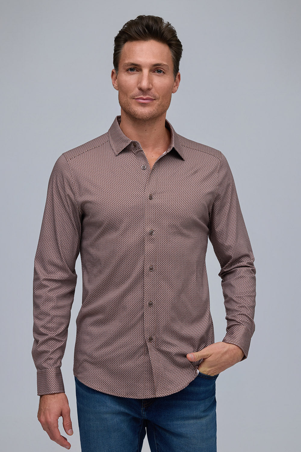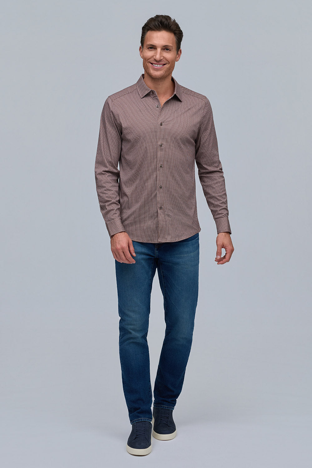 Made from 100% pure Aqua cotton, this button-front shirt combines lightweight comfort with a polished finish. The subtle mini illusion print adds refined texture, making it a versatile staple that effortlessly elevates any look.