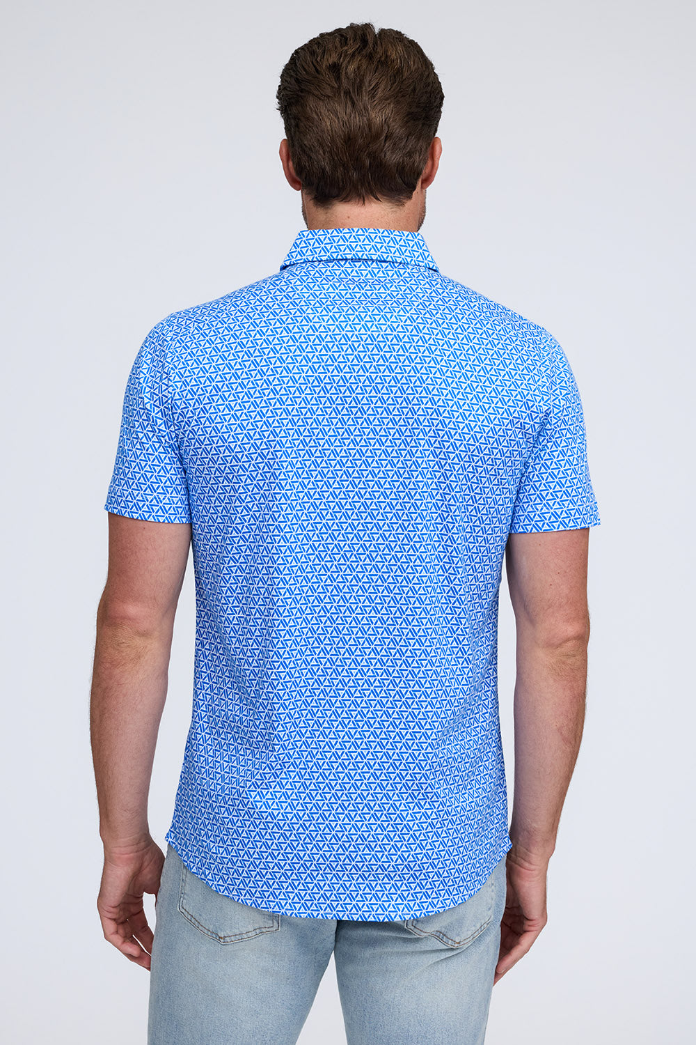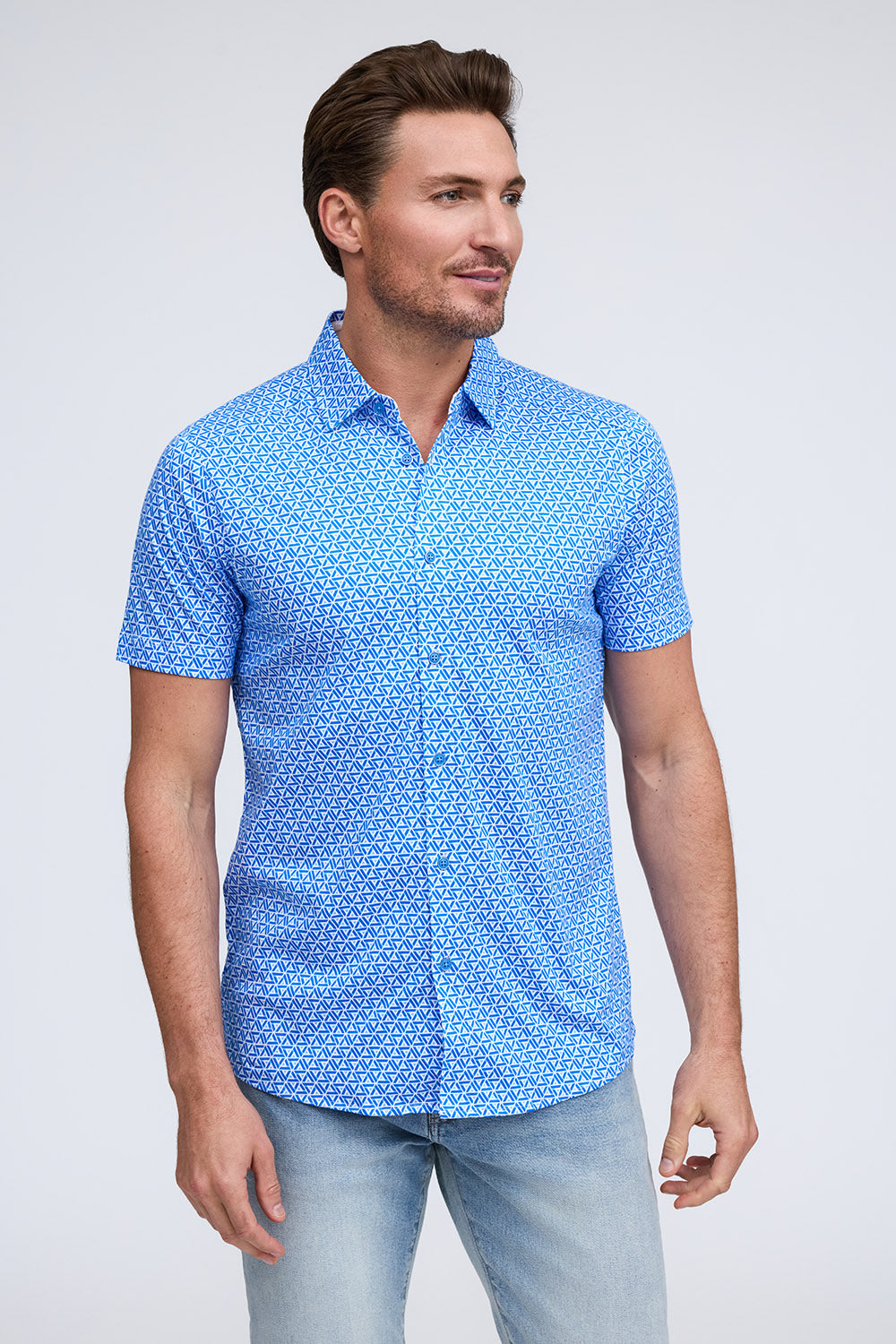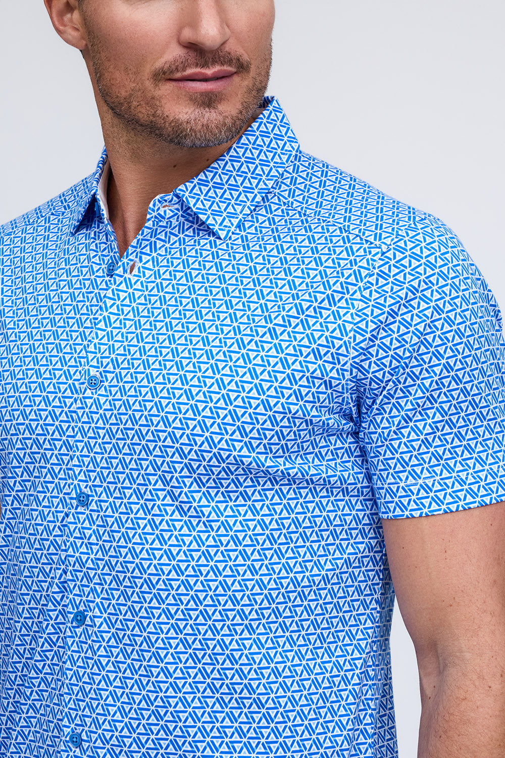 The Hal is a sleek, full-button front short-sleeve shirt showcasing a modern Geo print in shades of blue. Crafted from 100% Aqua Cotton, it's the bold choice for style and comfort.