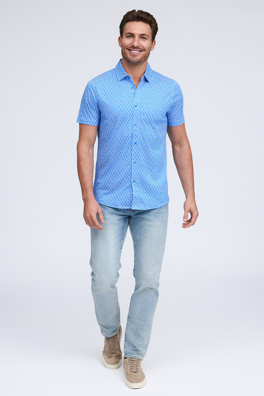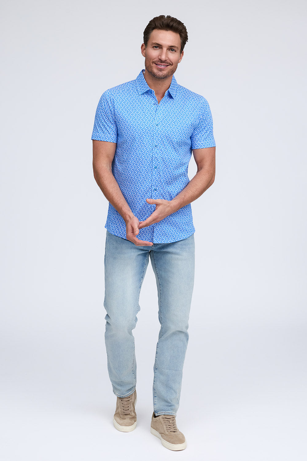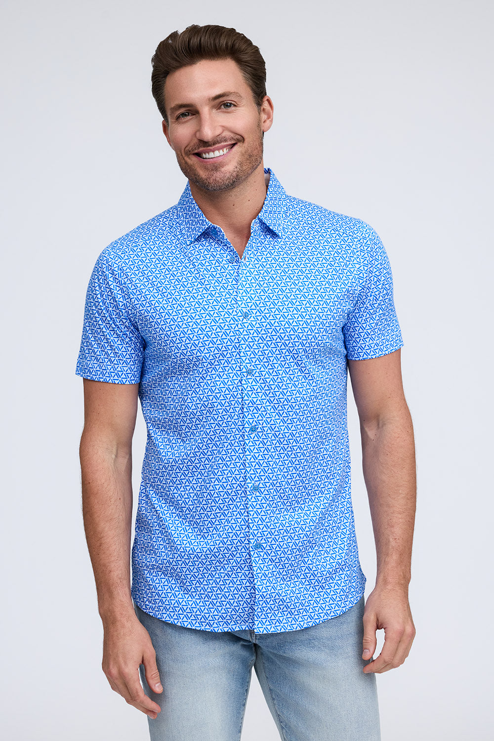The Hal is a sleek, full-button front short-sleeve shirt showcasing a modern Geo print in shades of blue. Crafted from 100% Aqua Cotton, it's the bold choice for style and comfort.