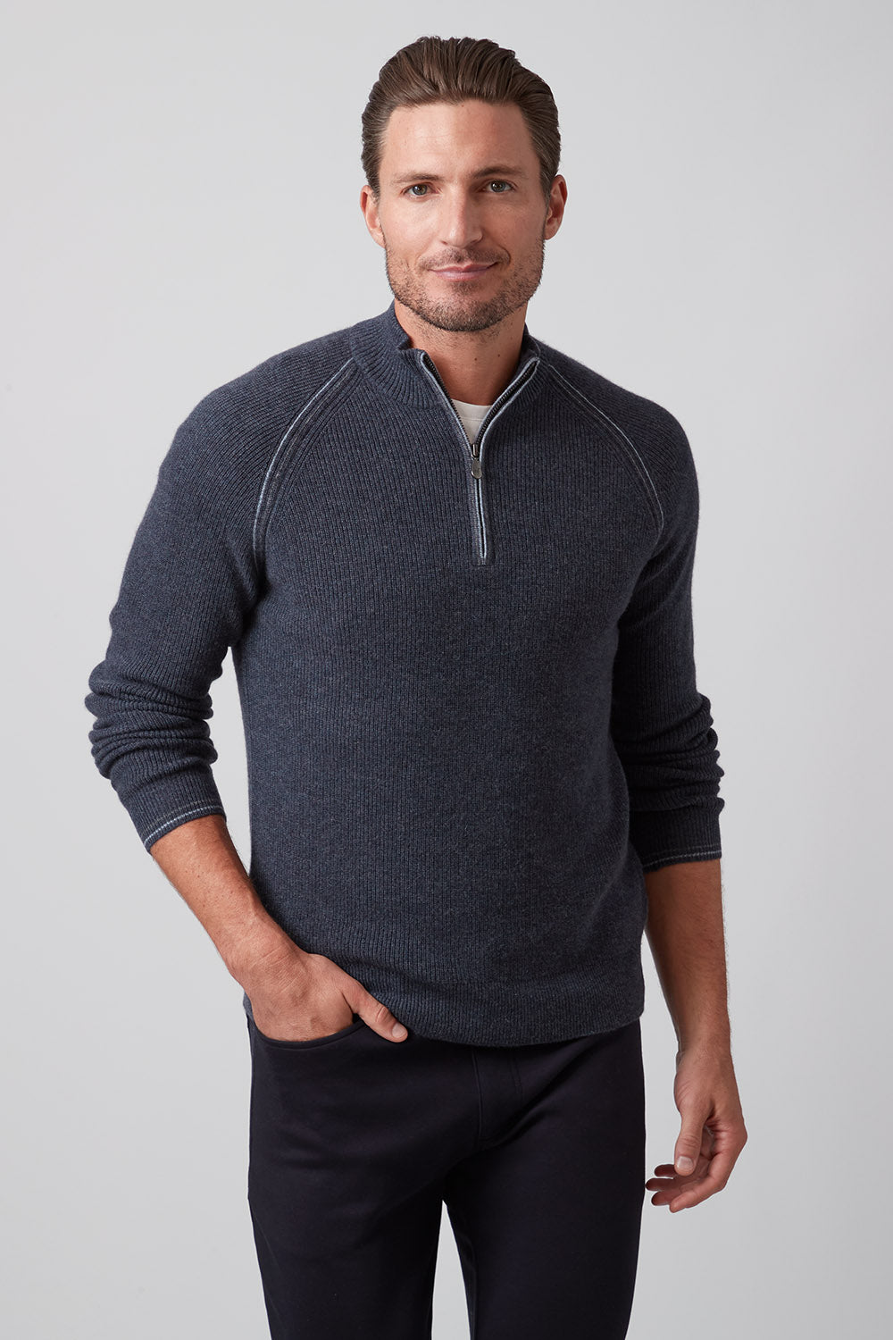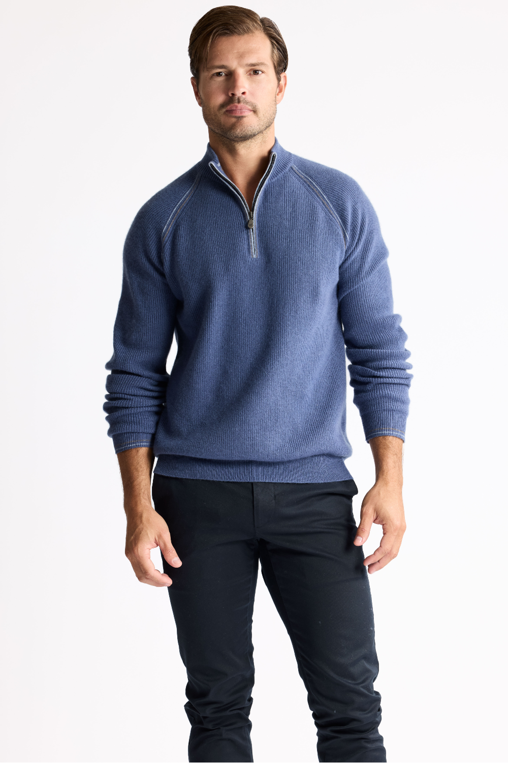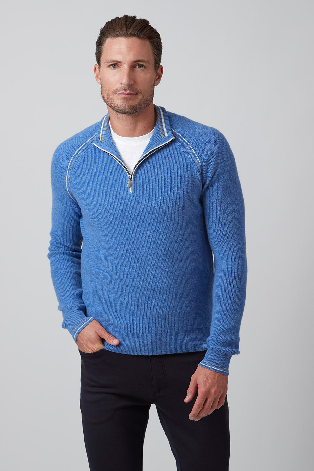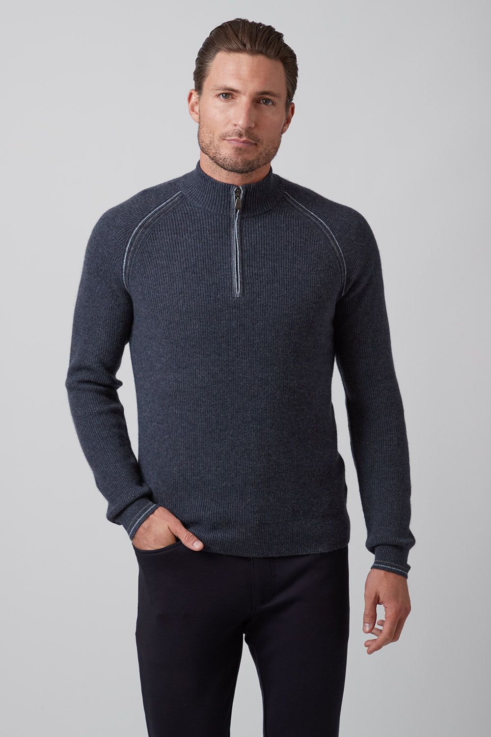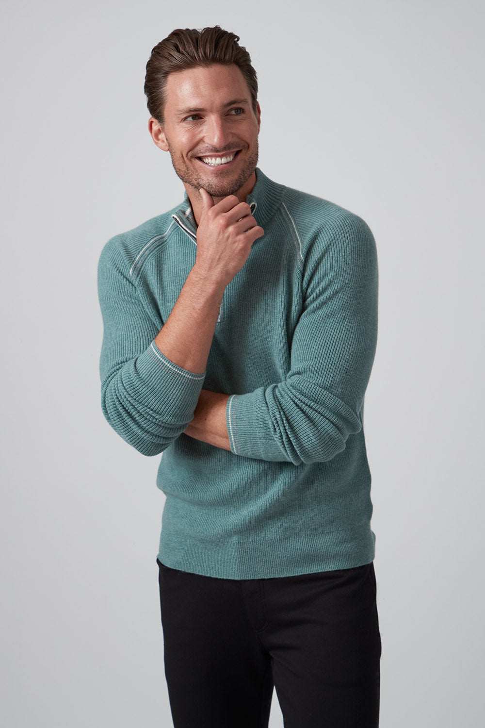 We didn't skimp on the details when we created The Holden sweater. Made from luxurious 100% pure cashmere for incredible softness. This mock zip neck is an English rib knit with subtle color trim on the placket, cuff, and shoulders that are also fashioned for a better fit. This handsome sweater will take you from the work week to the weekend in style.