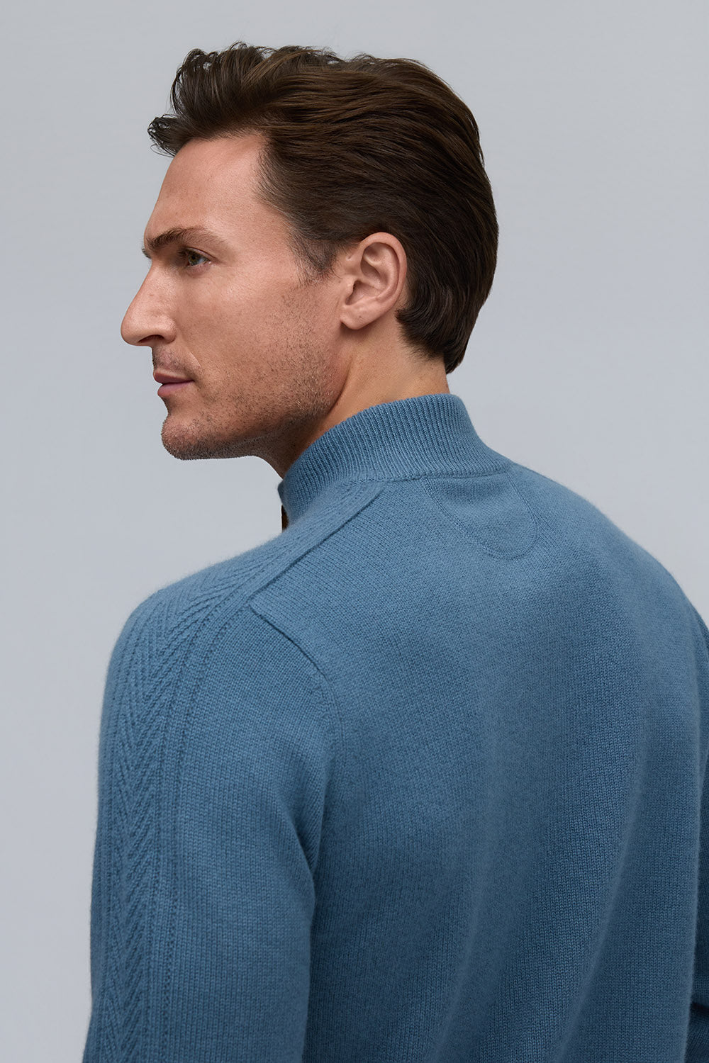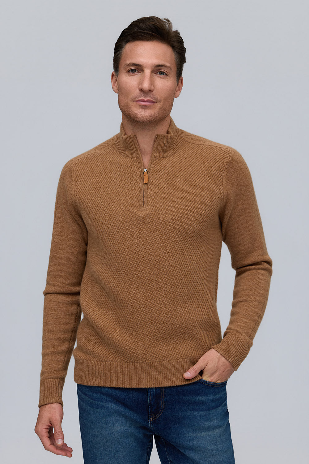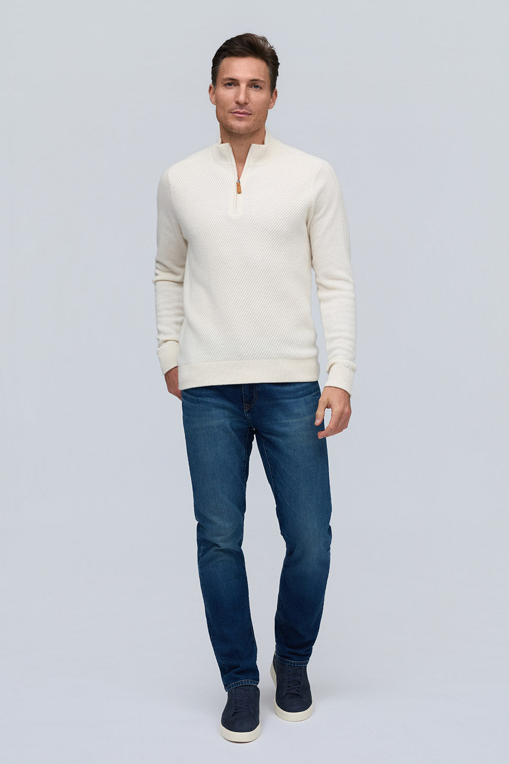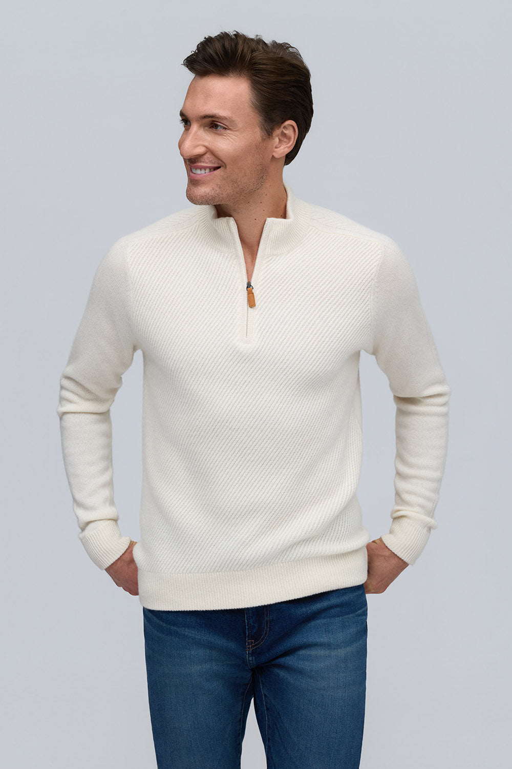 Elevated in every detail, this 100% pure cashmere sweater offers exceptional softness and warmth. The zip mock neck adds a modern edge to its timeless silhouette, while rich, subtle hues embody quiet sophistication.