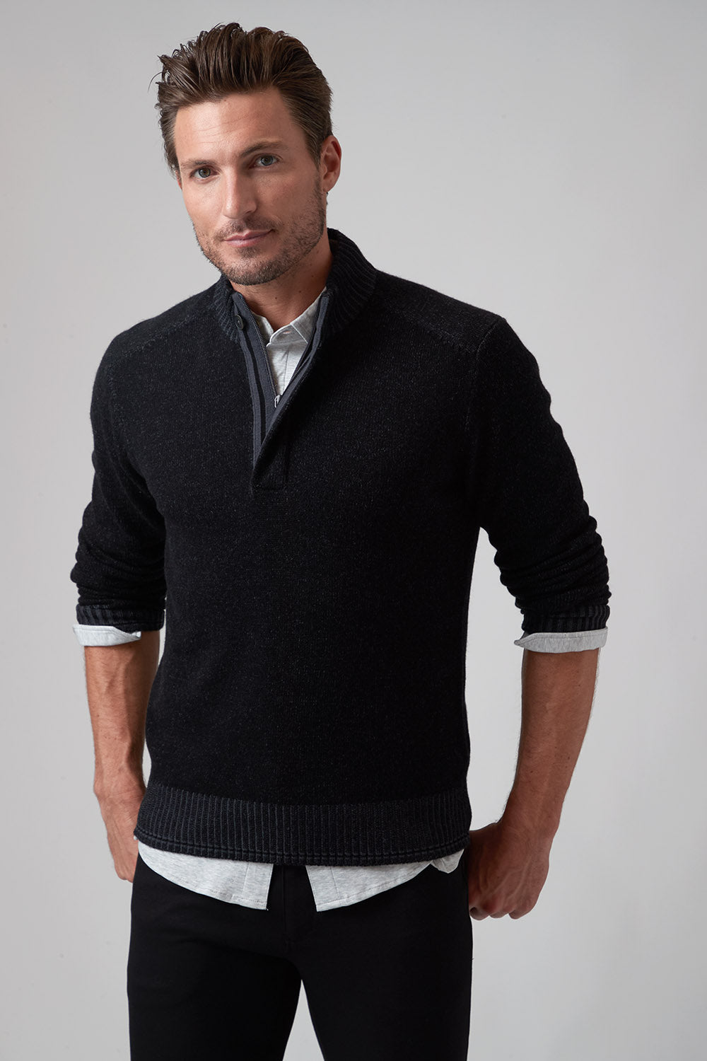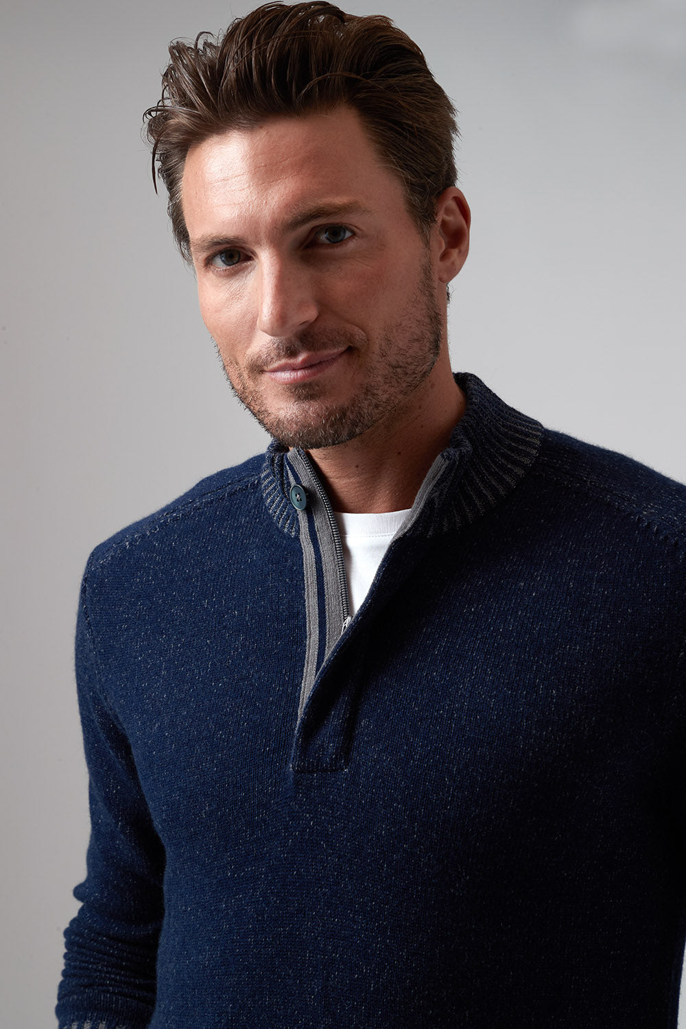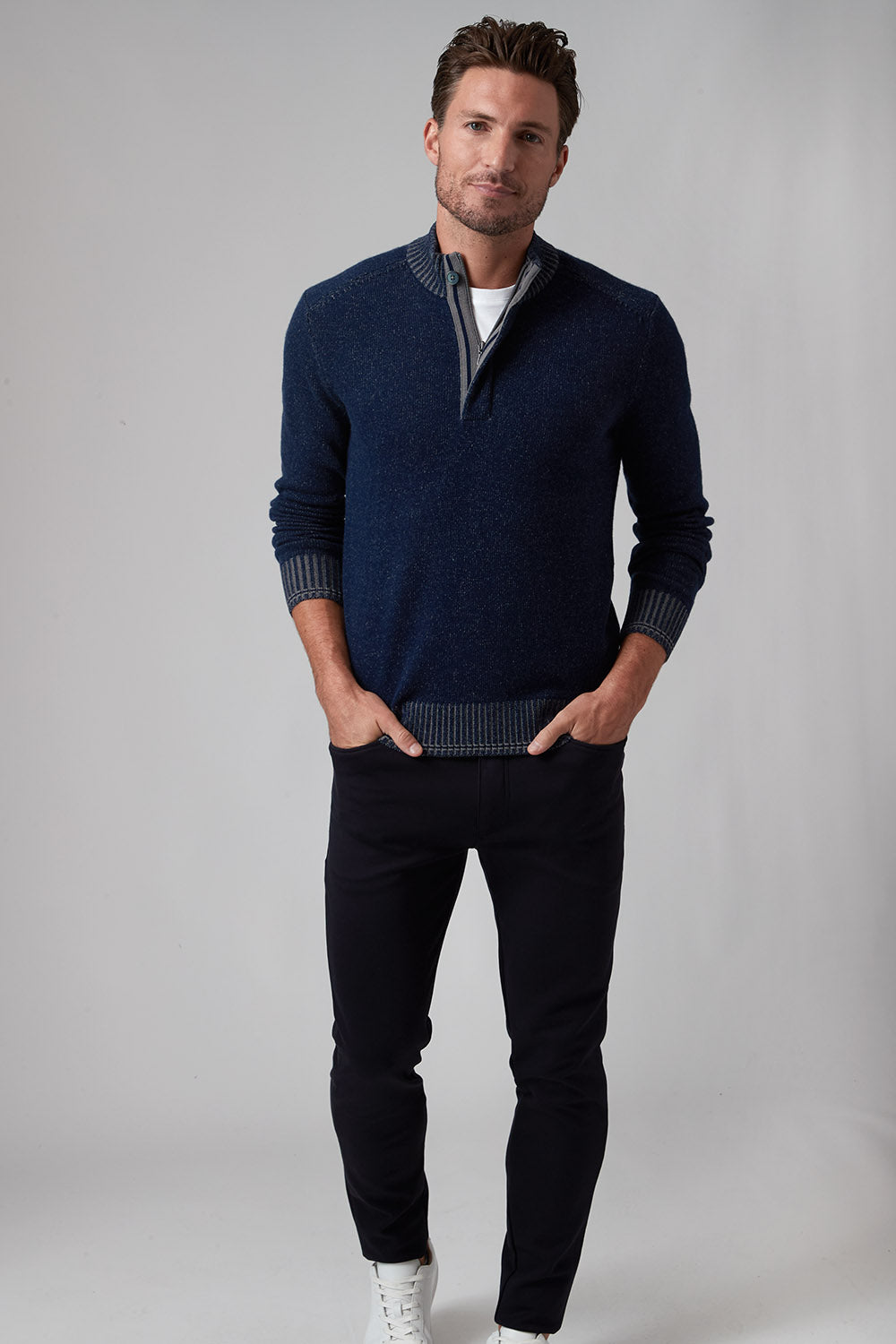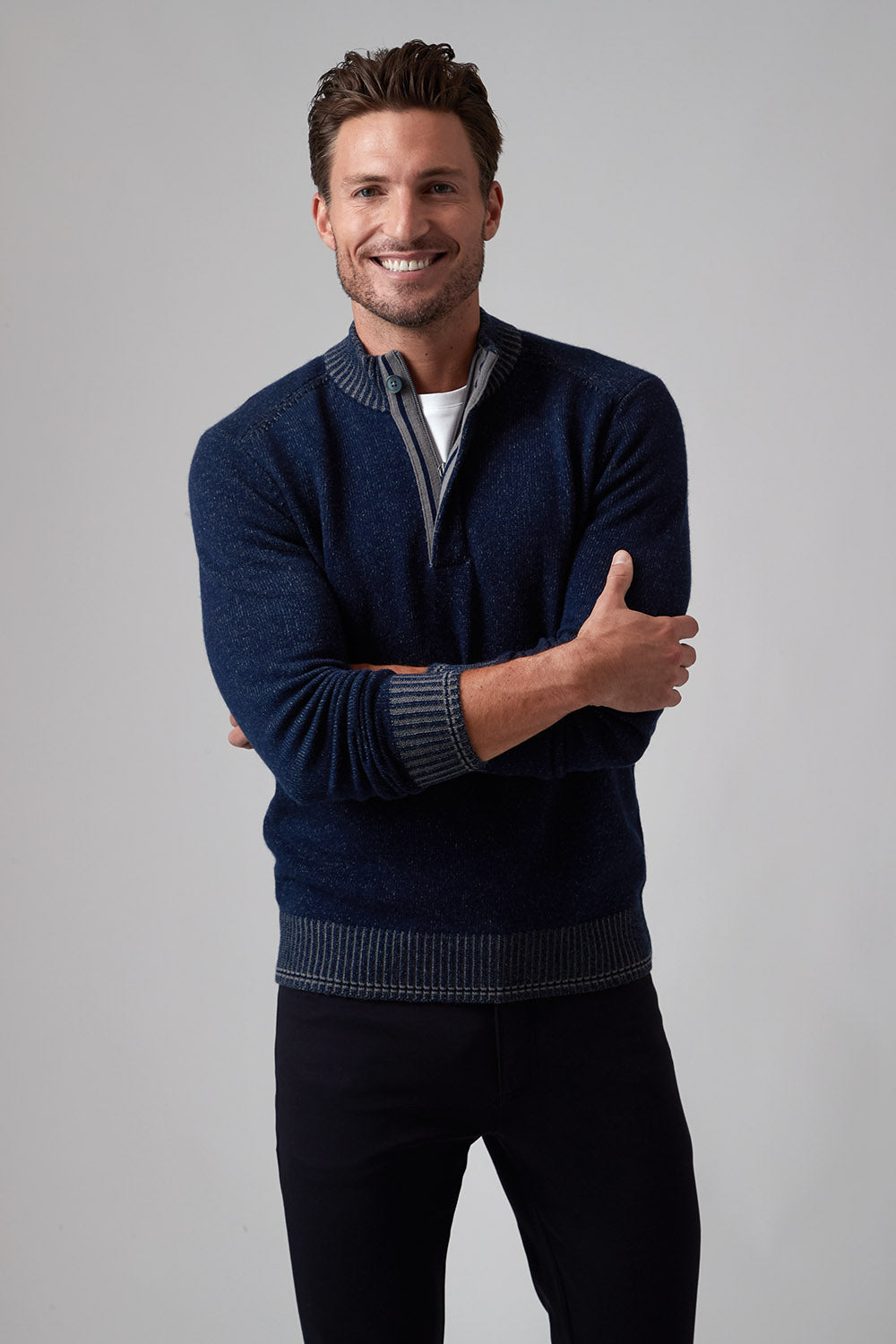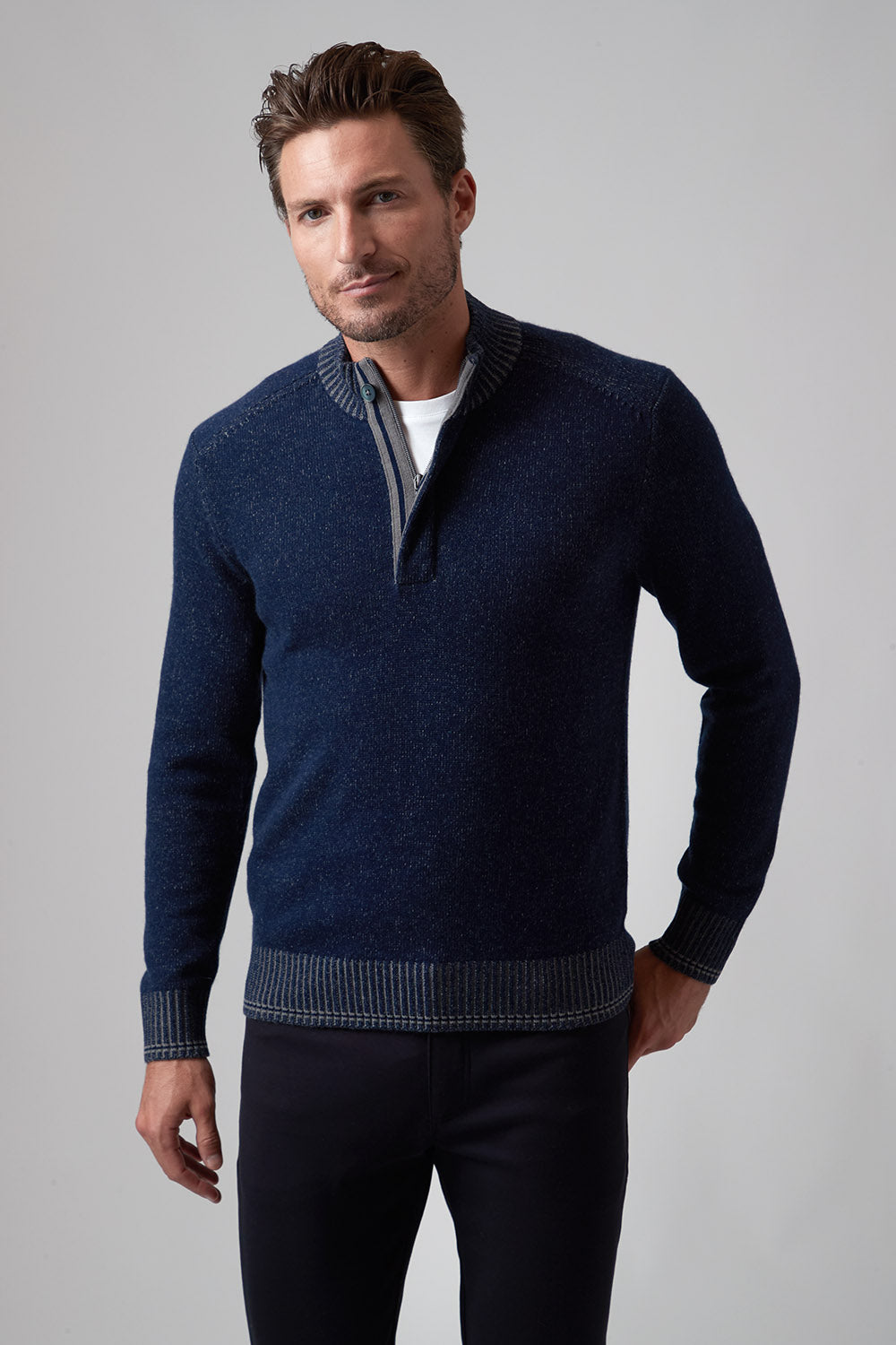 The Hugo, our 1/4 zip sweater, is the perfect addition to your wardrobe if you want to elevate your style effortlessly. The high-quality cashmere blend ensures the ultimate warmth and comfort as the temperatures drop, while the thoughtful fashion details on the zipper placket with single button closure and complimentary color striping at cuff and hem give it a rich and modern look. Pair with one of our Aqua Cotton tees and your favorite pair of jeans and leave a lasting impression!