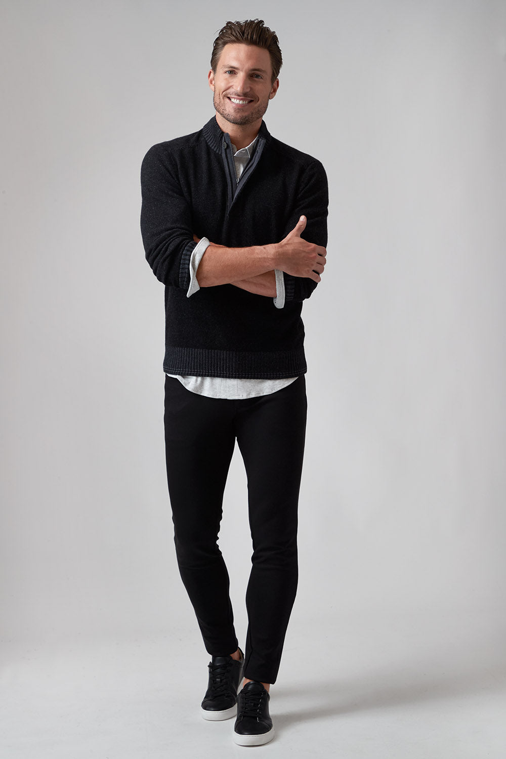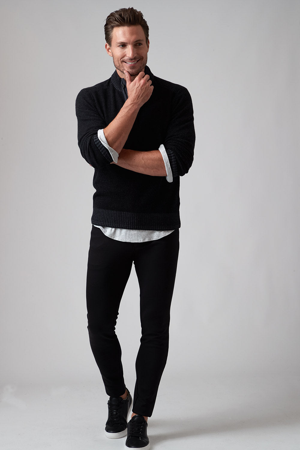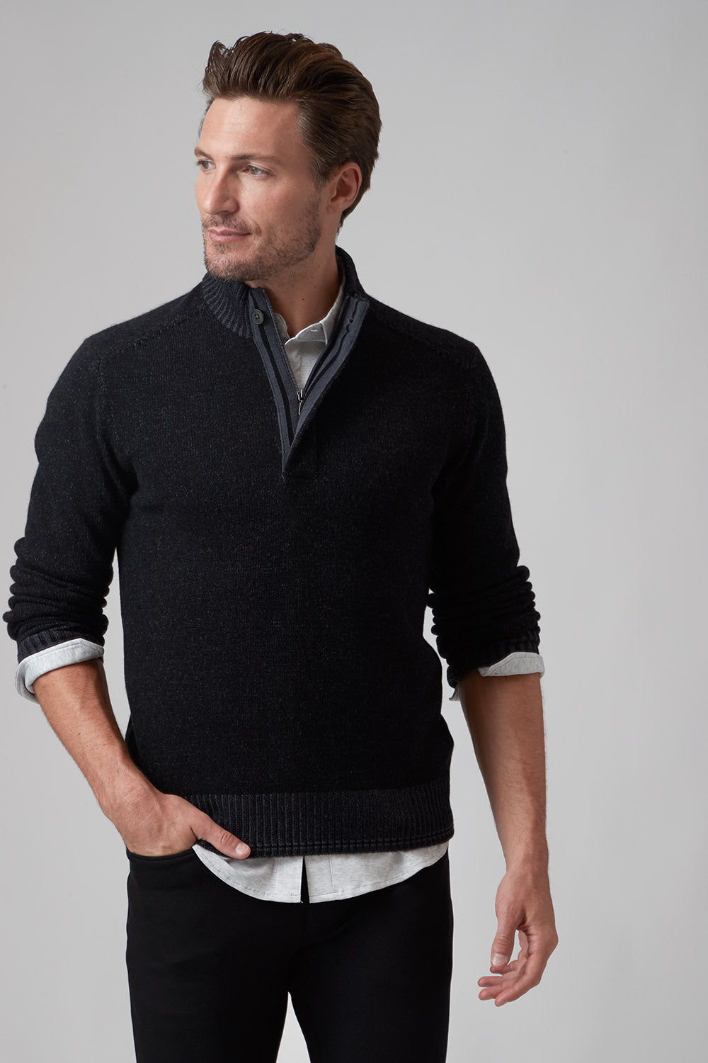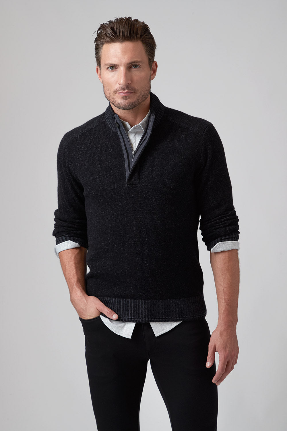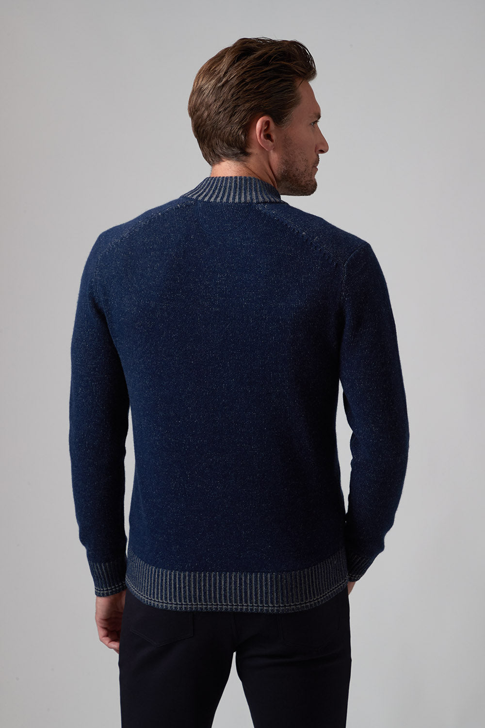 The Hugo, our 1/4 zip sweater, is the perfect addition to your wardrobe if you want to elevate your style effortlessly. The high-quality cashmere blend ensures the ultimate warmth and comfort as the temperatures drop, while the thoughtful fashion details on the zipper placket with single button closure and complimentary color striping at cuff and hem give it a rich and modern look. Pair with one of our Aqua Cotton tees and your favorite pair of jeans and leave a lasting impression!