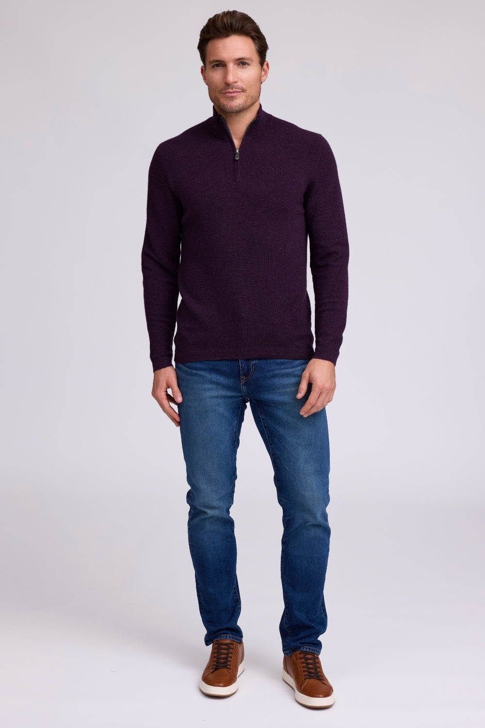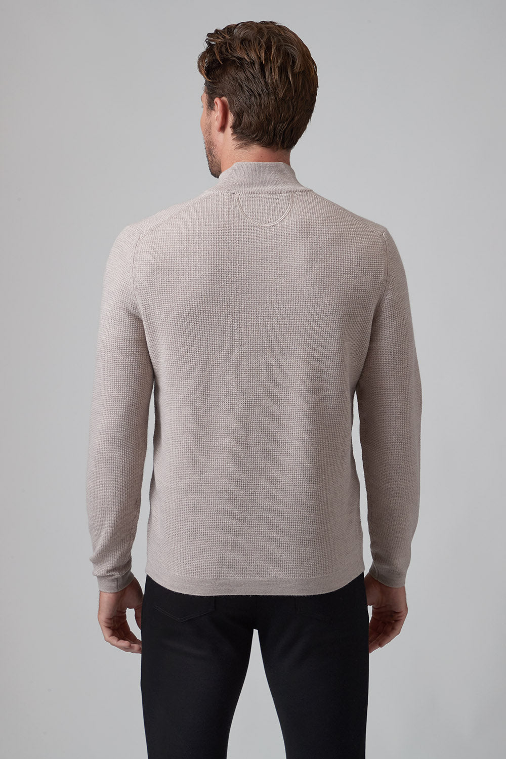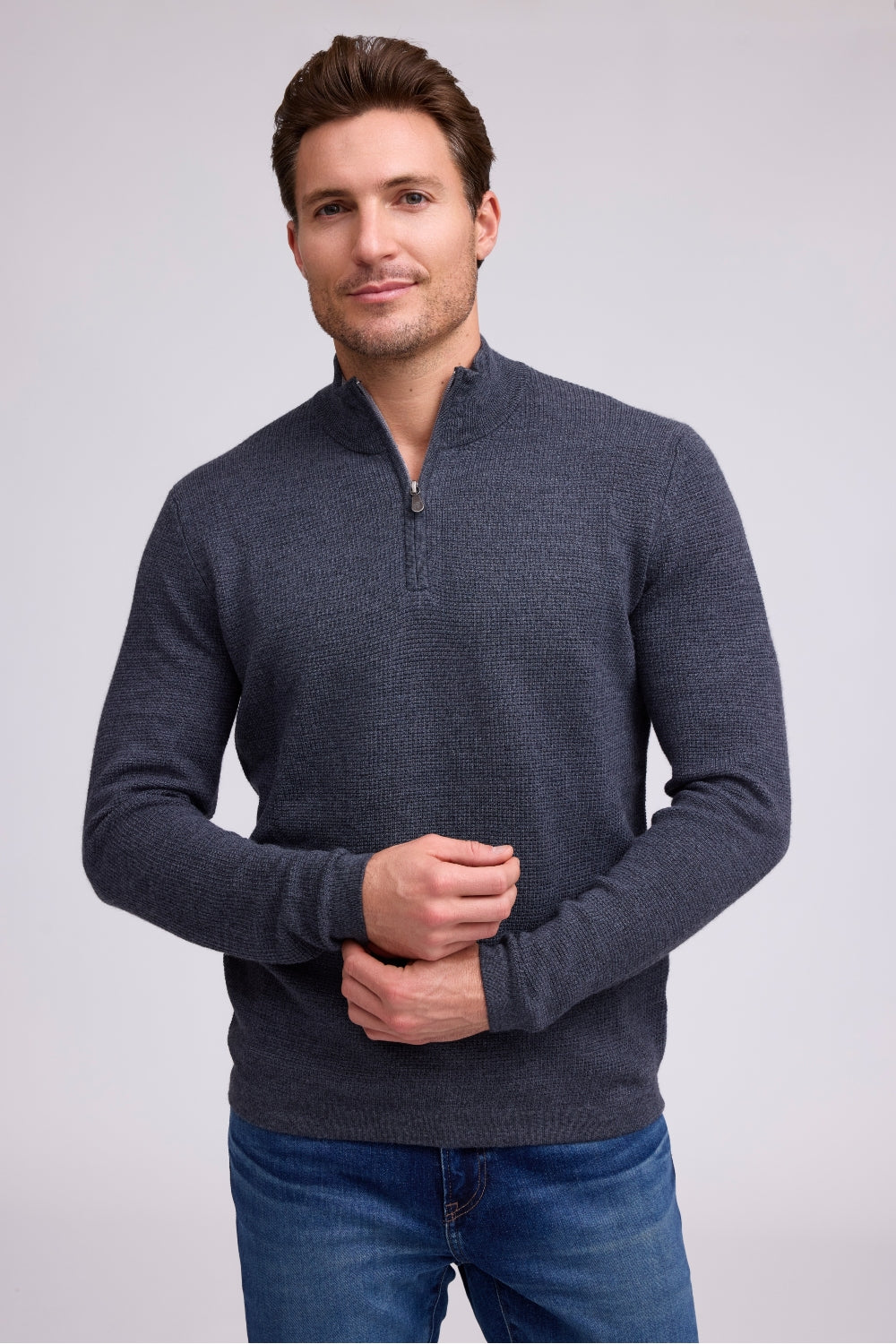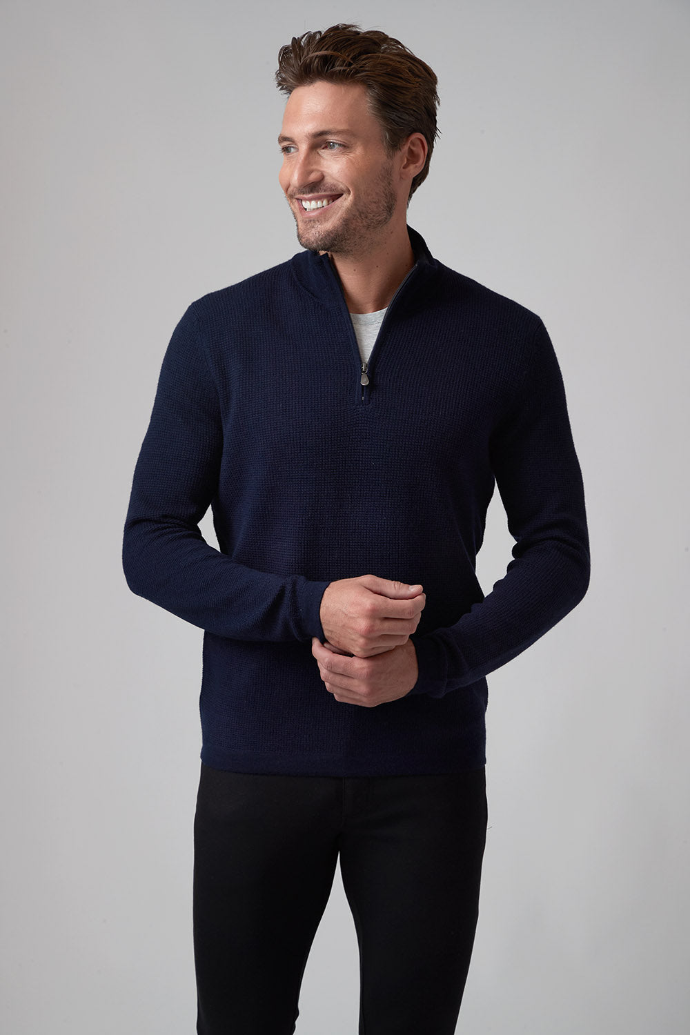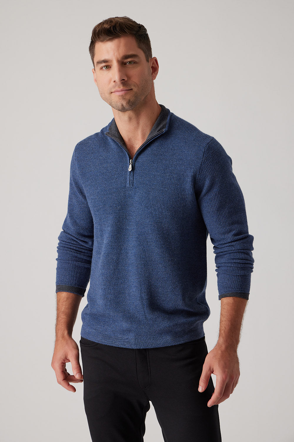 Our 100% Extrafine Merino Wool mock sweater is a perfect addition to your wardrobe. Waffle knit stitched for interesting texture in a medium weight, The Ian has full fashion detailing, with complementary color trim on the cuff, hem, and inside high-stand collar. Worn alone or layered over a tee or button-down, this classic sweater works at the office or out with friends.