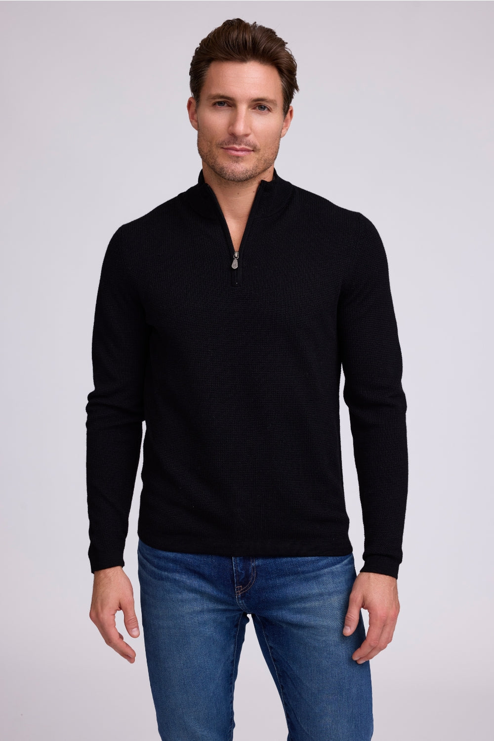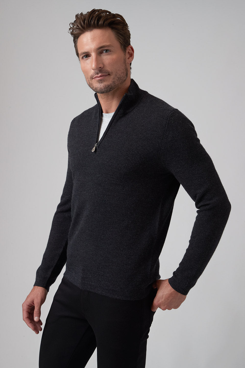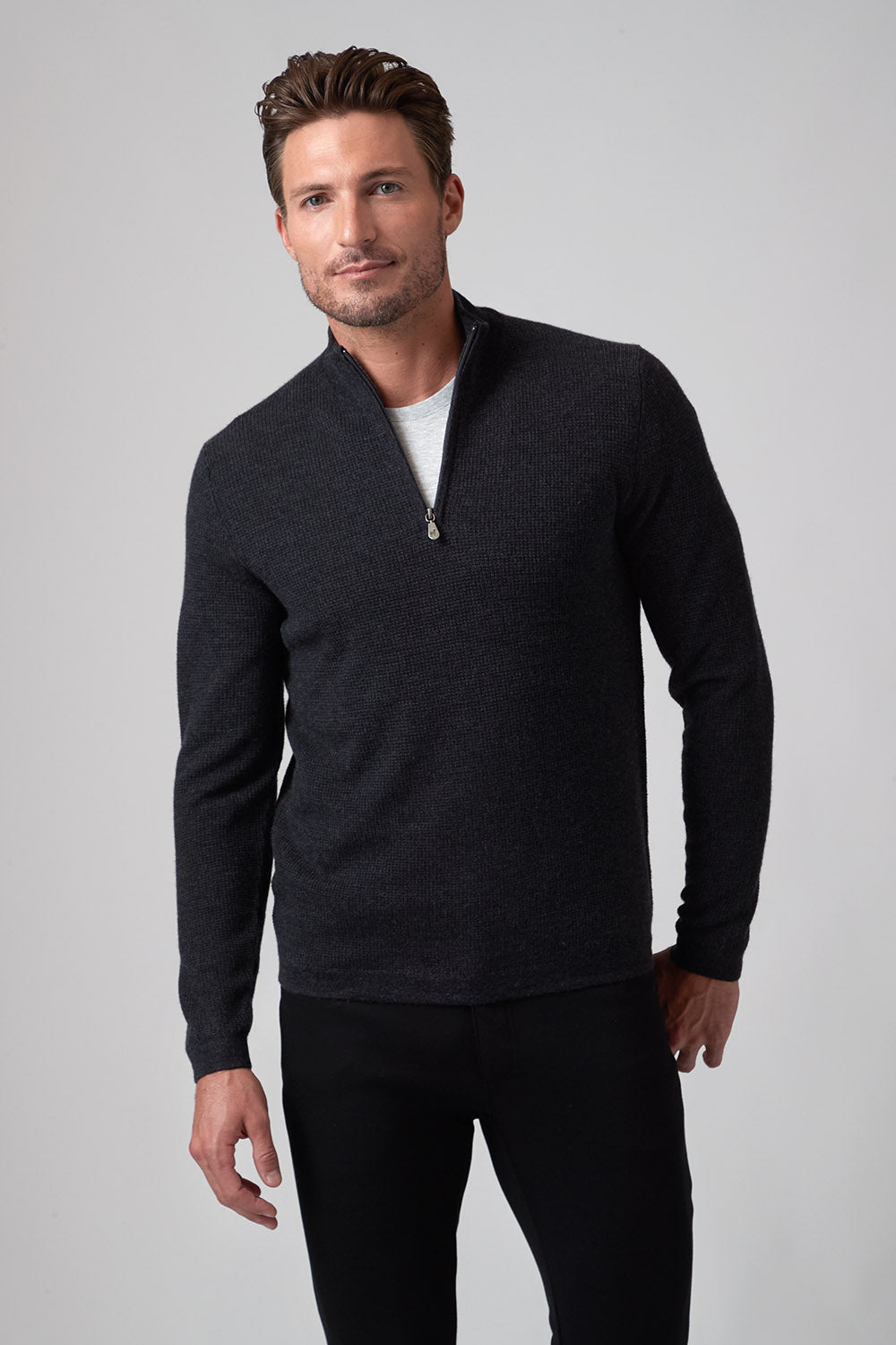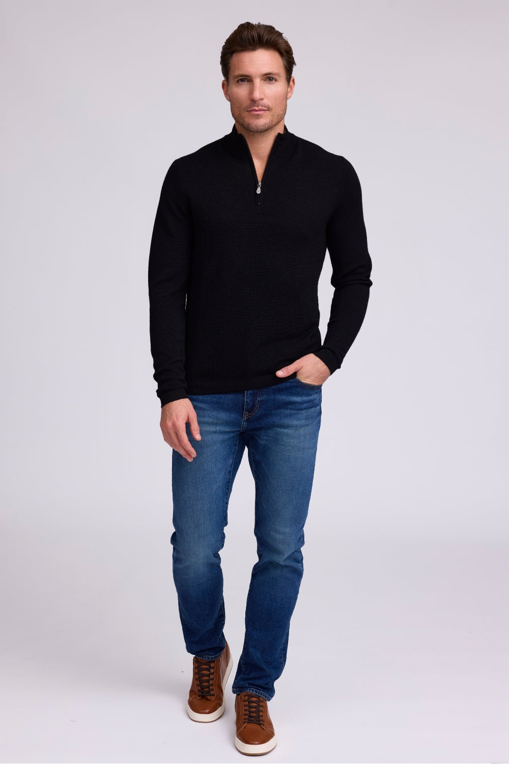 Our 100% Extrafine Merino Wool mock sweater is a perfect addition to your wardrobe. Waffle knit stitched for interesting texture in a medium weight, The Ian has full fashion detailing, with complementary color trim on the cuff, hem, and inside high-stand collar. Worn alone or layered over a tee or button-down, this classic sweater works at the office or out with friends.