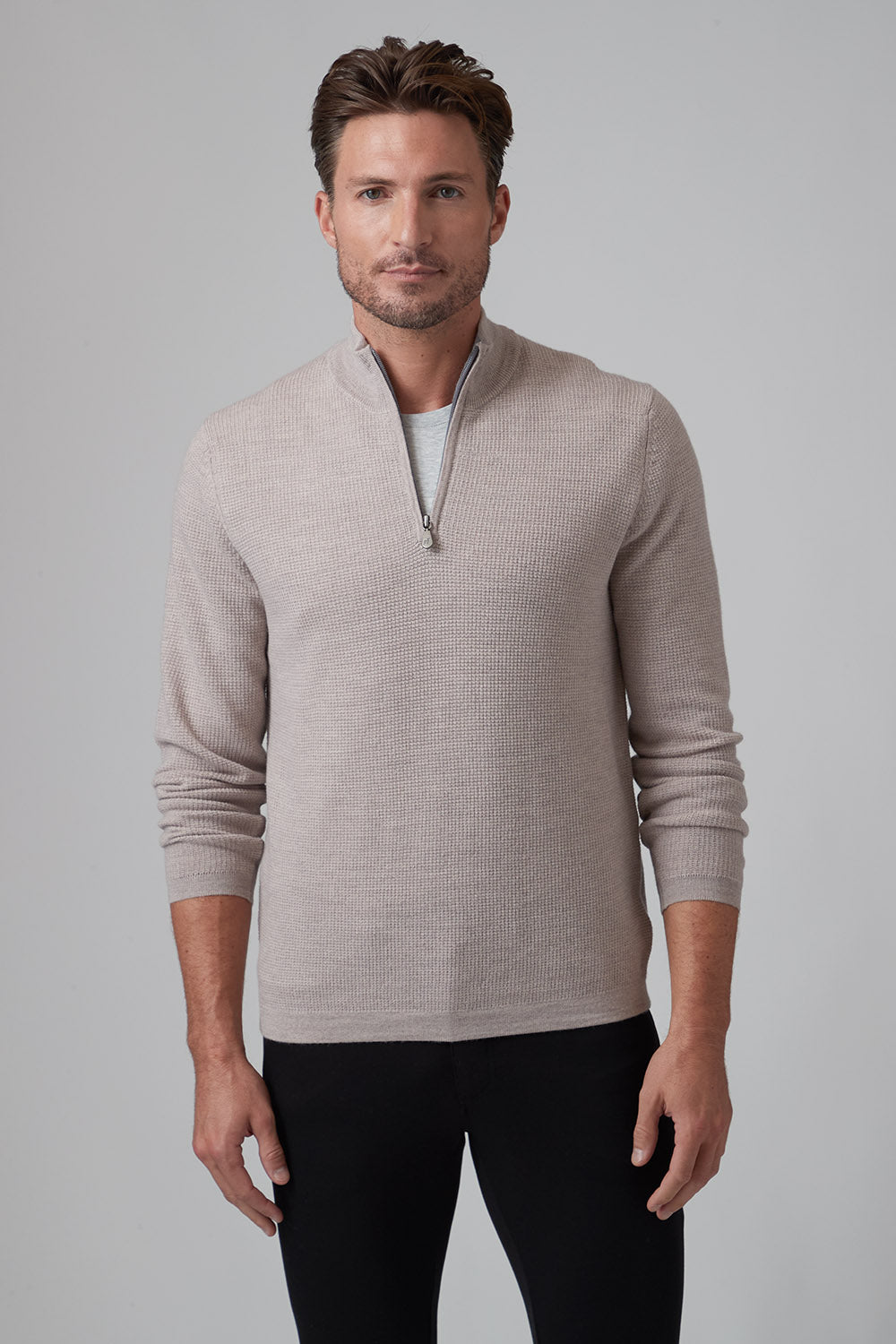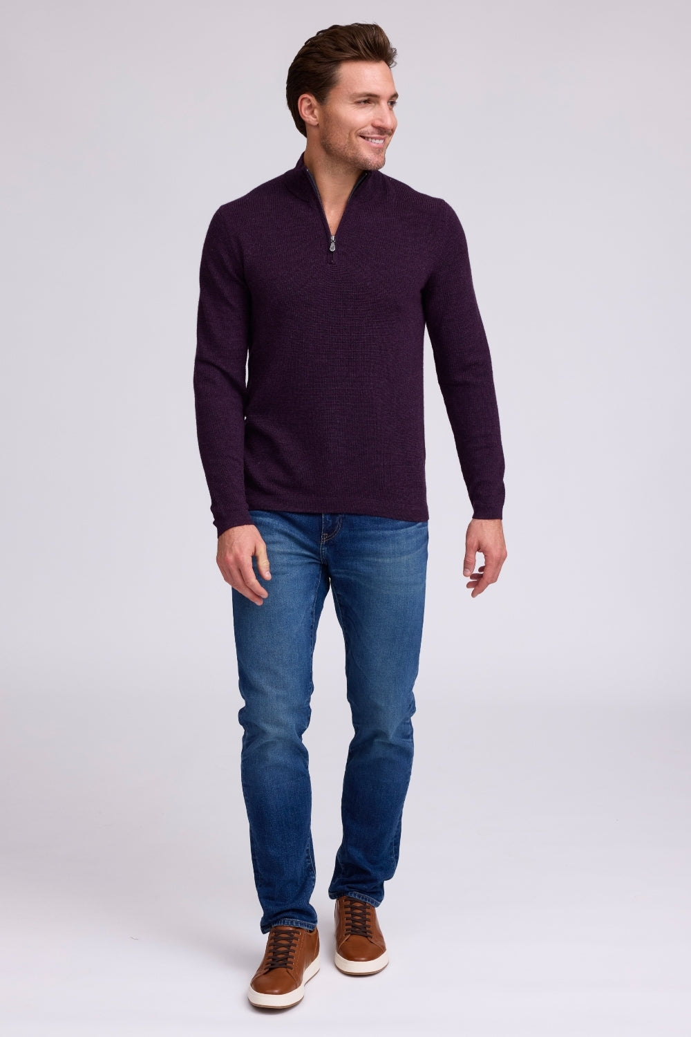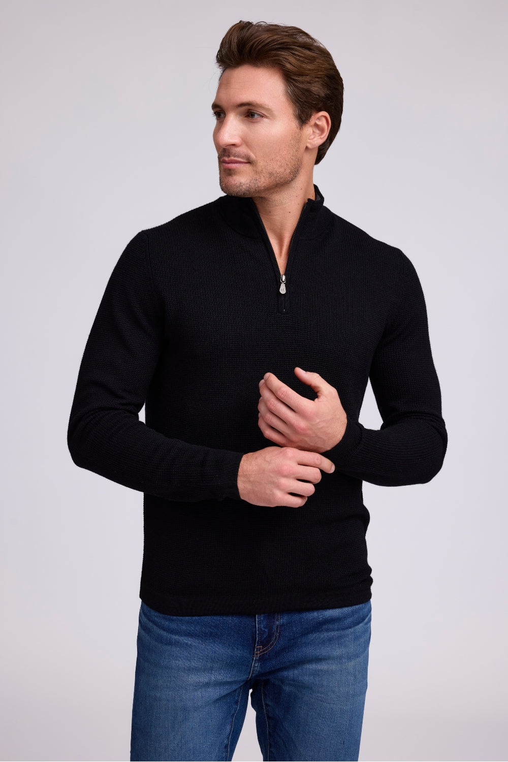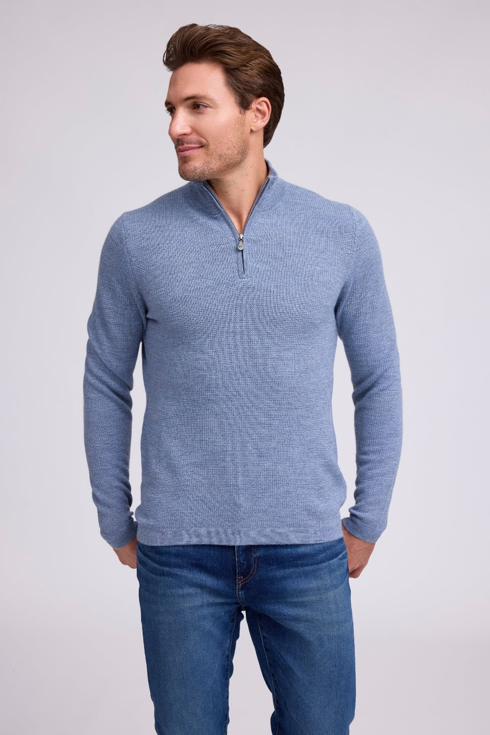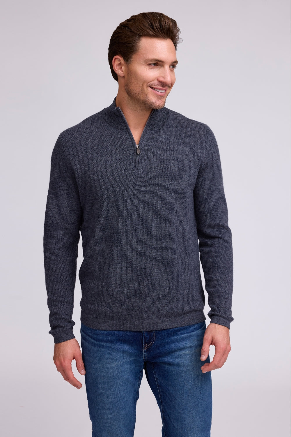 Our 100% Extrafine Merino Wool mock sweater is a perfect addition to your wardrobe. Waffle knit stitched for interesting texture in a medium weight, The Ian has full fashion detailing, with complementary color trim on the cuff, hem, and inside high-stand collar. Worn alone or layered over a tee or button-down, this classic sweater works at the office or out with friends.