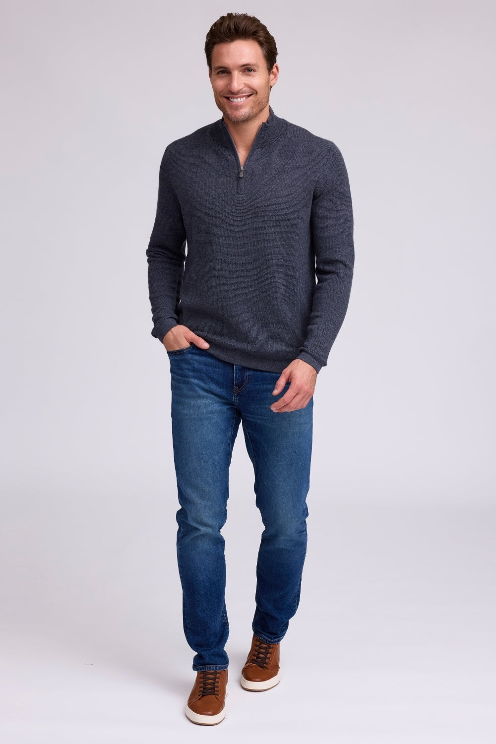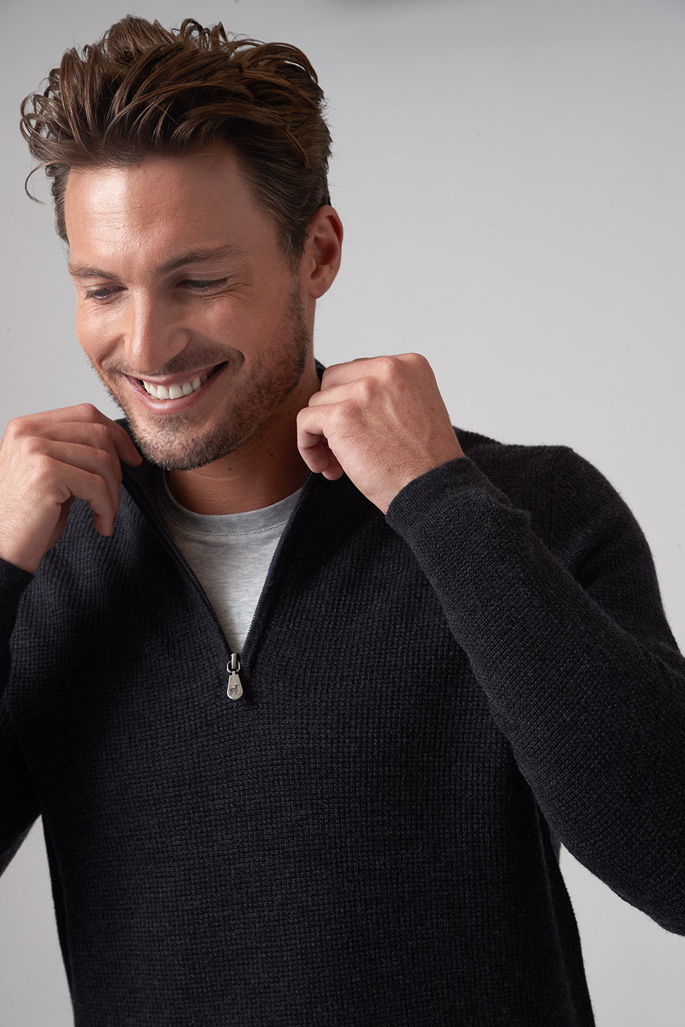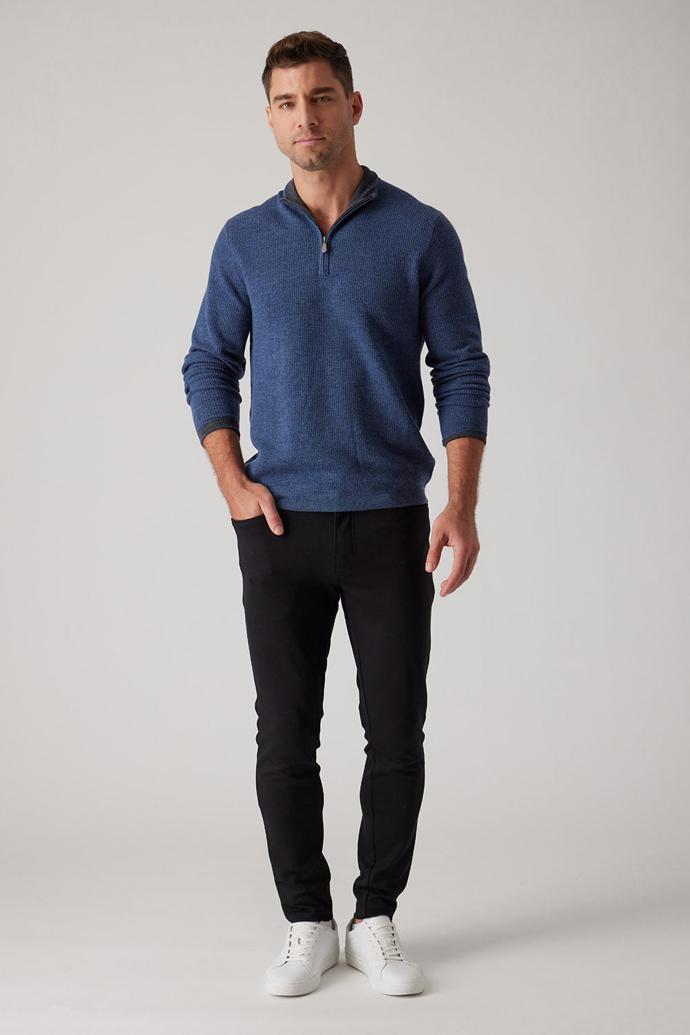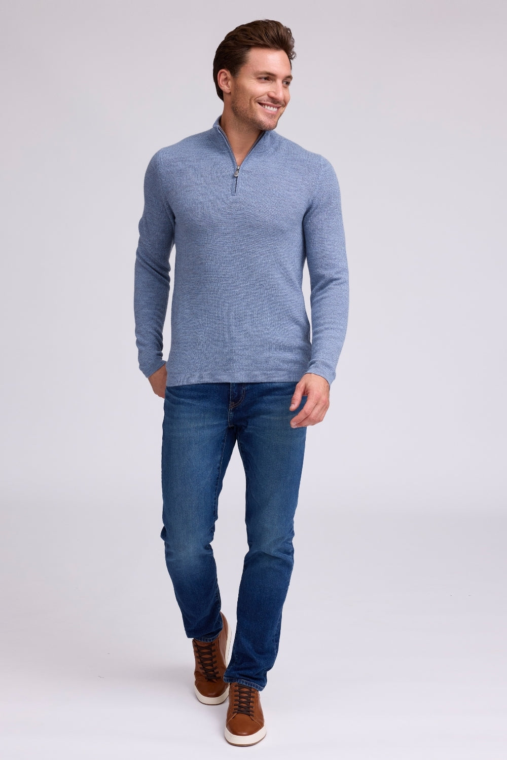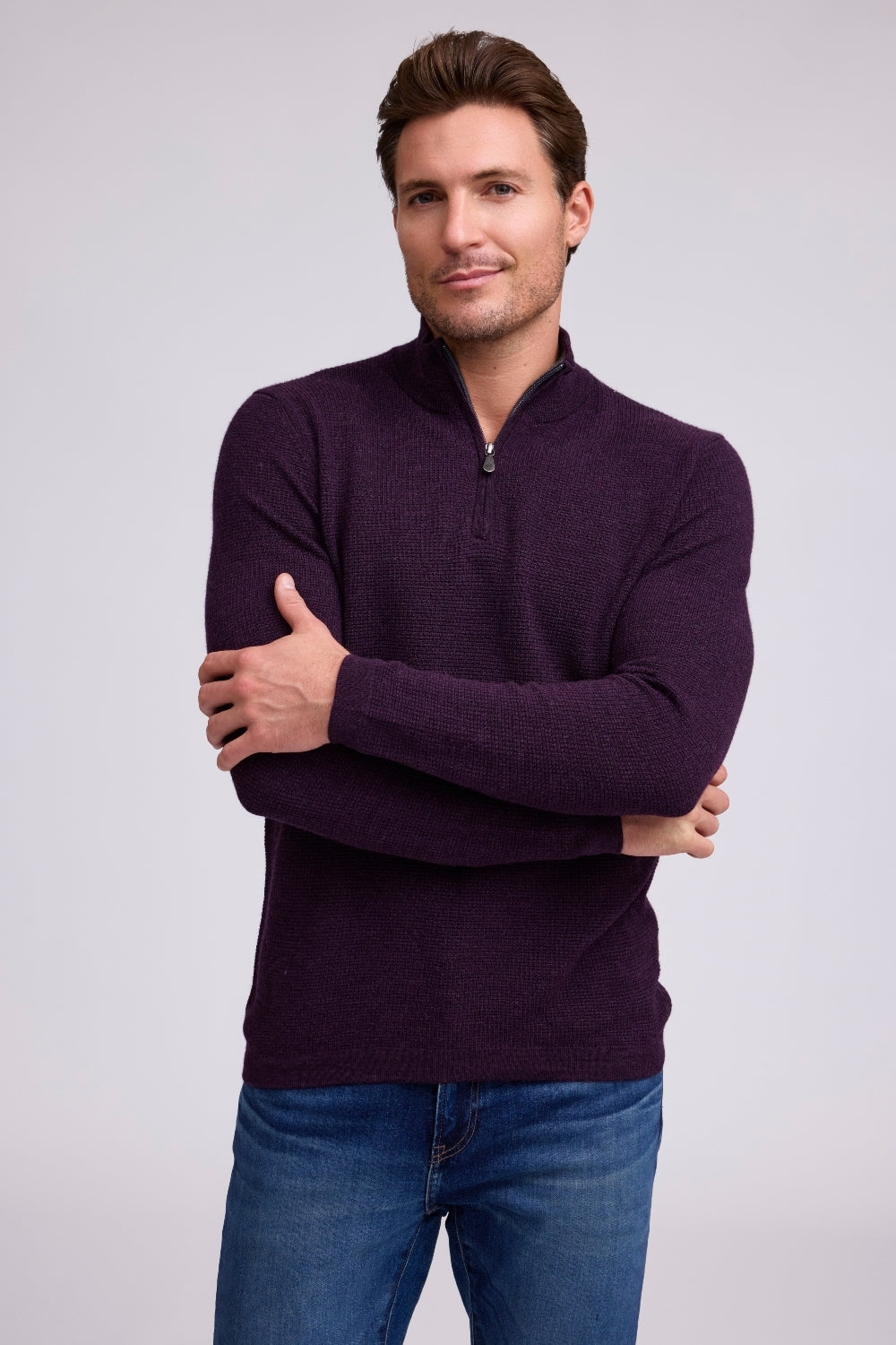 Our 100% Extrafine Merino Wool mock sweater is a perfect addition to your wardrobe. Waffle knit stitched for interesting texture in a medium weight, The Ian has full fashion detailing, with complementary color trim on the cuff, hem, and inside high-stand collar. Worn alone or layered over a tee or button-down, this classic sweater works at the office or out with friends.