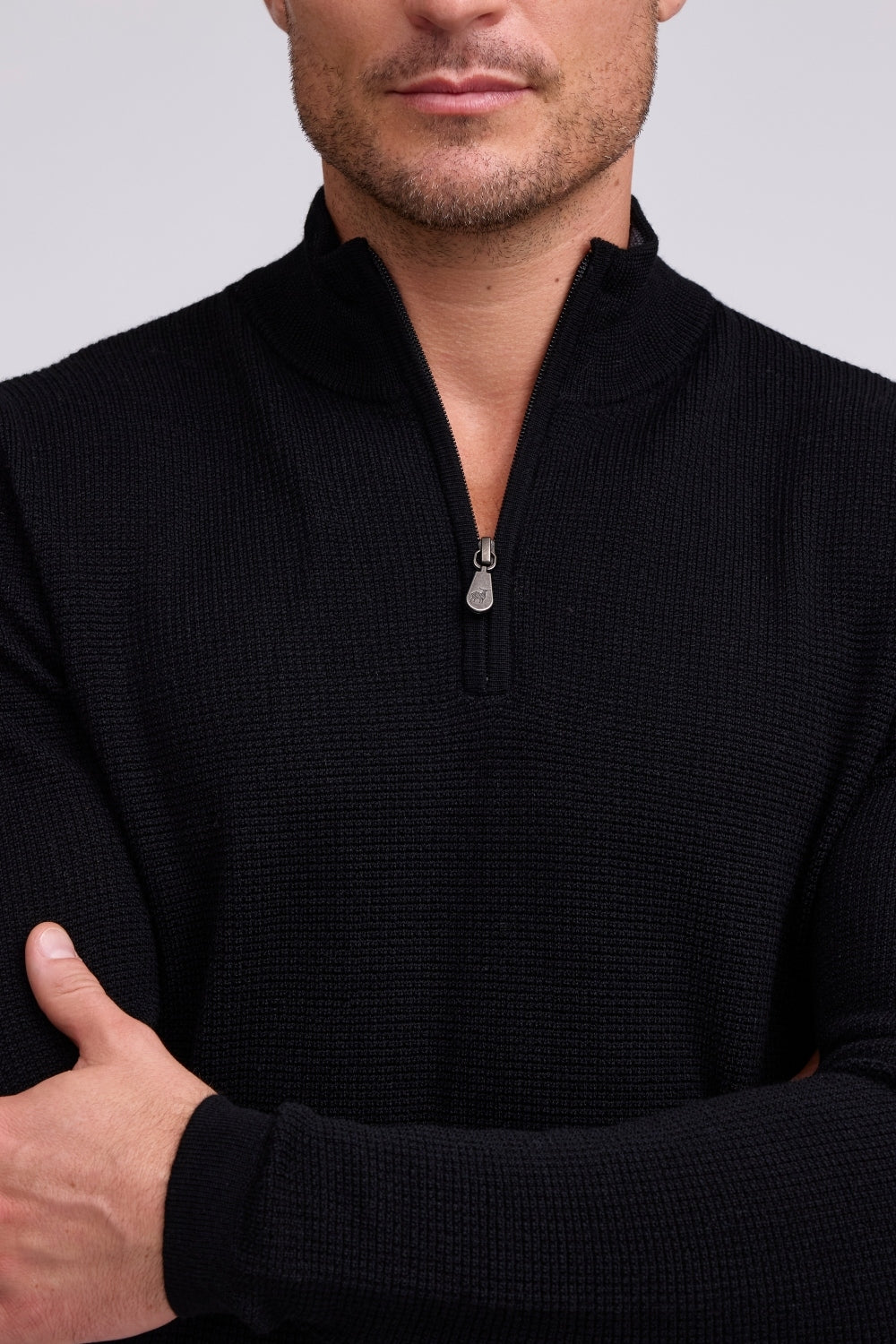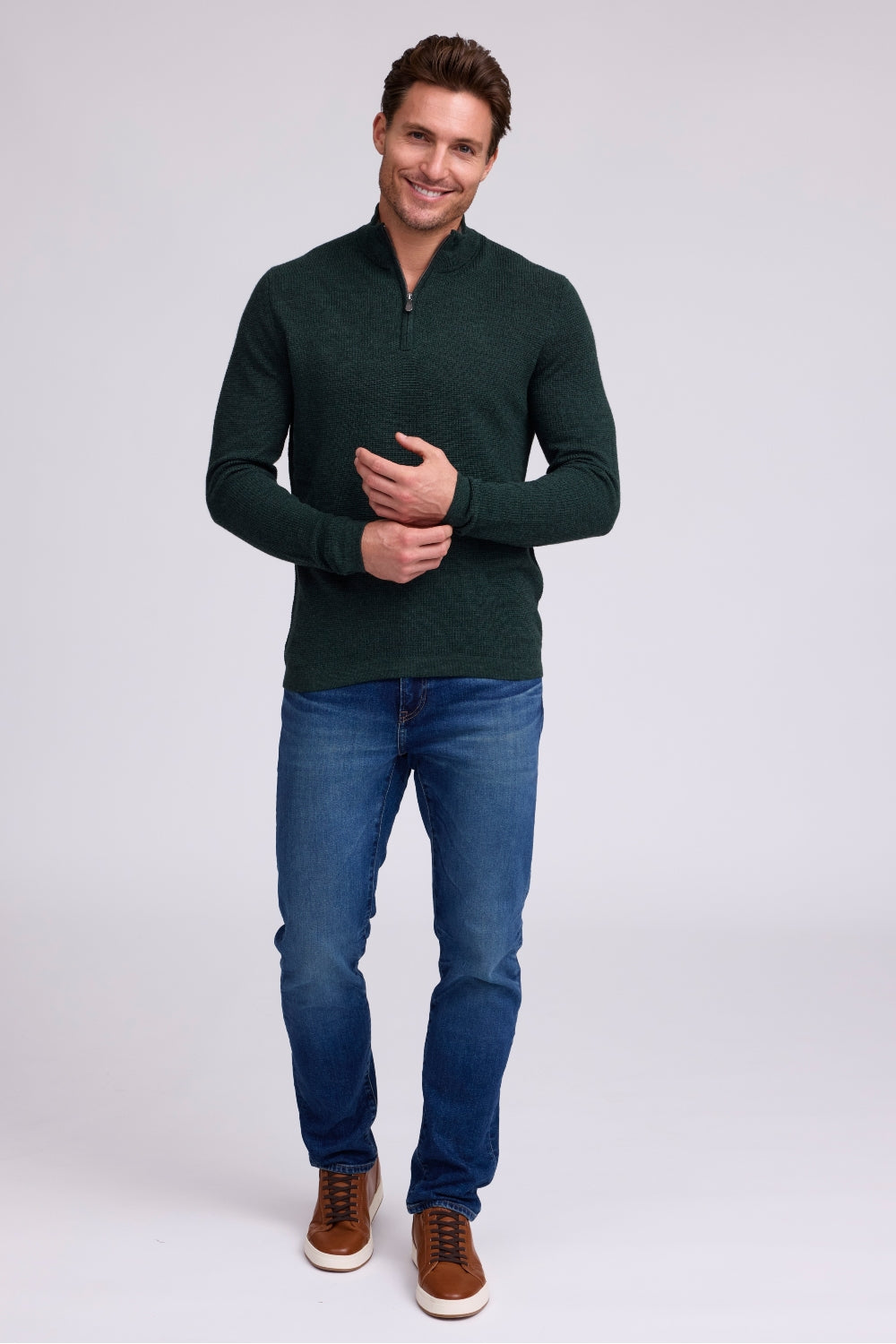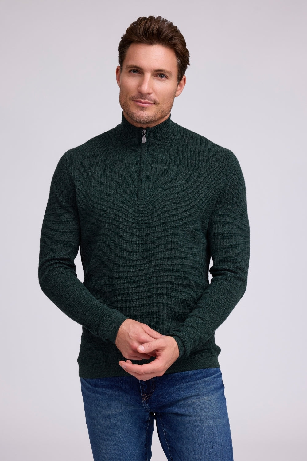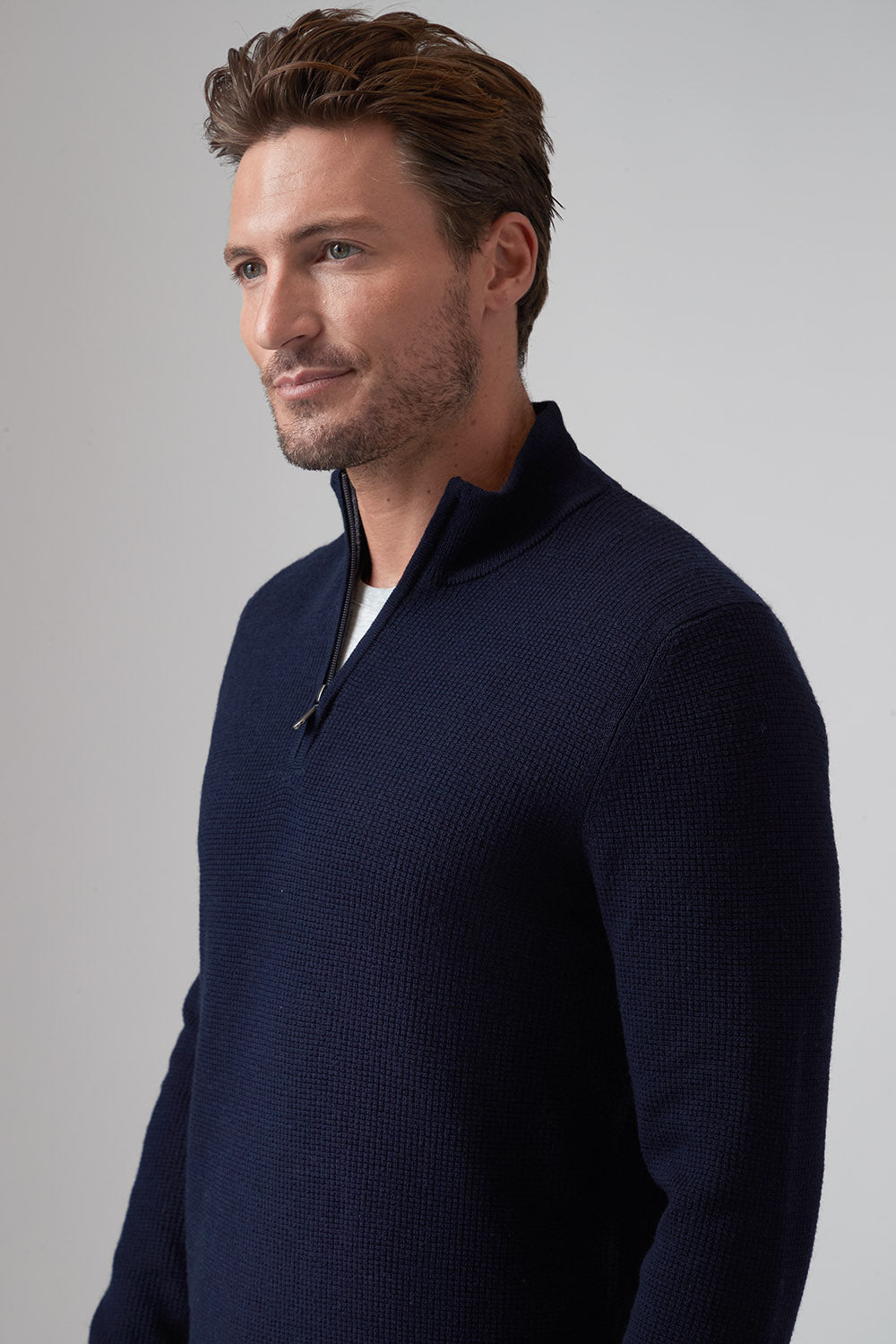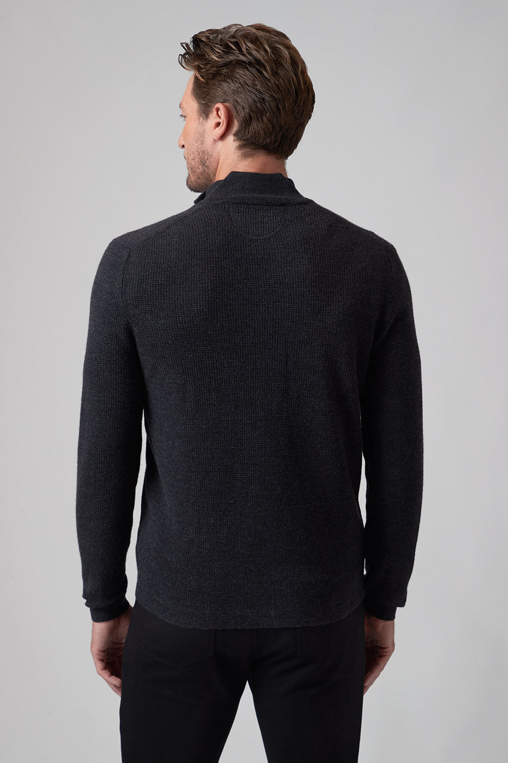 Our 100% Extrafine Merino Wool mock sweater is a perfect addition to your wardrobe. Waffle knit stitched for interesting texture in a medium weight, The Ian has full fashion detailing, with complementary color trim on the cuff, hem, and inside high-stand collar. Worn alone or layered over a tee or button-down, this classic sweater works at the office or out with friends.