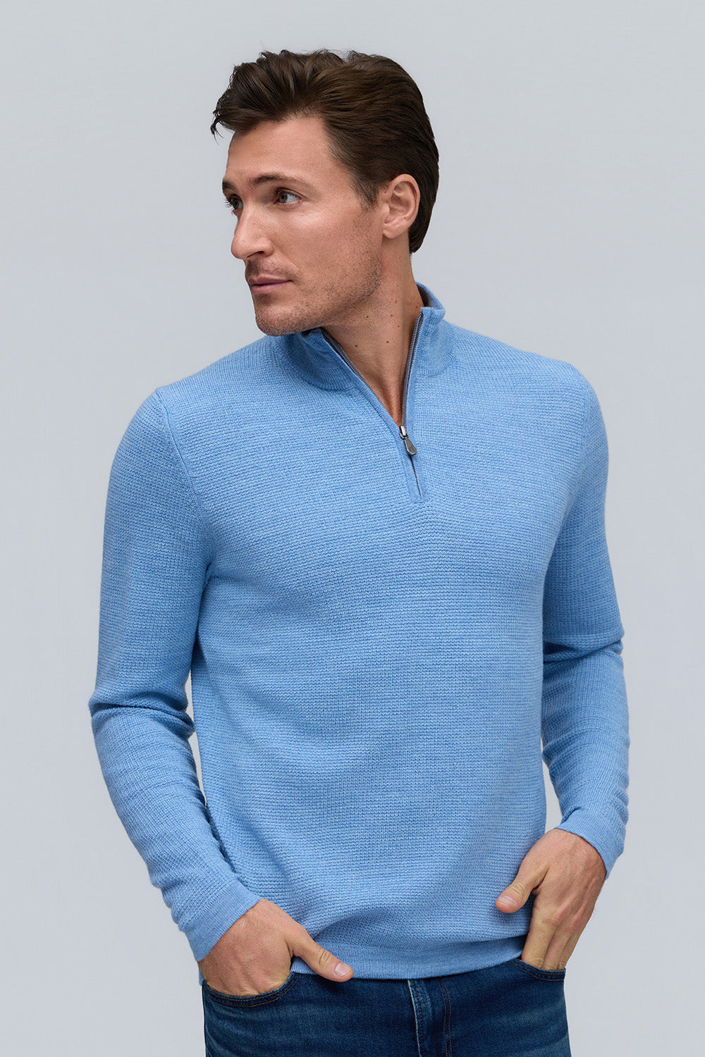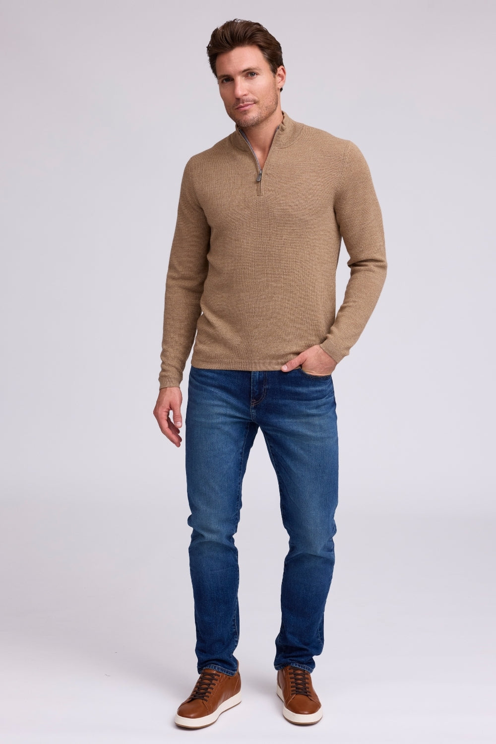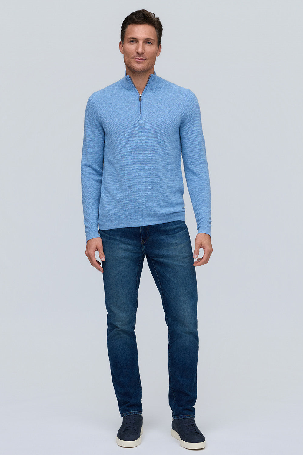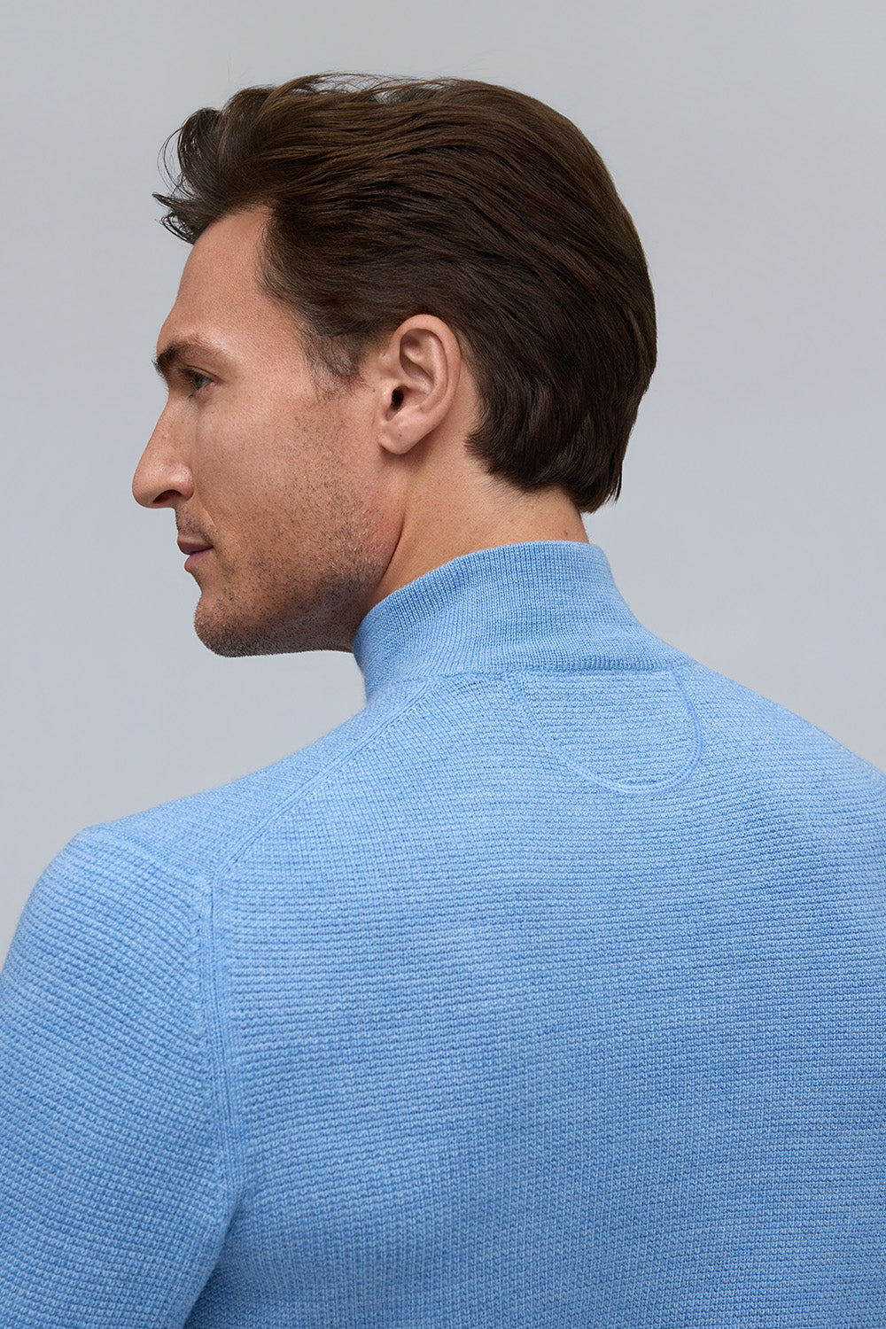 Our 100% Extrafine Merino Wool mock sweater is a perfect addition to your wardrobe. Waffle knit stitched for interesting texture in a medium weight, The Ian has full fashion detailing, with complementary color trim on the cuff, hem, and inside high-stand collar. Worn alone or layered over a tee or button-down, this classic sweater works at the office or out with friends.